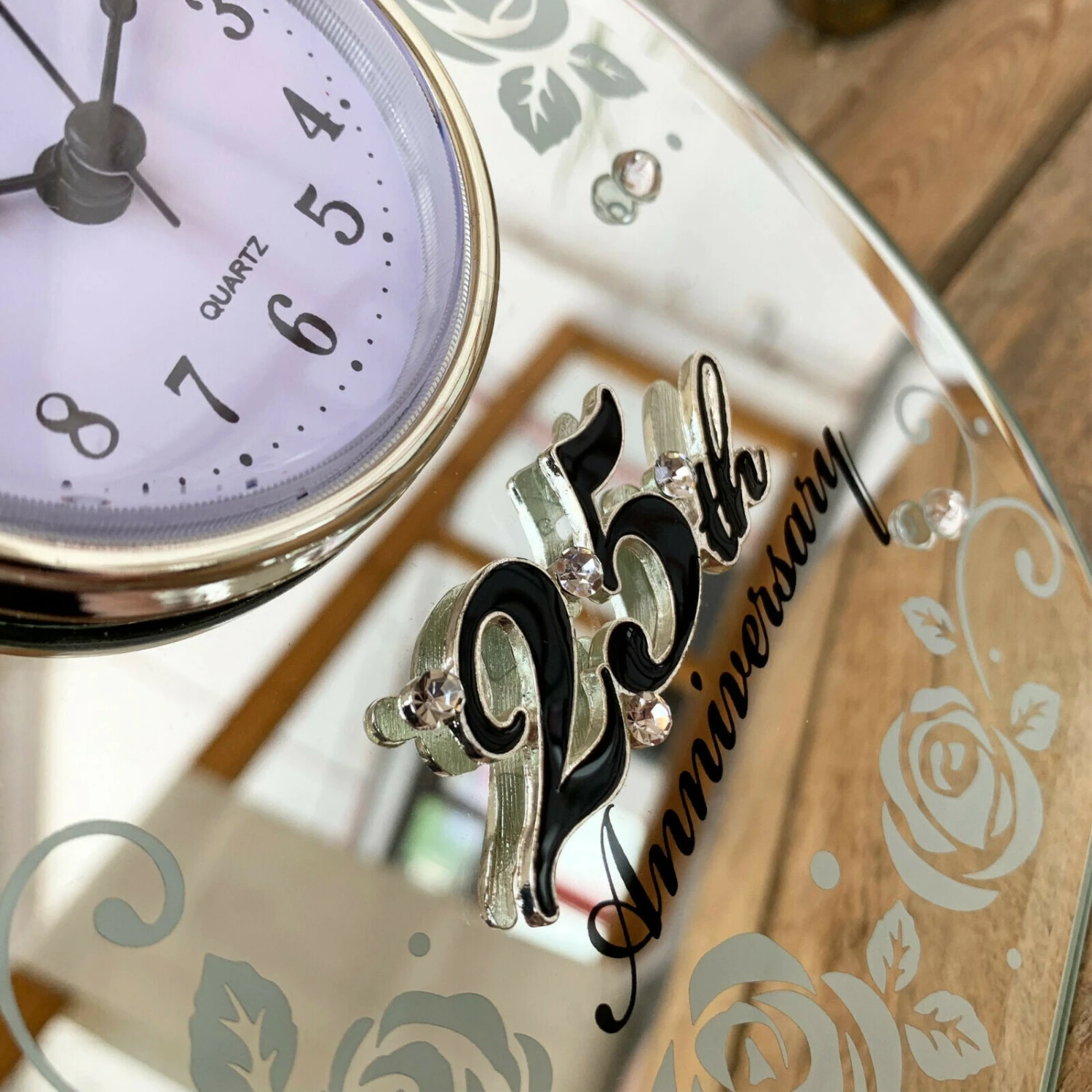 This product is a beautiful gift for your close loved ones celebrating their 25th silver wedding anniversary. Made from mirrored glass and freestanding, the product comes with a printed floral pattern around the side with coloured pearls scattered around the face.