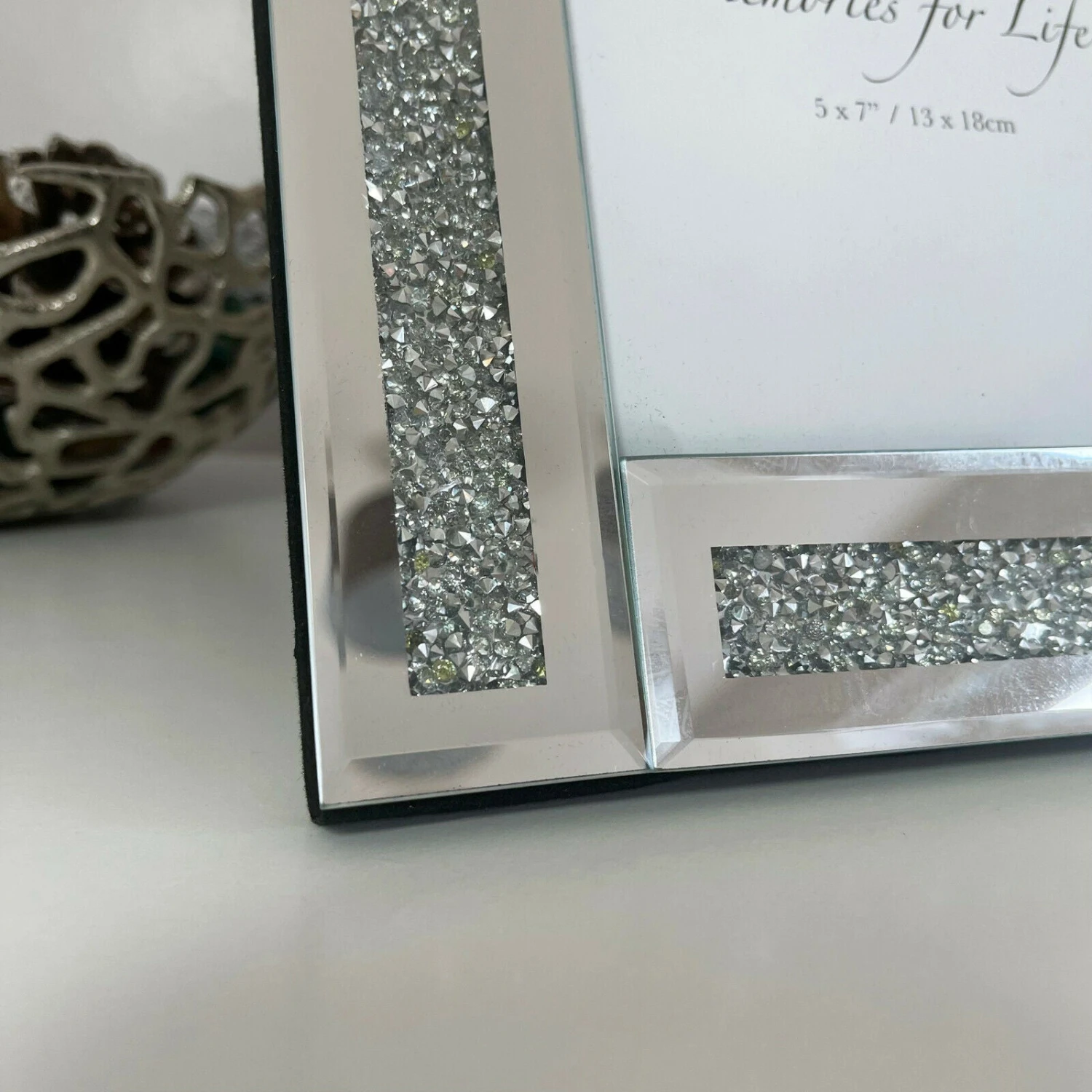 Stunningly elegant freestanding, crushed diamond, sparkly diamante chrome mirrored photo frames, made from glass. Single photo capacity. Rectangular photo picture frame. Perfect gift to give a loved one with a personal photograph inside! Available in: 5×7″. Perfect for the home or bedroom.