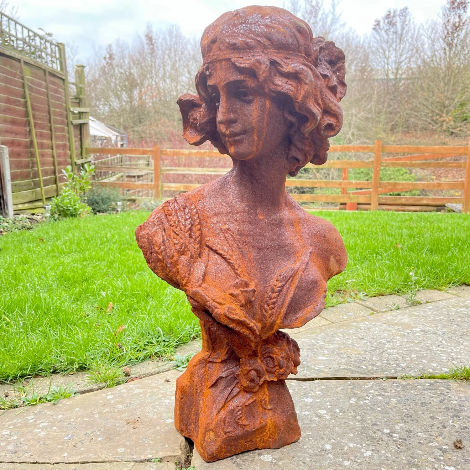 Stunning antique effect art nouveau lady bust. This piece has a rusted finish and comes on a square stand. The statue weighs 35kg and would look great as a centrepiece in your front or back garden.