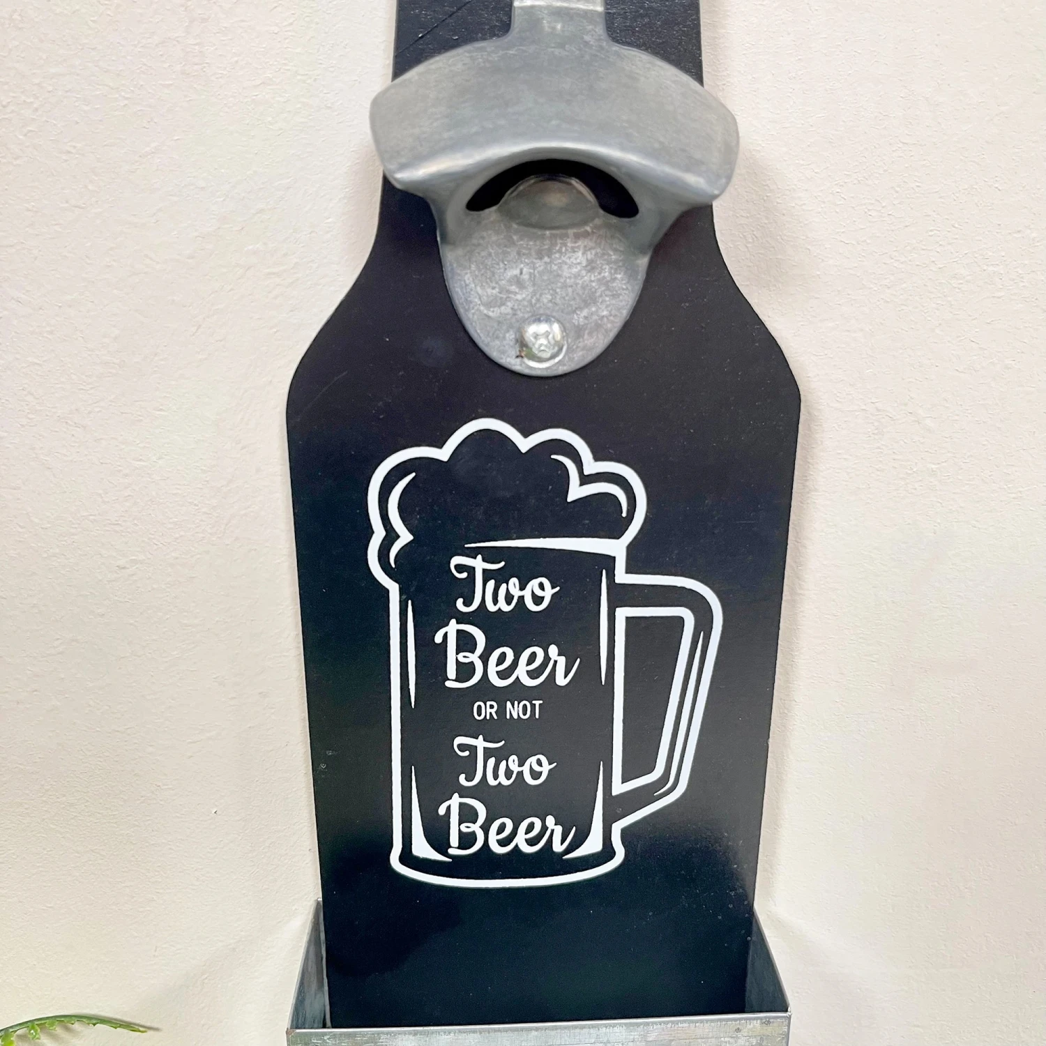 This novelty item allows you to open your beer and collect your tops too. Its a great tool for recycling. Text reads ‘Two Beer Or Not Two Beer’.