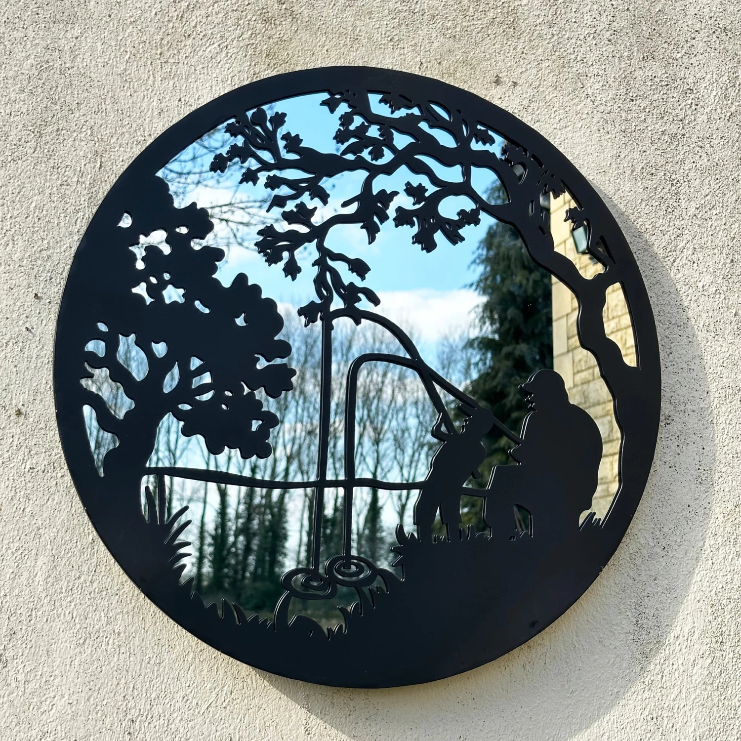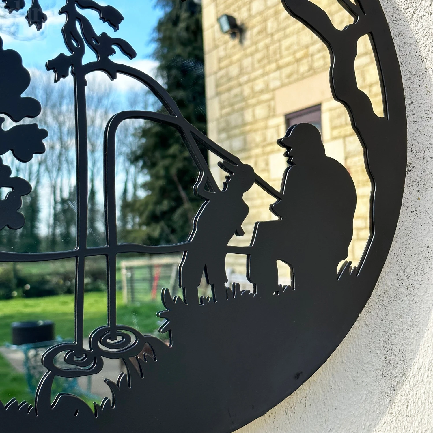 Simple yet elegant, this mirrored wall art featuringa fishing father and son has been designed with a black frame to create a silhouette illusion. Suitable for indoor and outdoor use, this metal framed fishing wall art will bounce light around any space, making the space seem bigger. Keyhole hook on the back to hang easily. Perfect as a Fathers Day gift.