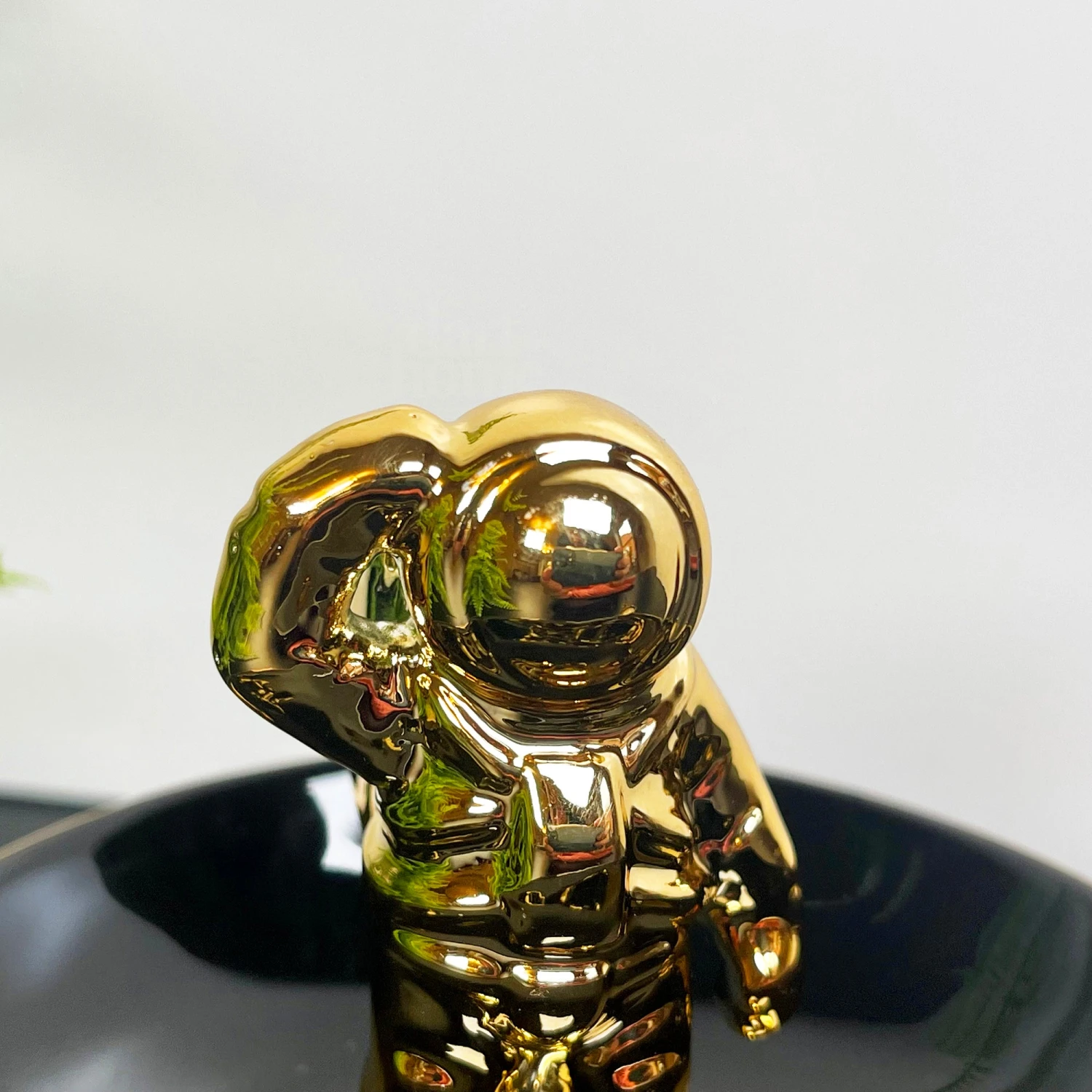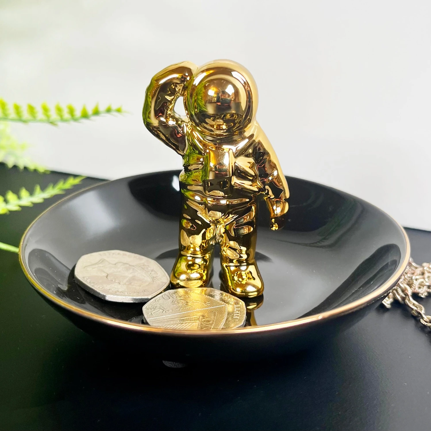 A beautiful small deep trinket dish made from ceramic with a saluting chrome gold spaceman in the centre, ideal for storing small jewellery items.