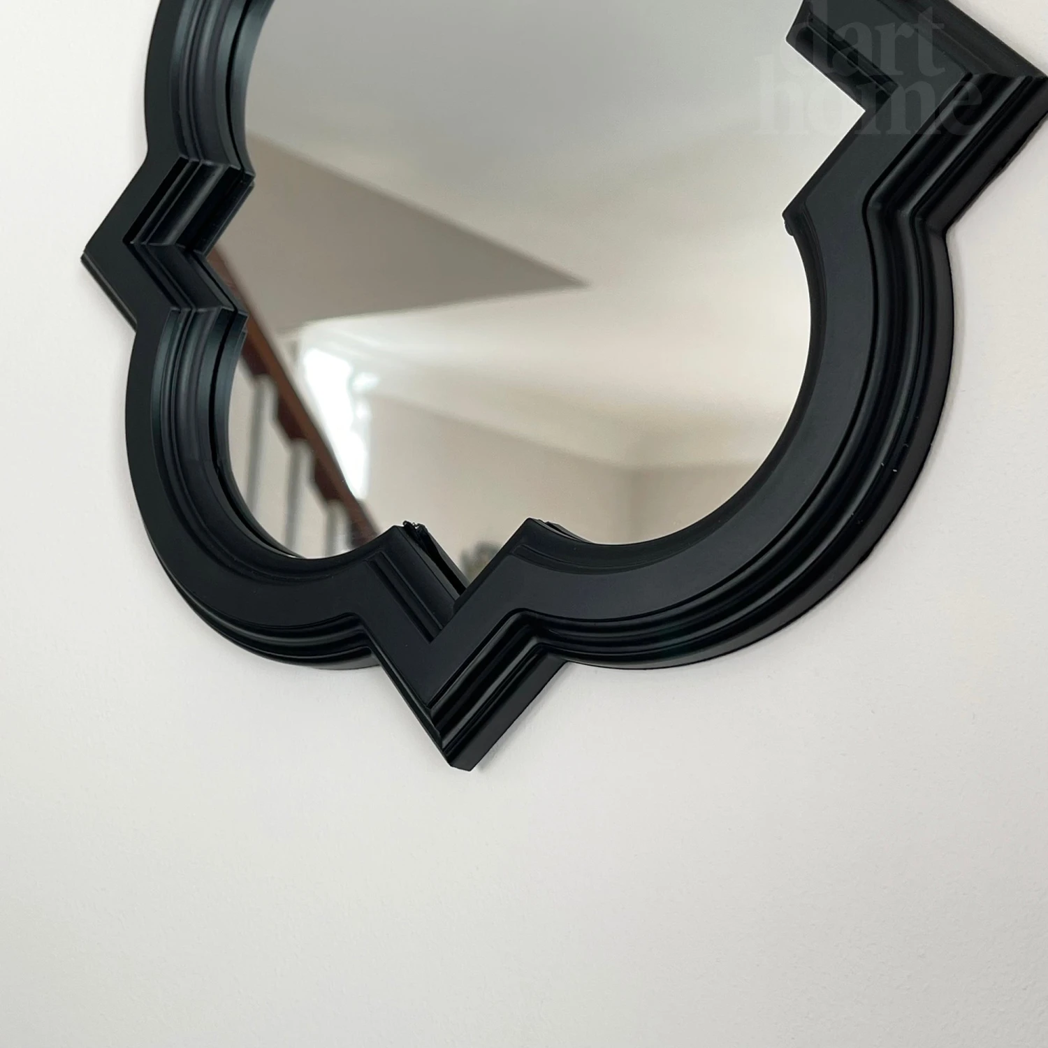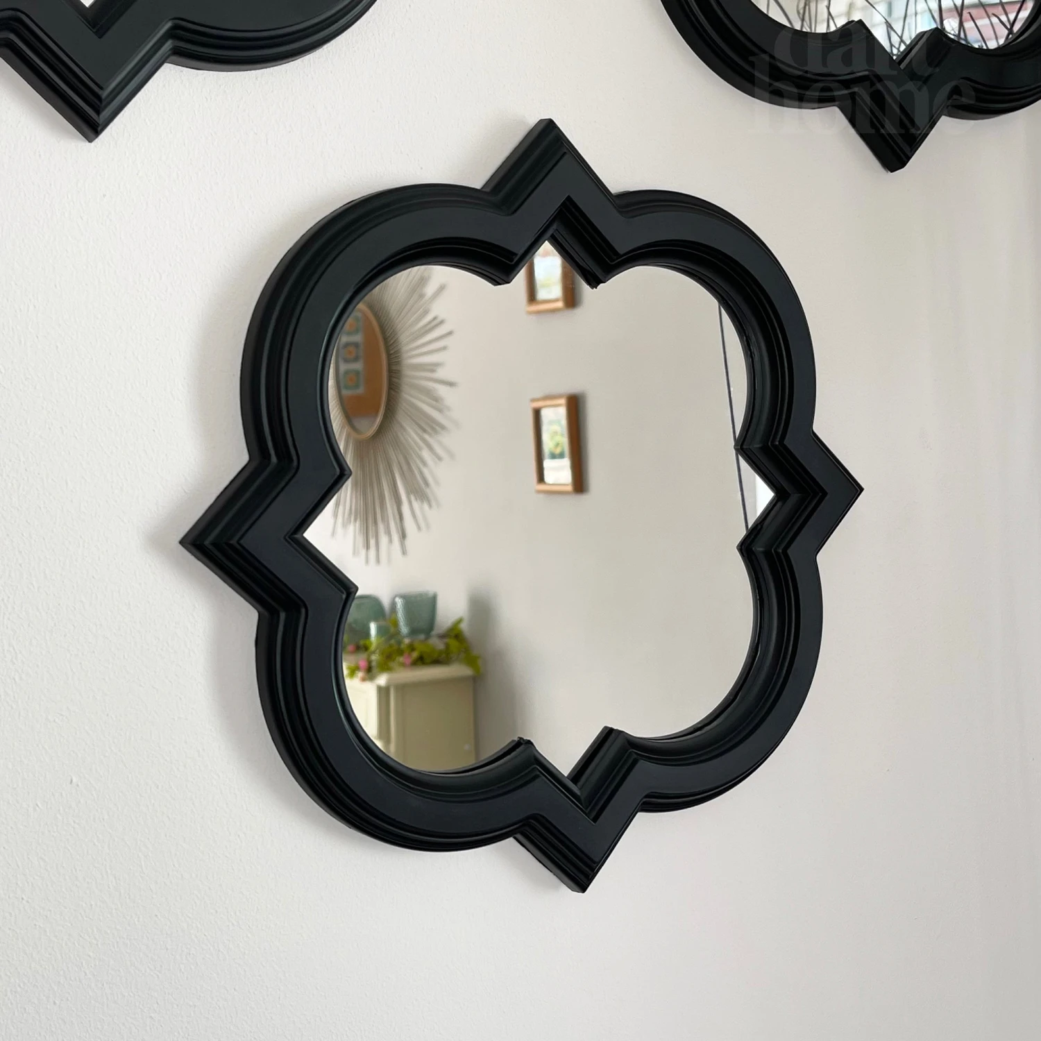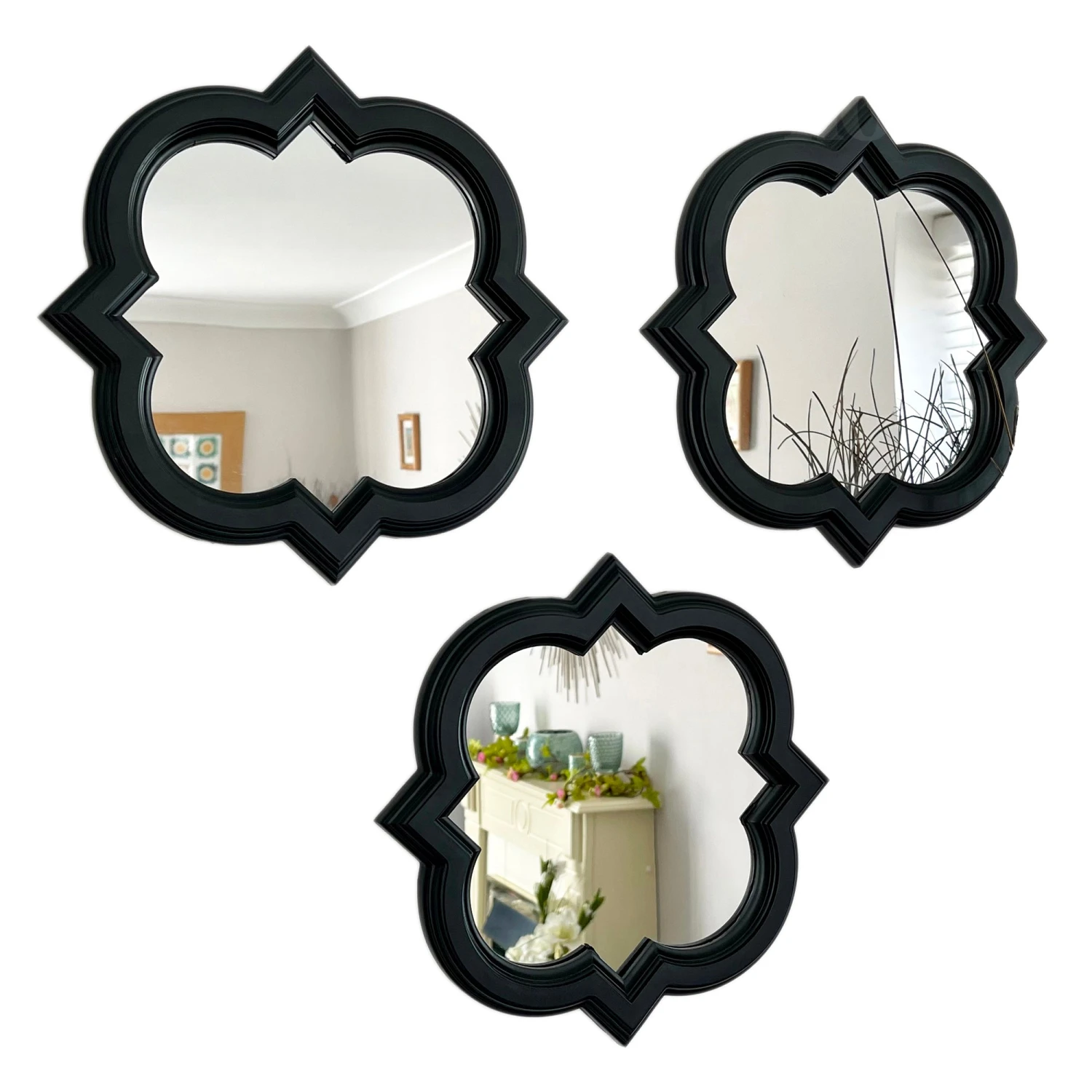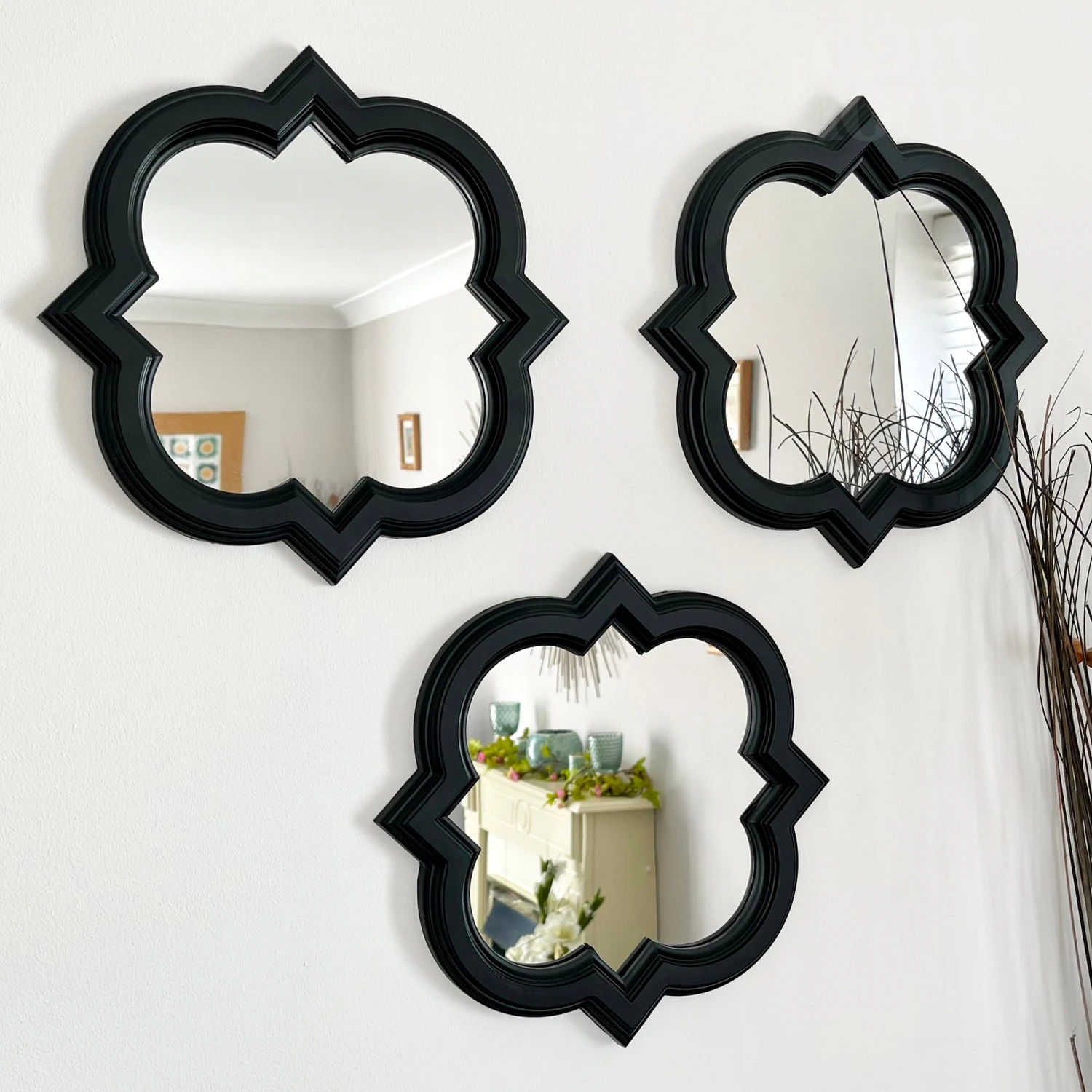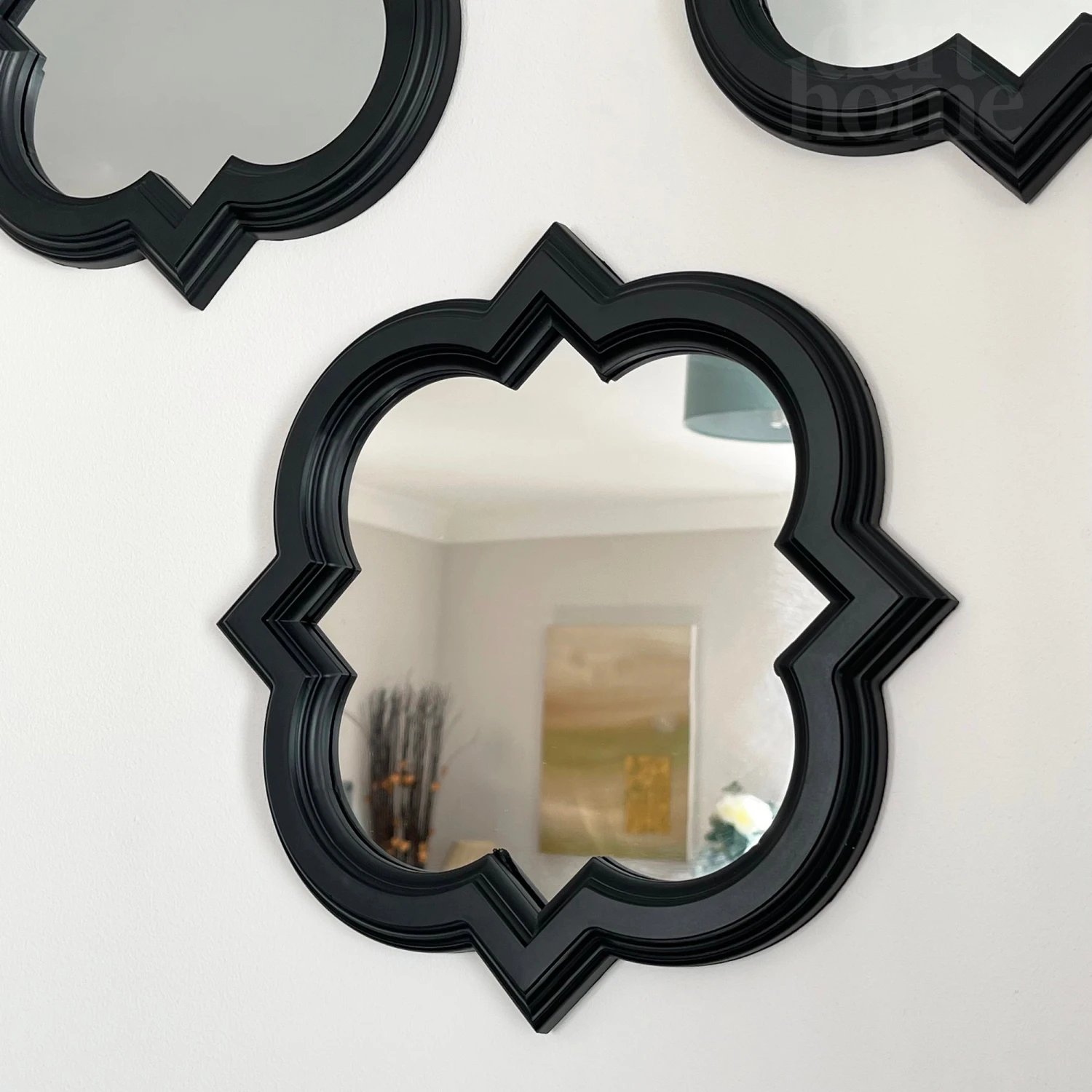 Set of 3 individual mirrors in a quarterfoil design. With strong plastic frames and a dark matt black finish, these moroccan inspired wall mounted mirrors will offer a striking colour contrast on a light coloured wall, enhancing the area immediately. Perfect for hallway or living room decoration to fill a large empty space.