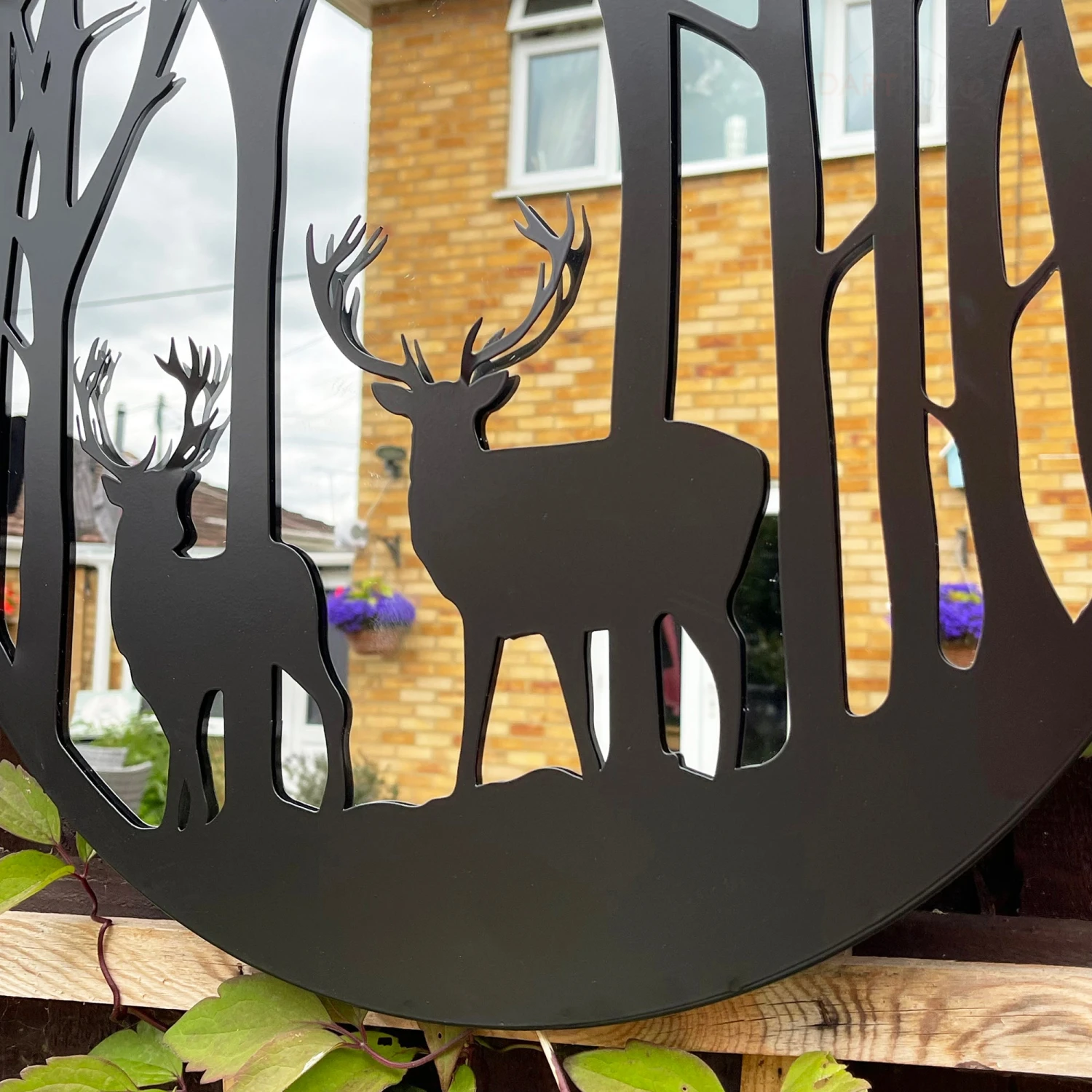 This round contemporary wall mounted mirror is suitable for indoor and outdoor use. Its frame is made from metal in a deep black finish, in a forest setting with standing stags giving a silhouette style look.