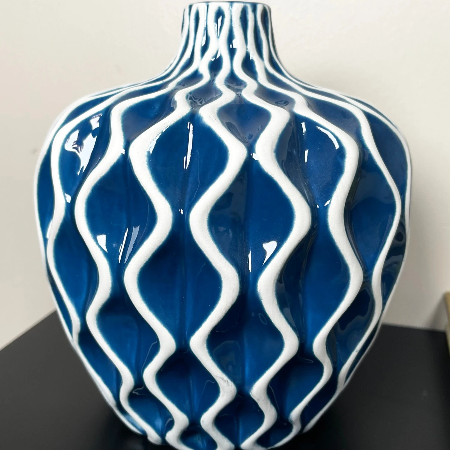 Add an abstract touch into your home with this mesmerising deep blue vase with unglazed contrasting white ripple pattern for decoration. This artistic bottle vase is perfect for flower buds and stems as well as looking elegant empty in a display.