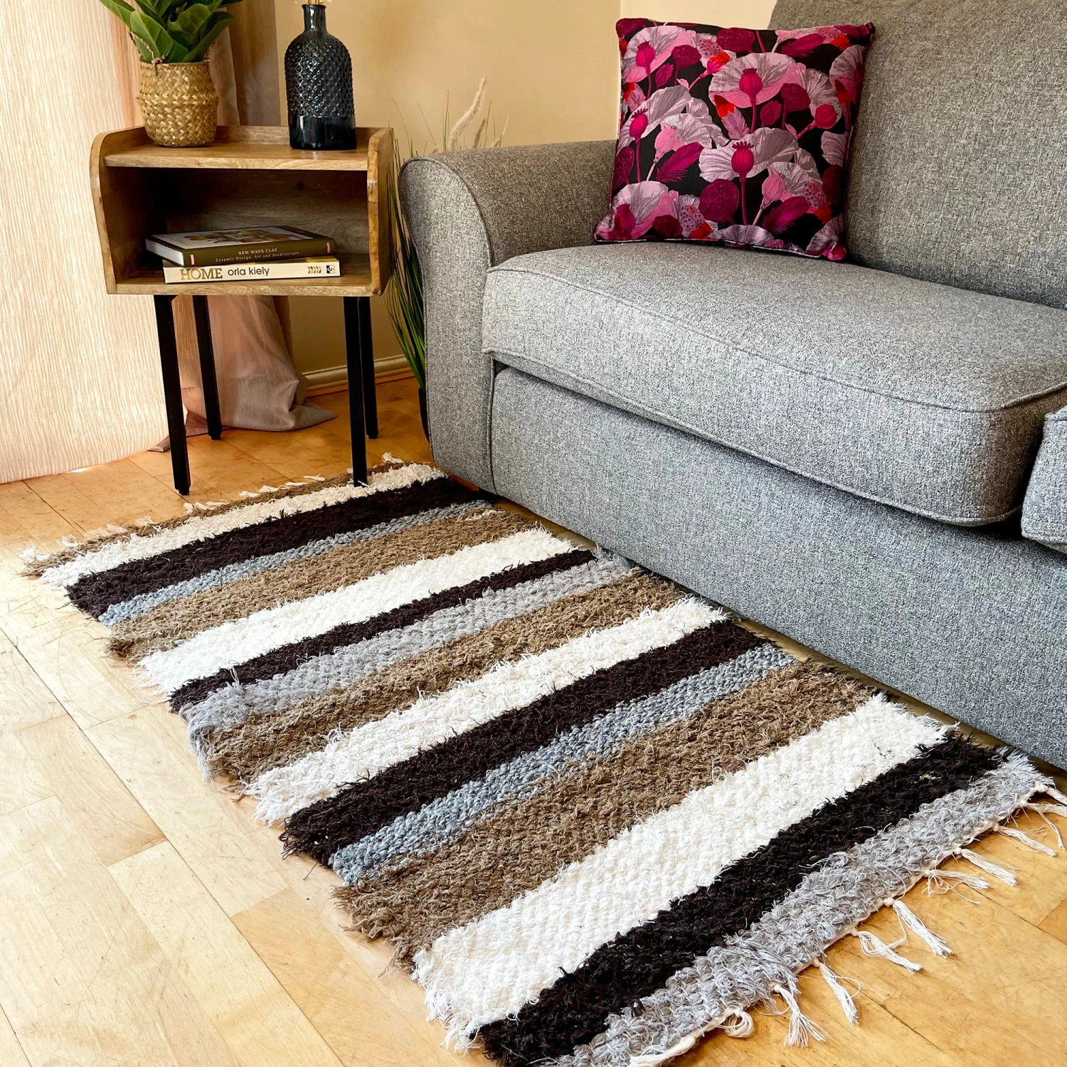 This 65x130cm shaggy area rug will fill your living room floor with neutral colour and traditional style. Made from recycled cotton, this floor rug offers a warm homely feel wherever it is placed. Its softness offers a relaxing feel underfoot. Perfect for living rooms and bedrooms to fill an open space.