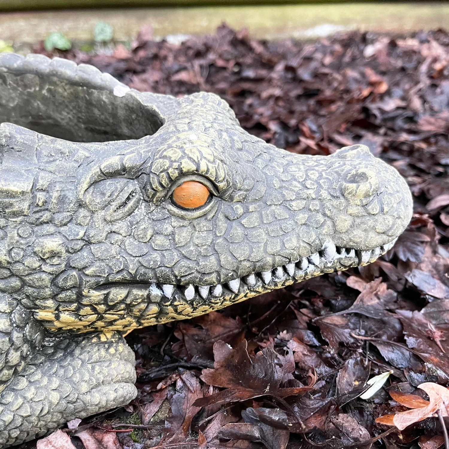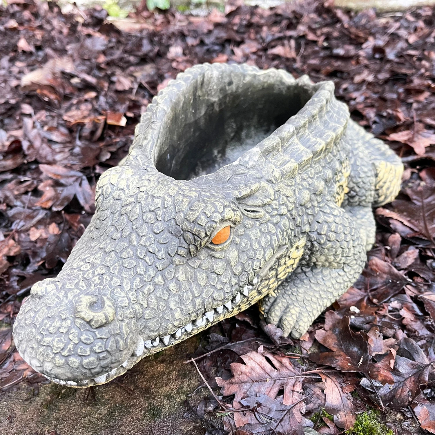 Outdoor cement planter in a heavy duty green Crocodile design. This reptile themed flower pot has an oval space to hold your favourite herbs or flowers and has a drainage hole. It is a great gift idea for a lizard loving friend.