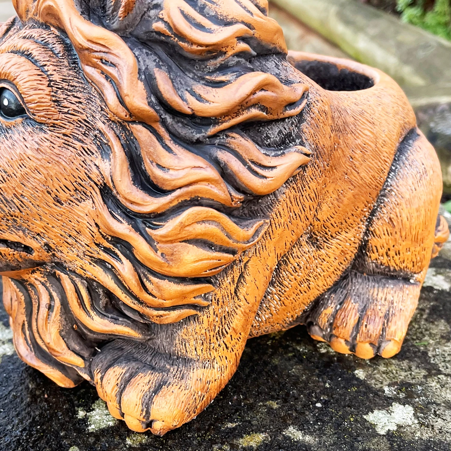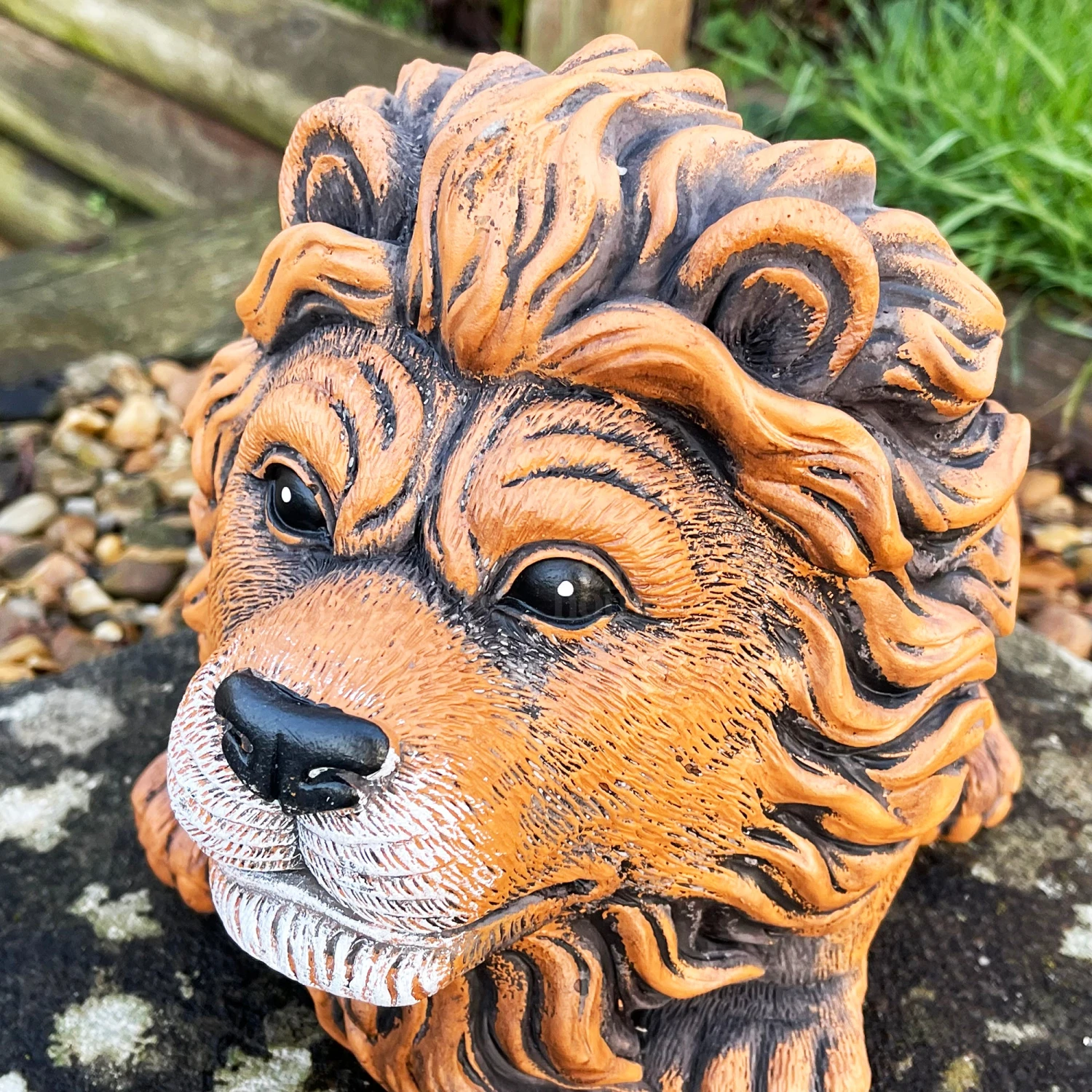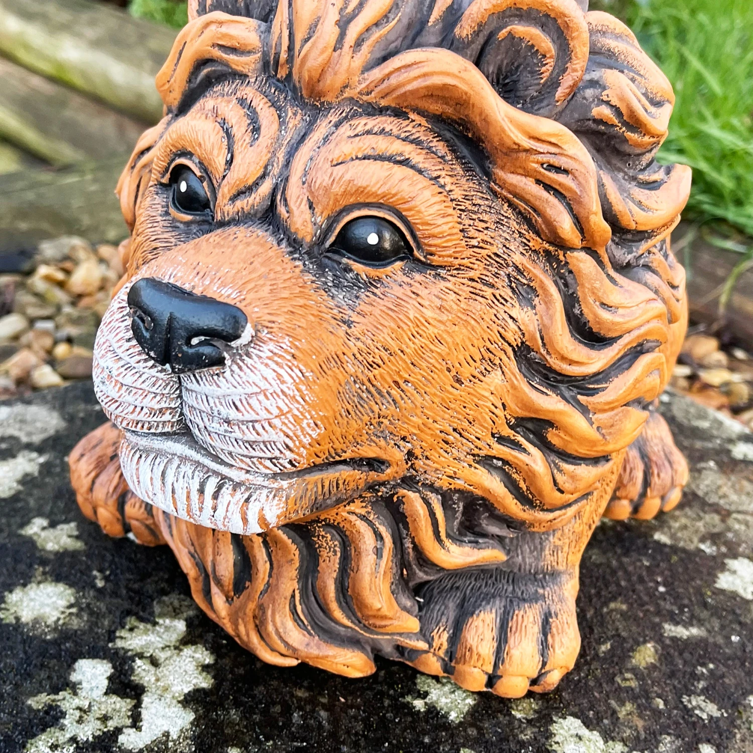 An outdoor cement planter showcasing a cute sitting lion design, painted with lifelike intricate detailing to bring this pot to life in your garden.. 2L oval pot space with a drainage hole included suitable for outdoor purposes.