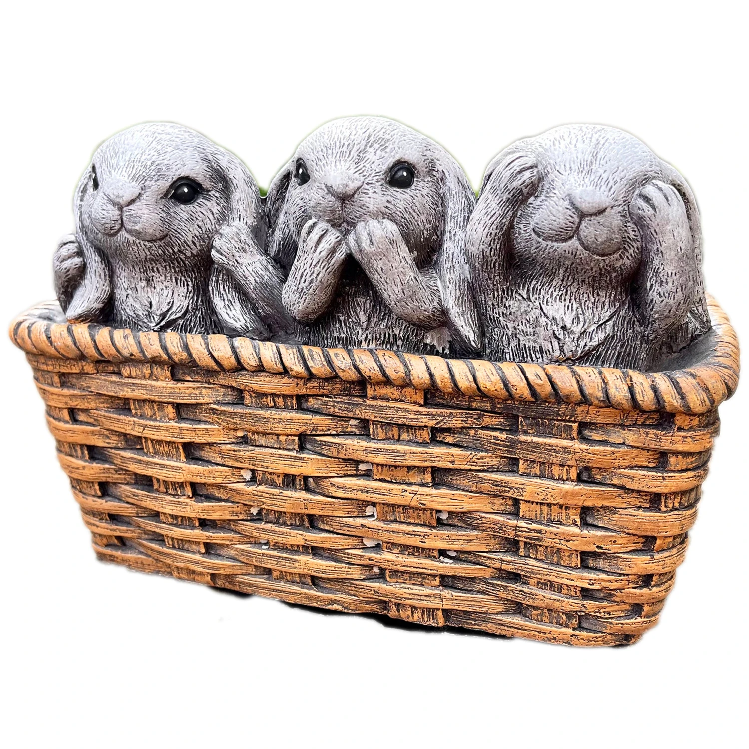 A trio of grey wise rabbits planter made from cement displaying the classic see, hear and speak no evil gestures. These three rabbits are sat in a woven effect cement basket. Drainage hole included and suitable for outdoors. This is a weatherproof design. Antique style with a speckled pattern around the trough. It will be a perfect pot for herbs and small flowers.