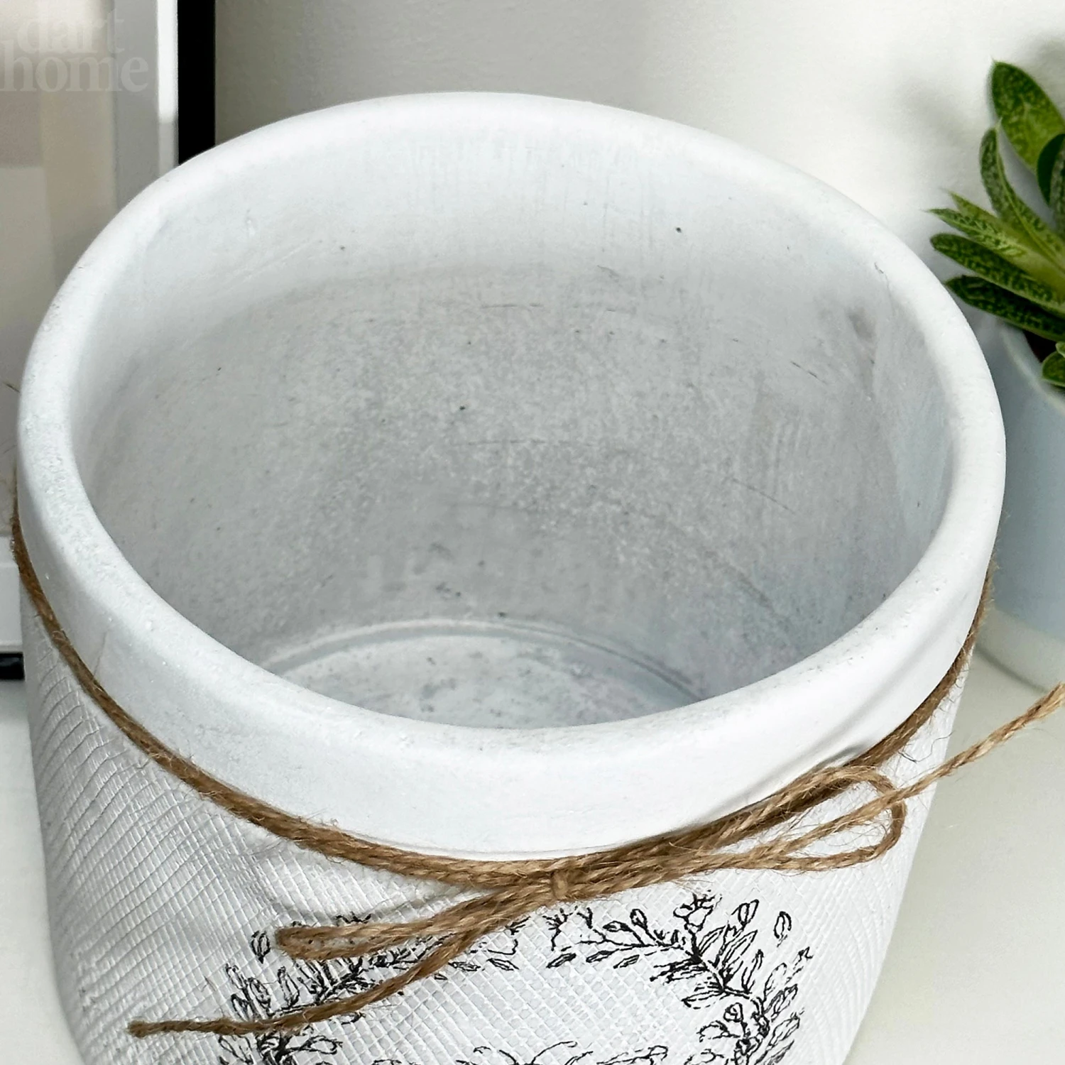 A cement indoor house plant pot boasting a black contemporary bee design surrounded by a floral ring. Covered in a crosshatched pattern and completed with a cute string bow. Perfect for mantlepiece decoration with a houseplant or artificial flowers.