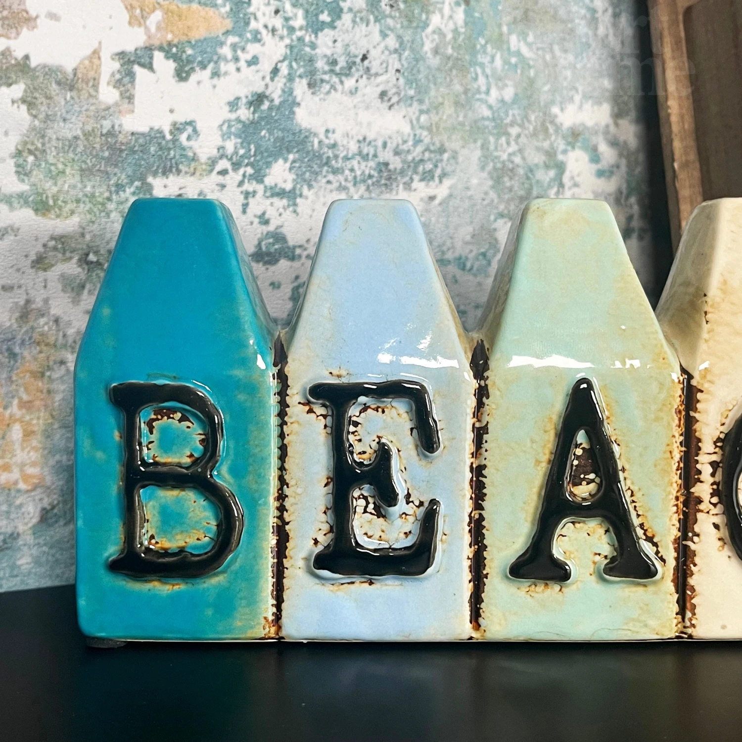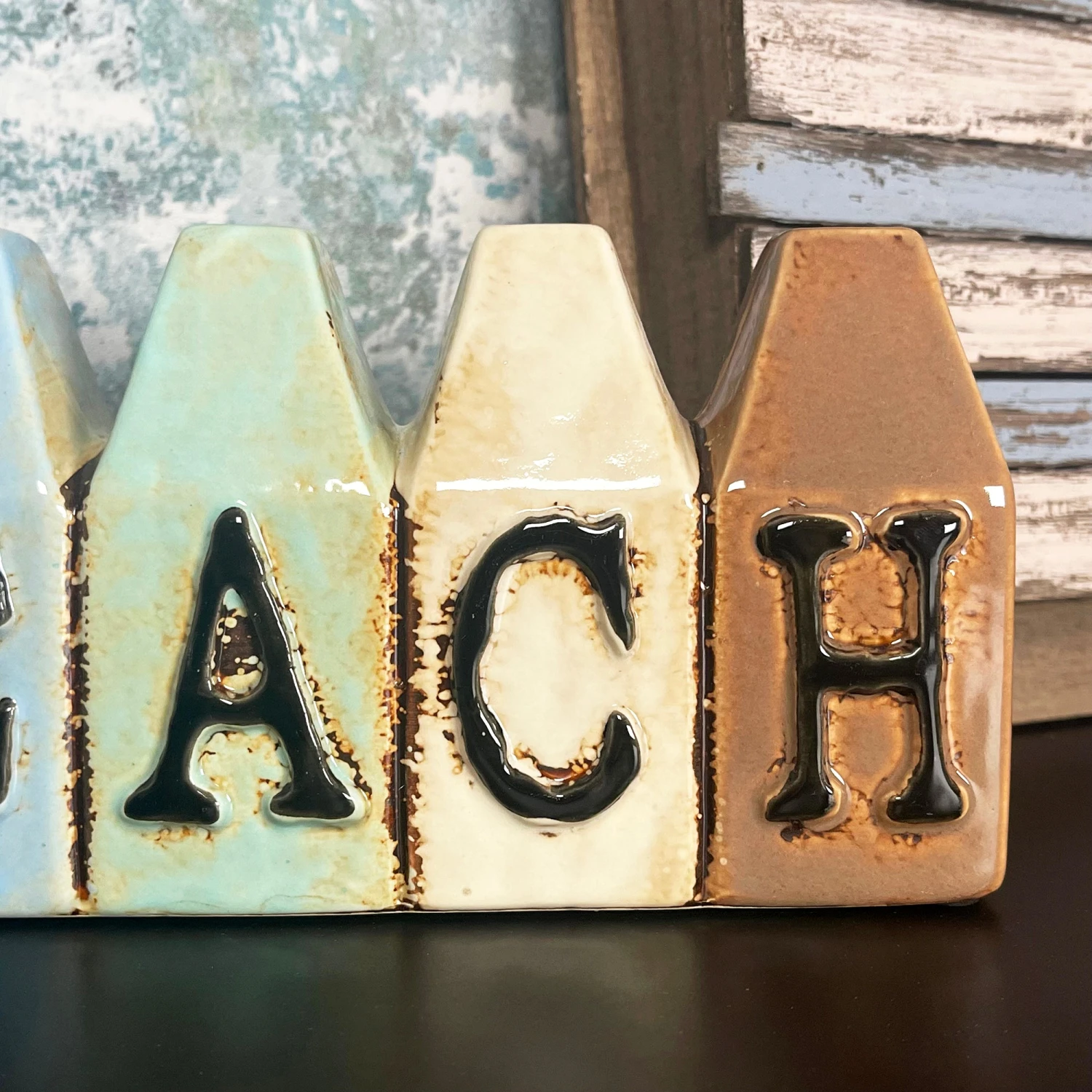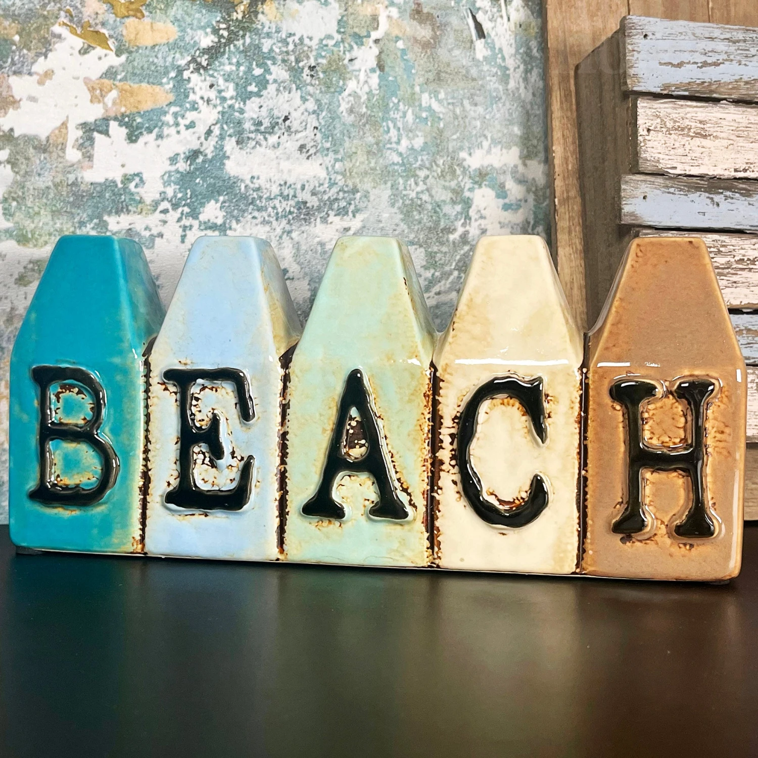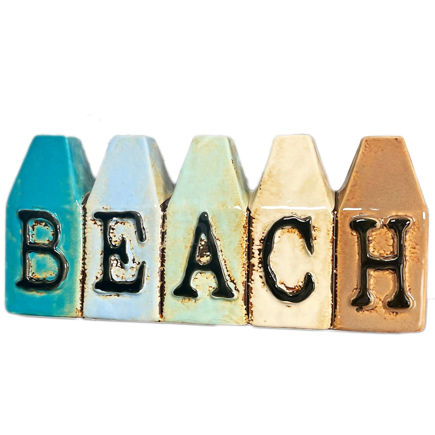 A seaside themed ceramic bud vase featuring a beach hut design with black lettering on the front reading BEACH. Ceramic made and glazed to finish and offer a glossy colourful beach look. Perfect for bathroom decoration for small flower buds and stems.