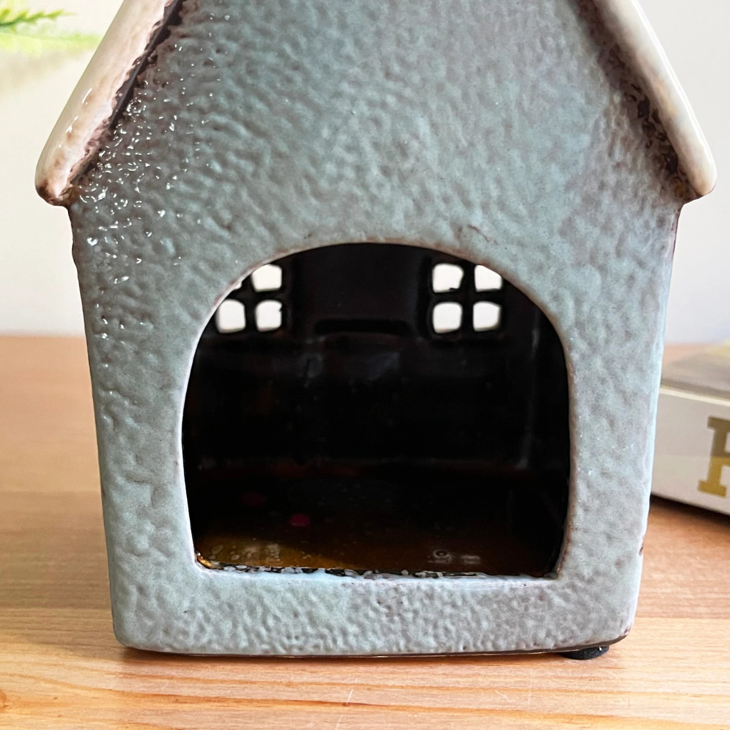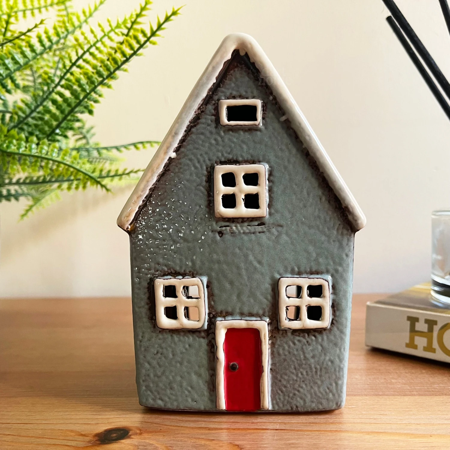 This freestanding ceramic village cottage house tea light holder is delocately made and painted in a distressed dark grey. It will look great in any setting of your home. The candle holder has a rear loading space to place your tea light in and is designed for indoor use.