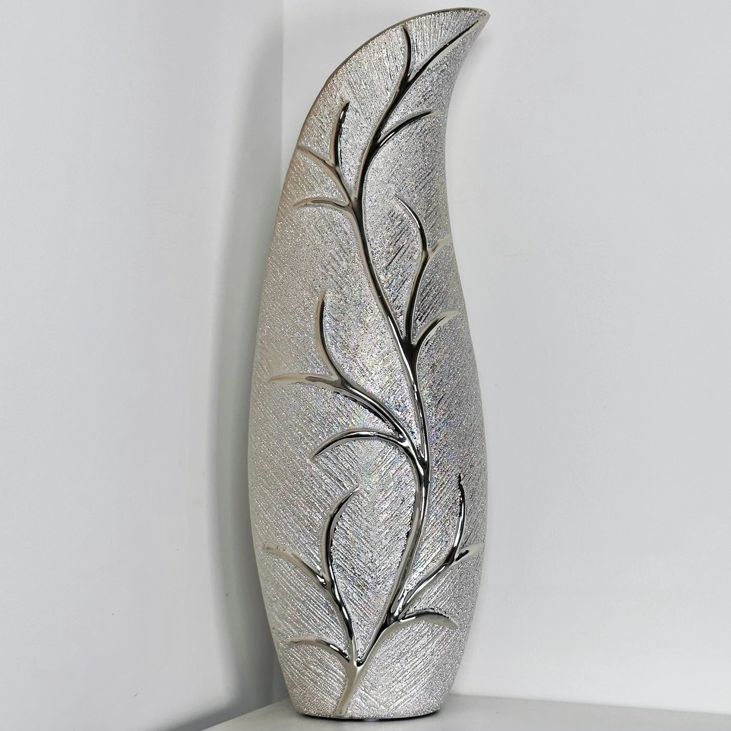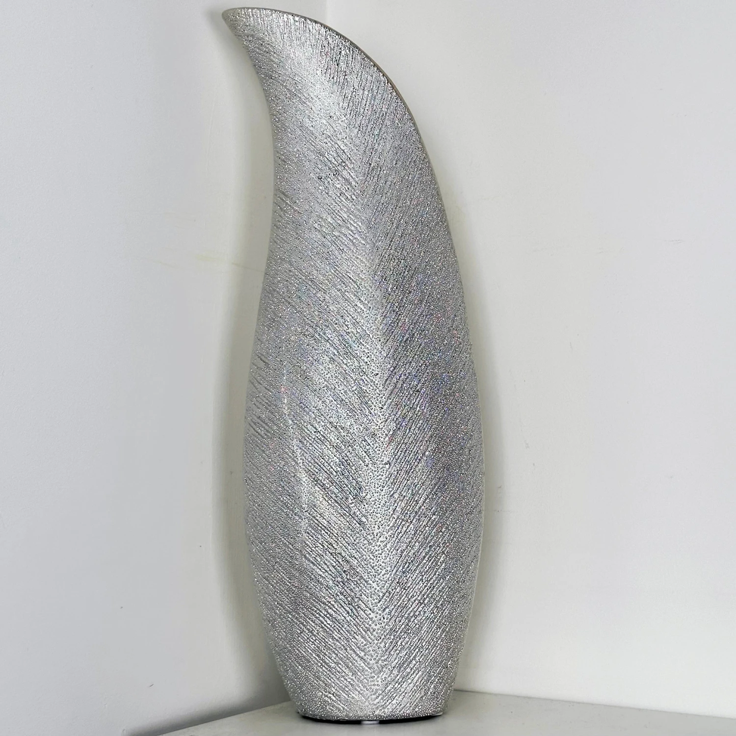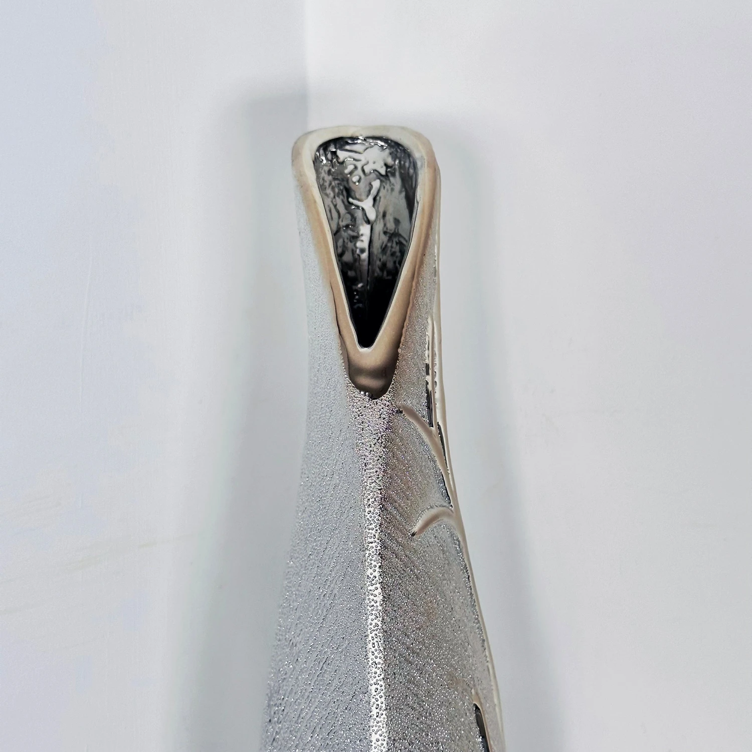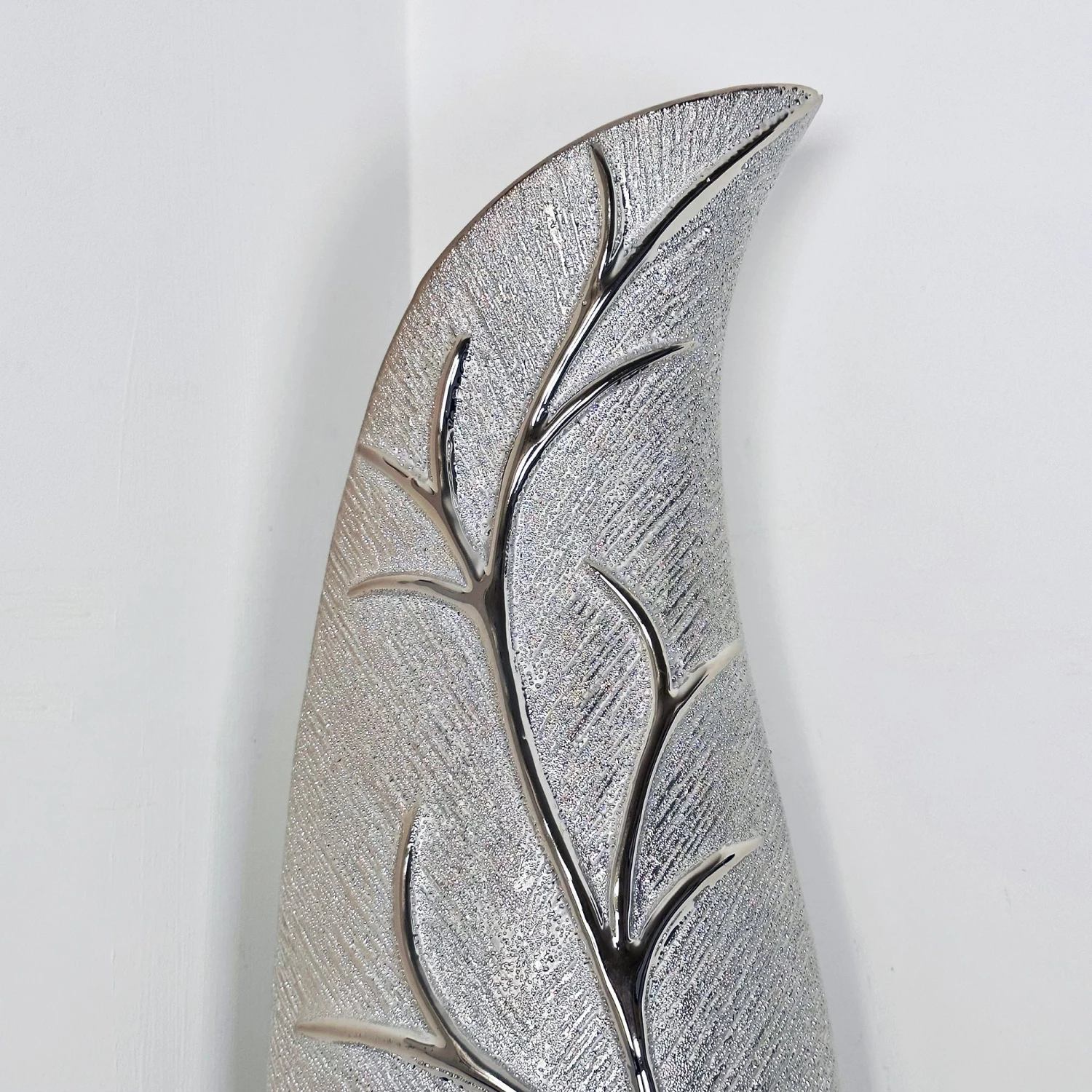 These beautiful champagne silver, ceramic slender leaf vases are perfect flower vases that will act as perfect statement pieces on any home or wedding table that is placed on.