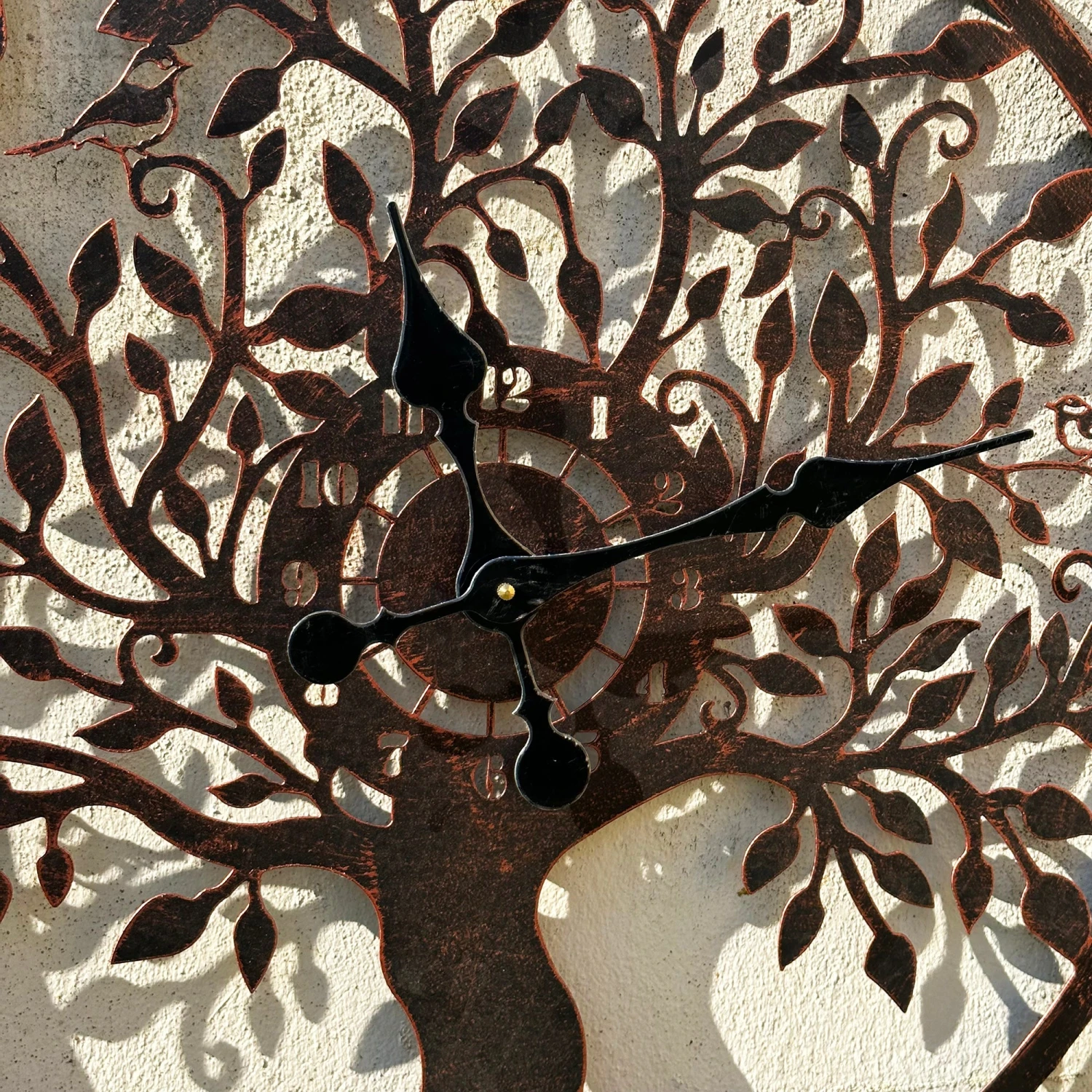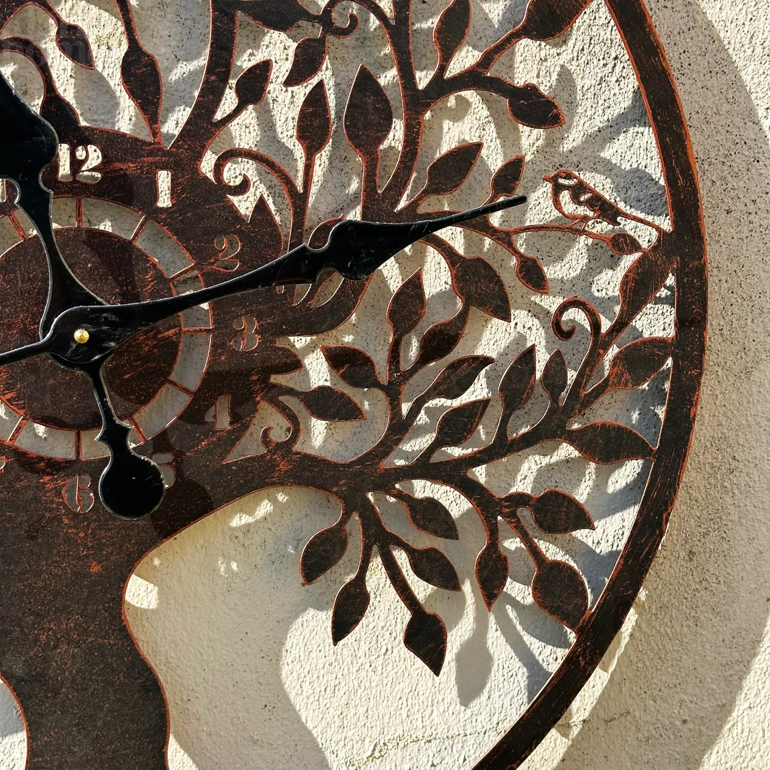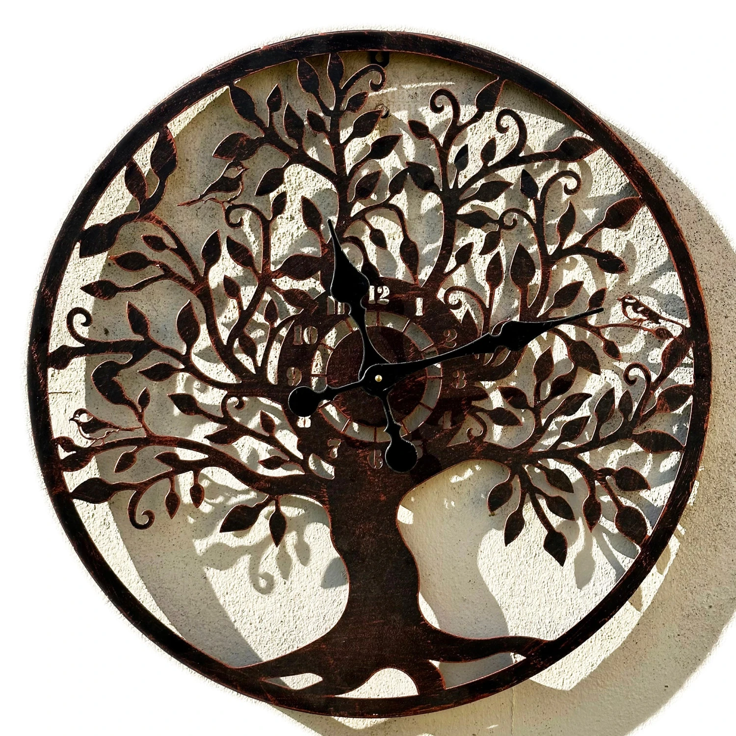 Keep track of time even when you’re outdoors with our modern outdoor wall clock, boasting a copper tree of life design. This battery powered garden clock features an arabic numeral 12 hour display and deep black hands to add an elegant touch. This clock is suitable for year-round outdoor use.