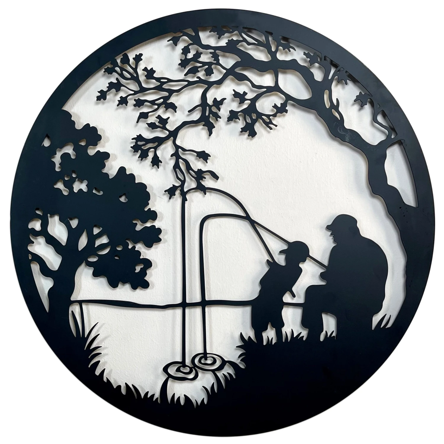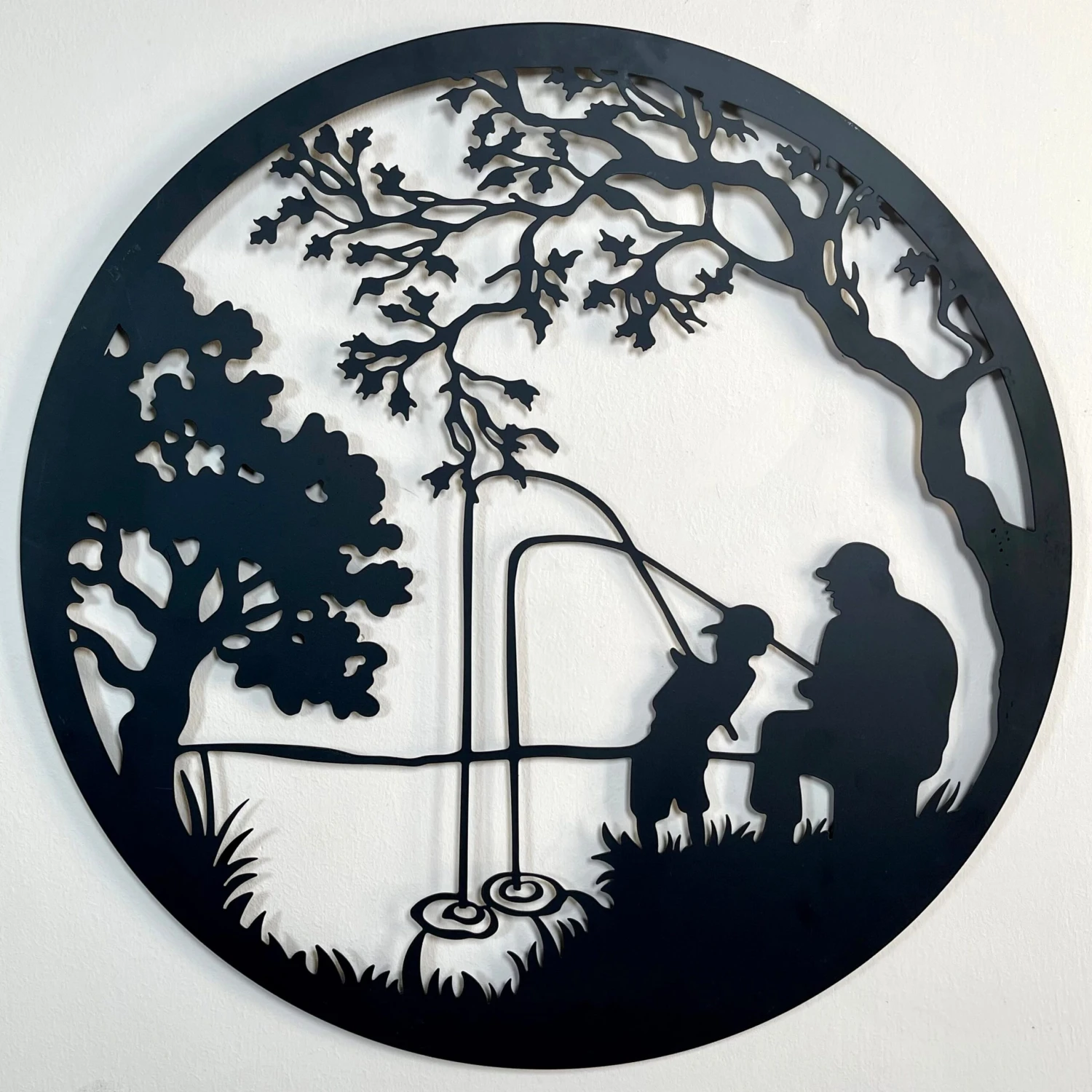 Quirky silhouette wall art featuring a fishing father and son. This black round wall hanging sports themed steel sculpture is a great gift idea for a dad on fathers day or christmas. It can be used indoor and outdoors. Care instructions – clean with a damp cloth.