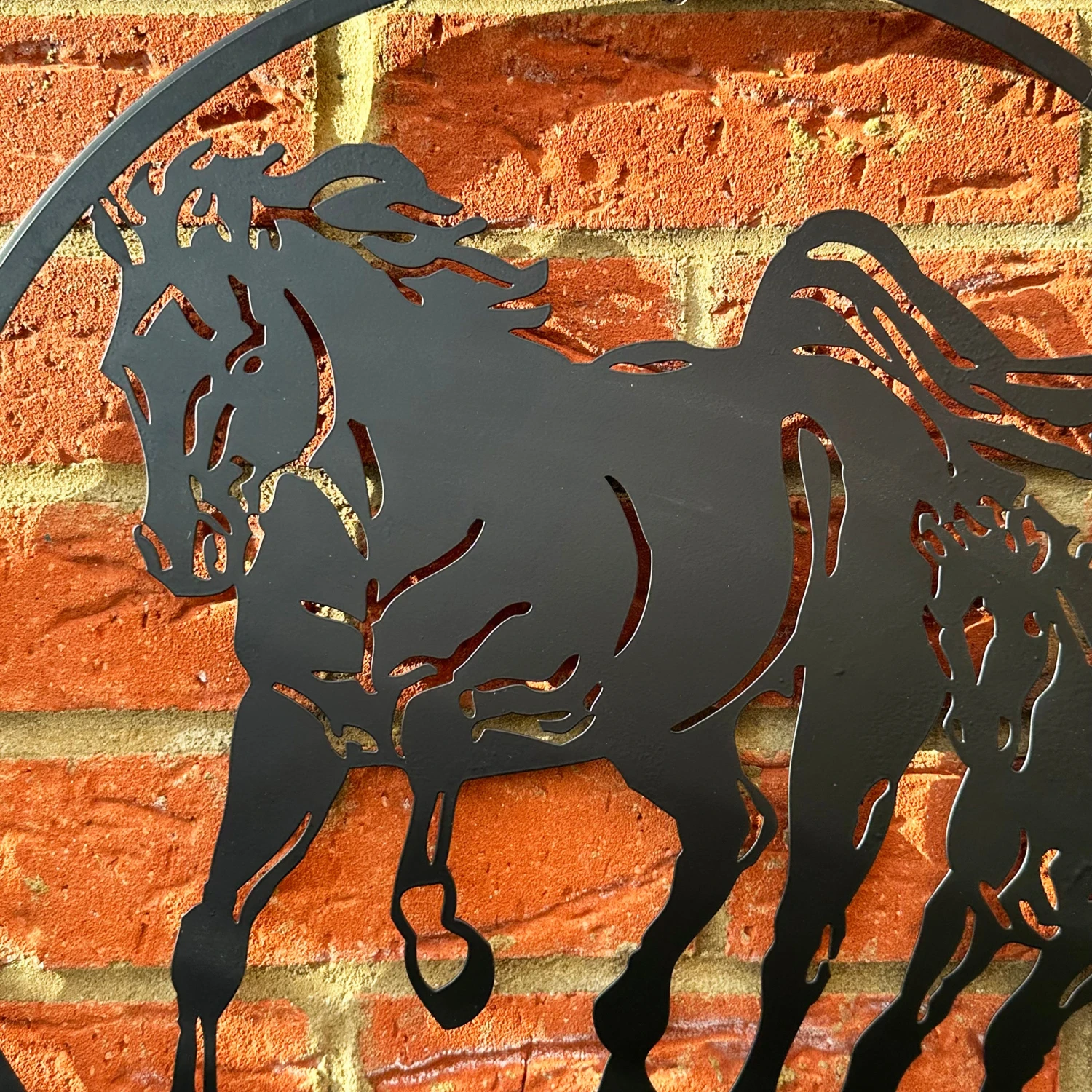 This black wall art captures a traditional galloping horses scene featuring a seated horse and foal, whilst using dark coloured metals creating a gorgeous silhouette illusion. It can be used indoors and outdoors and is a wall mounted piece.