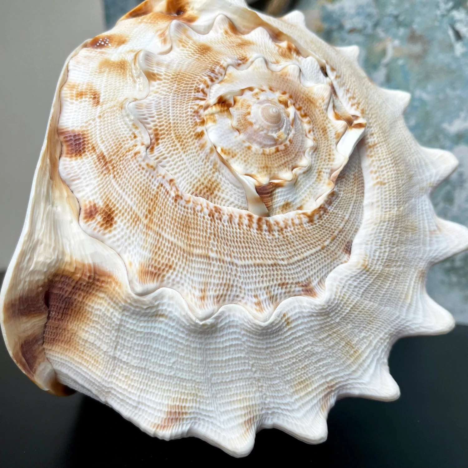 Finished with a white and brown soft tone, these giant horned queen helmet shells, originating from the famous Cassis Cornuta are perfect for bathroom decoration filled with a nautical theme.