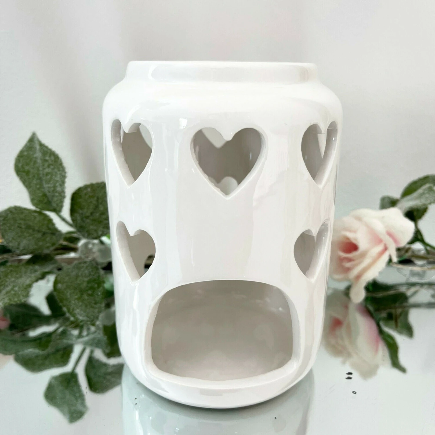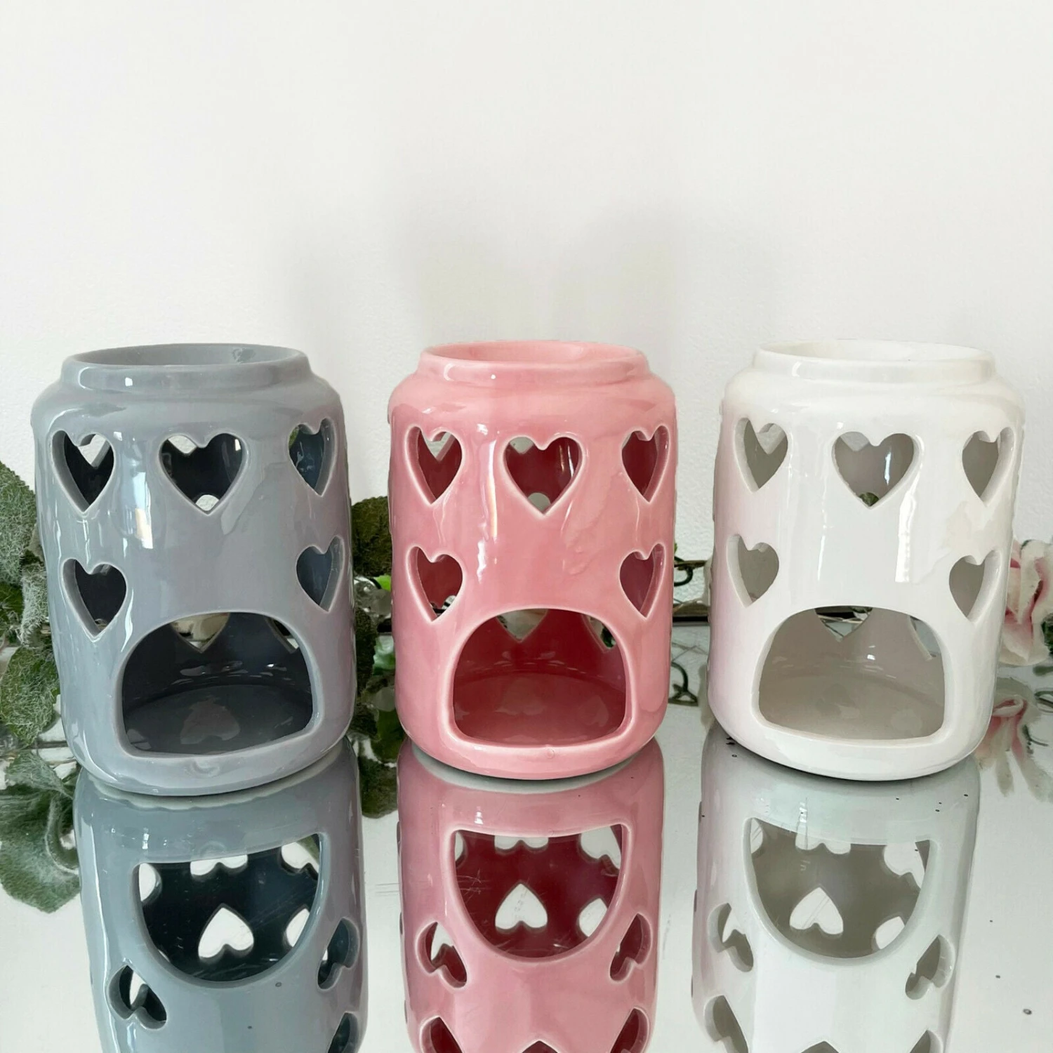 These burners have love heart cut outs in the design and come in three colours: white, grey and pink. They have a tea light candle holder space at the bottom and a round caved bowl suitable for burning wax melts and oil.