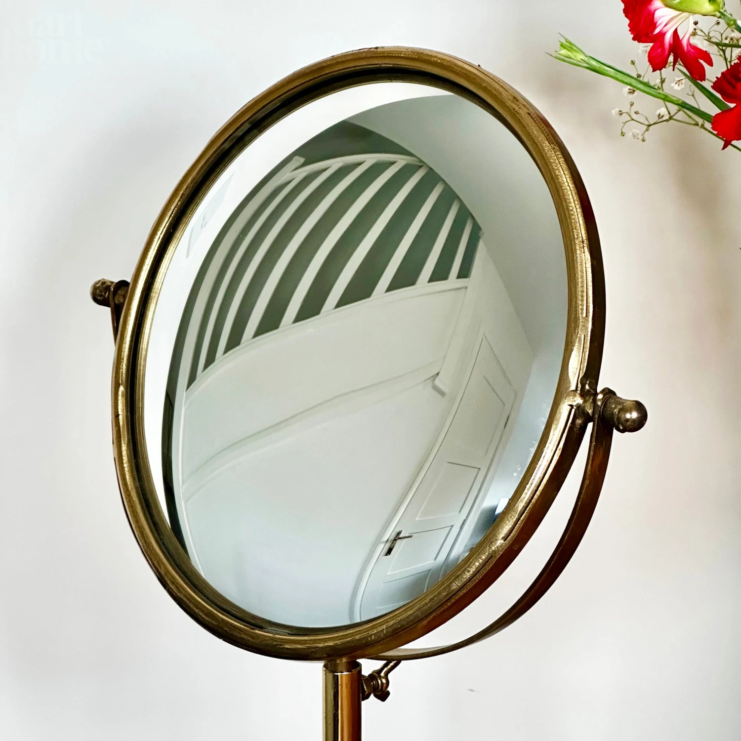 Designed with a round convex mirror at the centre, this freestanding table mirror features an antique gold frame and is adjustable for freedom to change height hight or lower and a lock to secure height in place. This decorative table mirror will bring timeless style into your home and bathroom and create a unique illusion effect with its convex mirror.