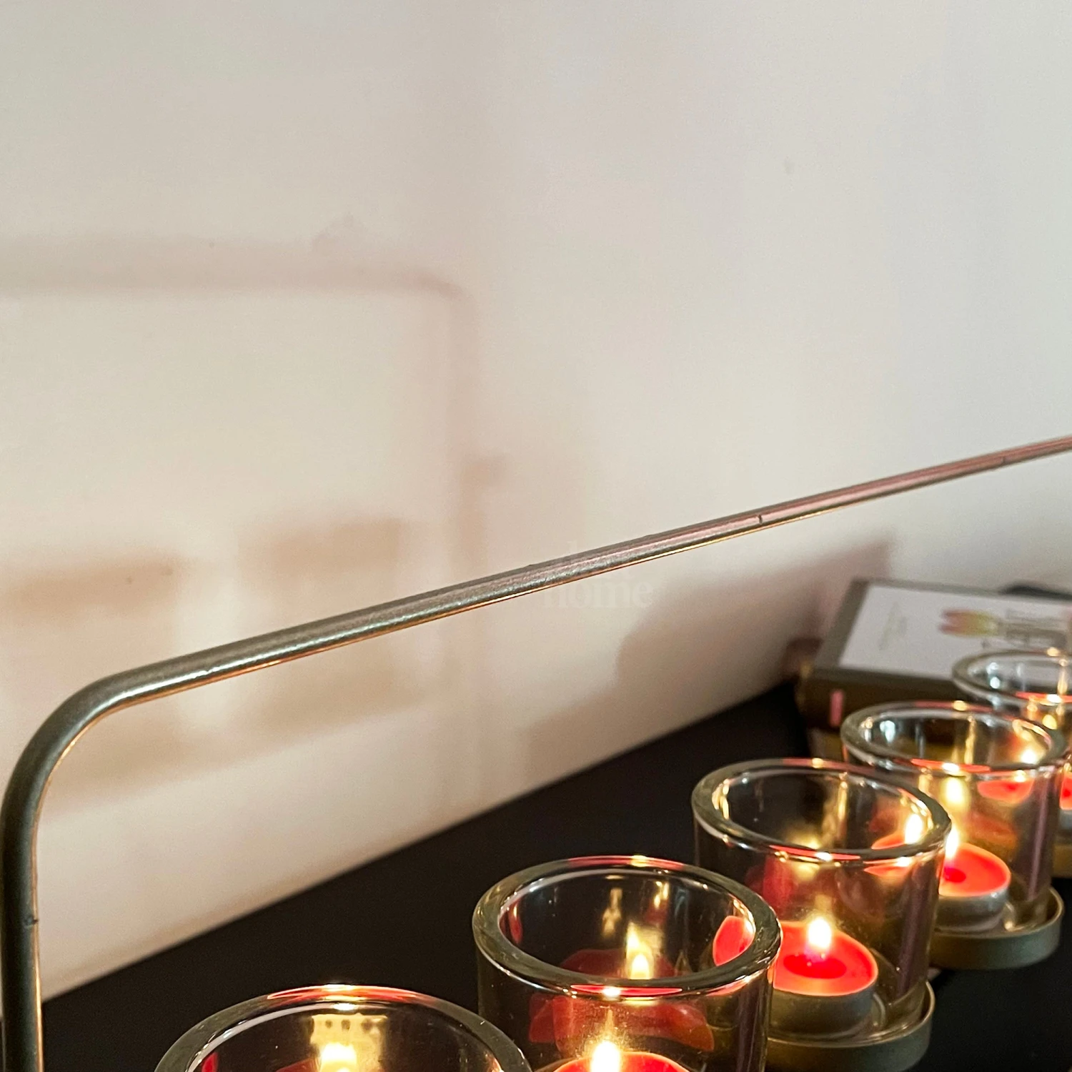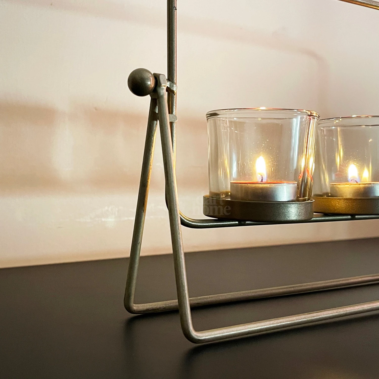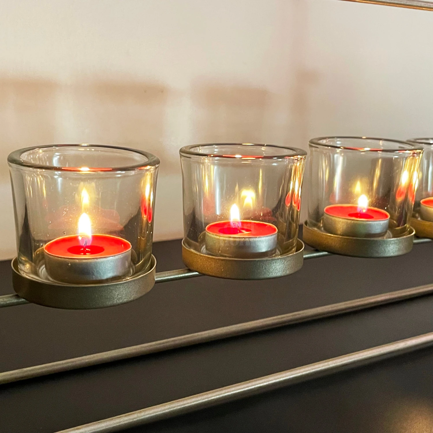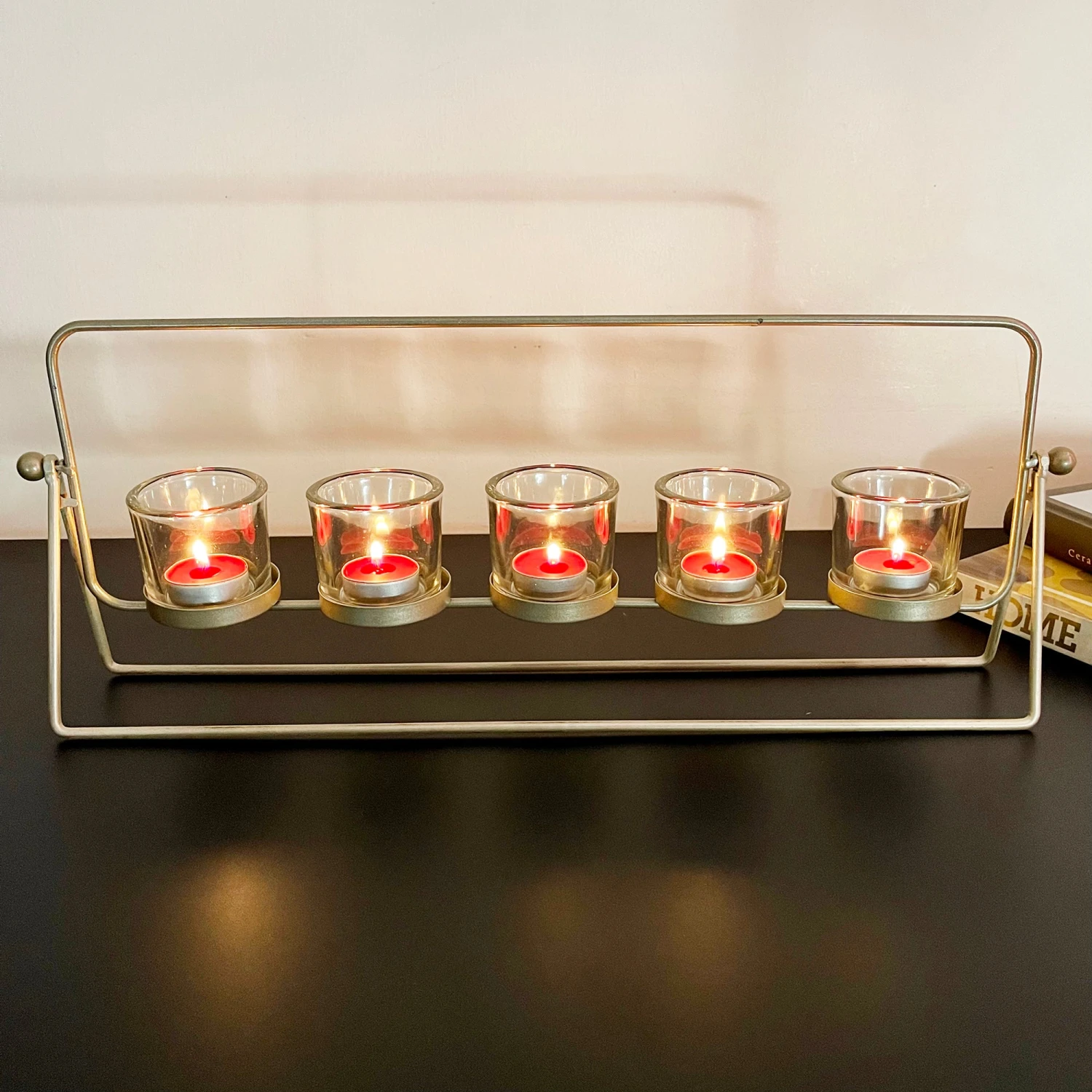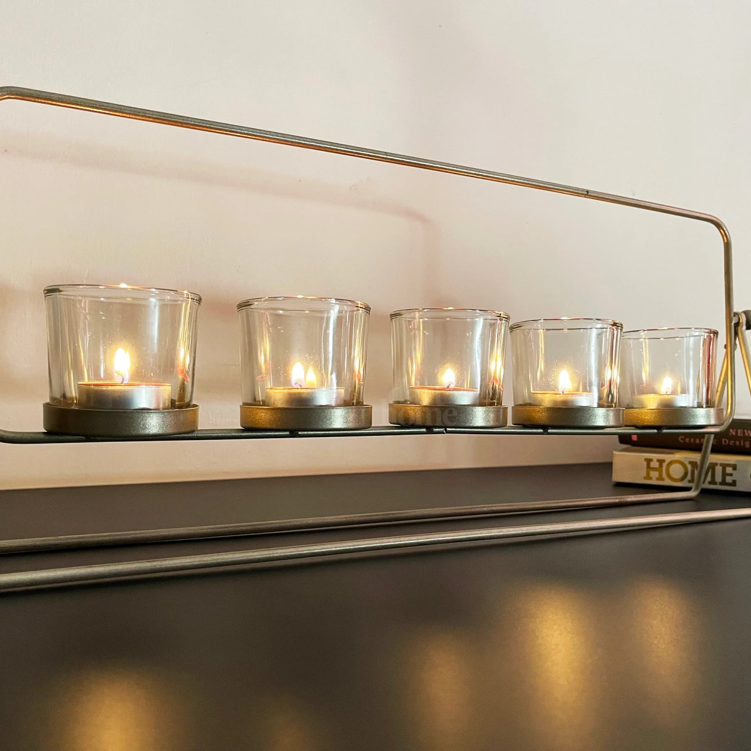 Boasting a modern design, this stylish tealight holder set features 5x glass hurricane candle holders, all perfectly placed upon a gold metal stand. A striking centrepiece for dining table or mantle decoration.