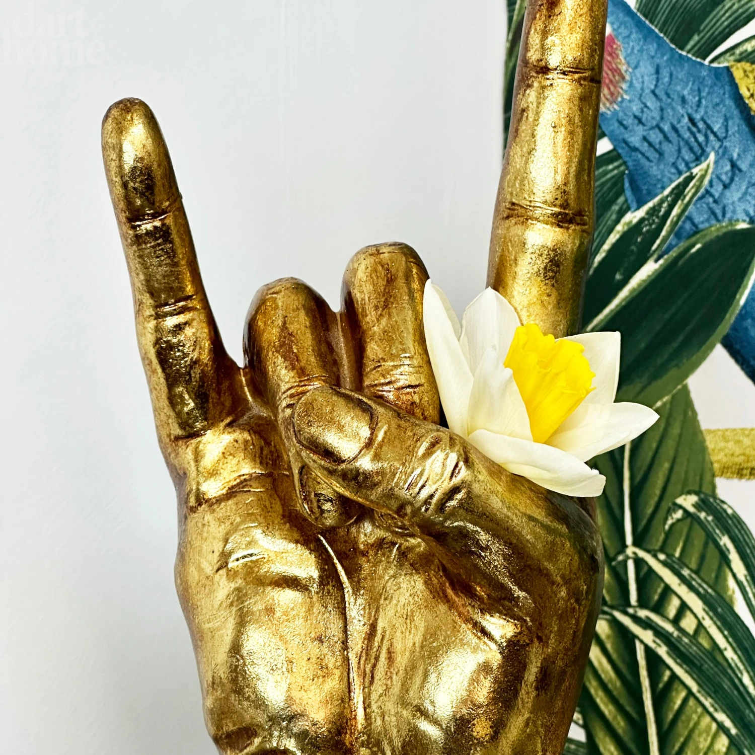A funky golden hand vase gesturing a cool Rock On hand sign. This striking antique gold sculpture, filled with your favourite colourful flower buds and stems will add a modern style to your home decor and is certain to be a focal point in any room. This hand vase is made from resin, perfect for indoor use and as a gift idea.