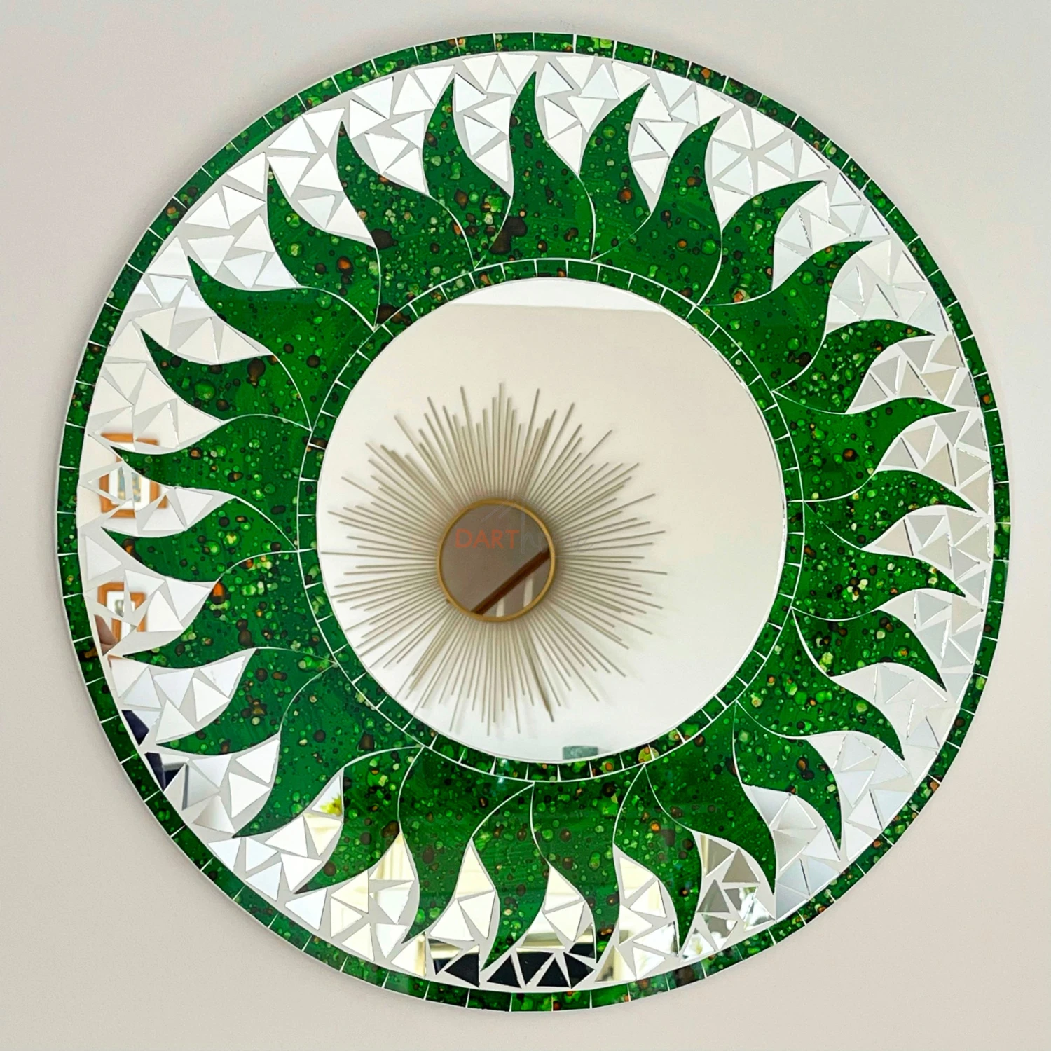 Stunning sun themed mosaic round wall mounted mirror. Mirrored glass frame with a dark green shade with a black and green paint splatter effect throughout.