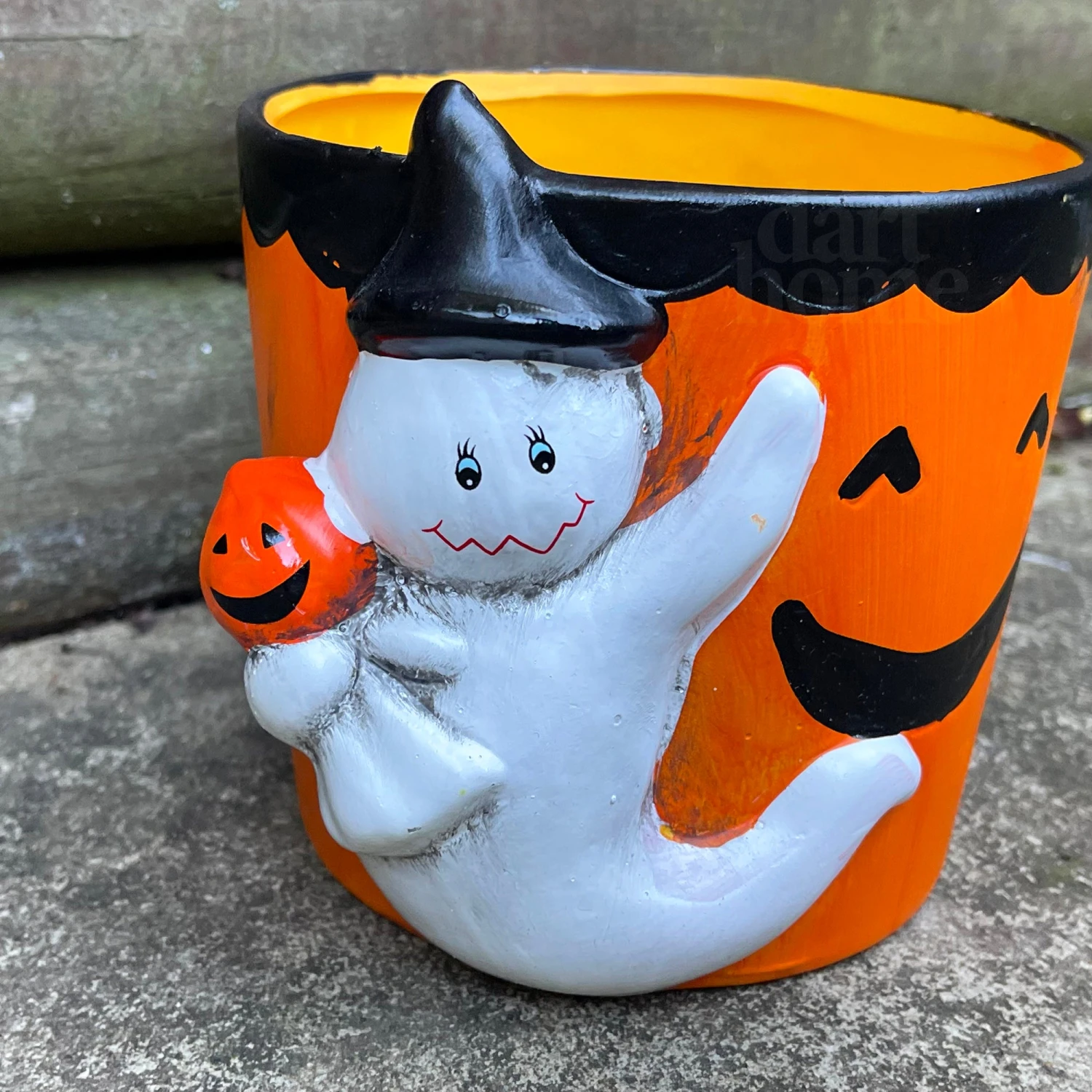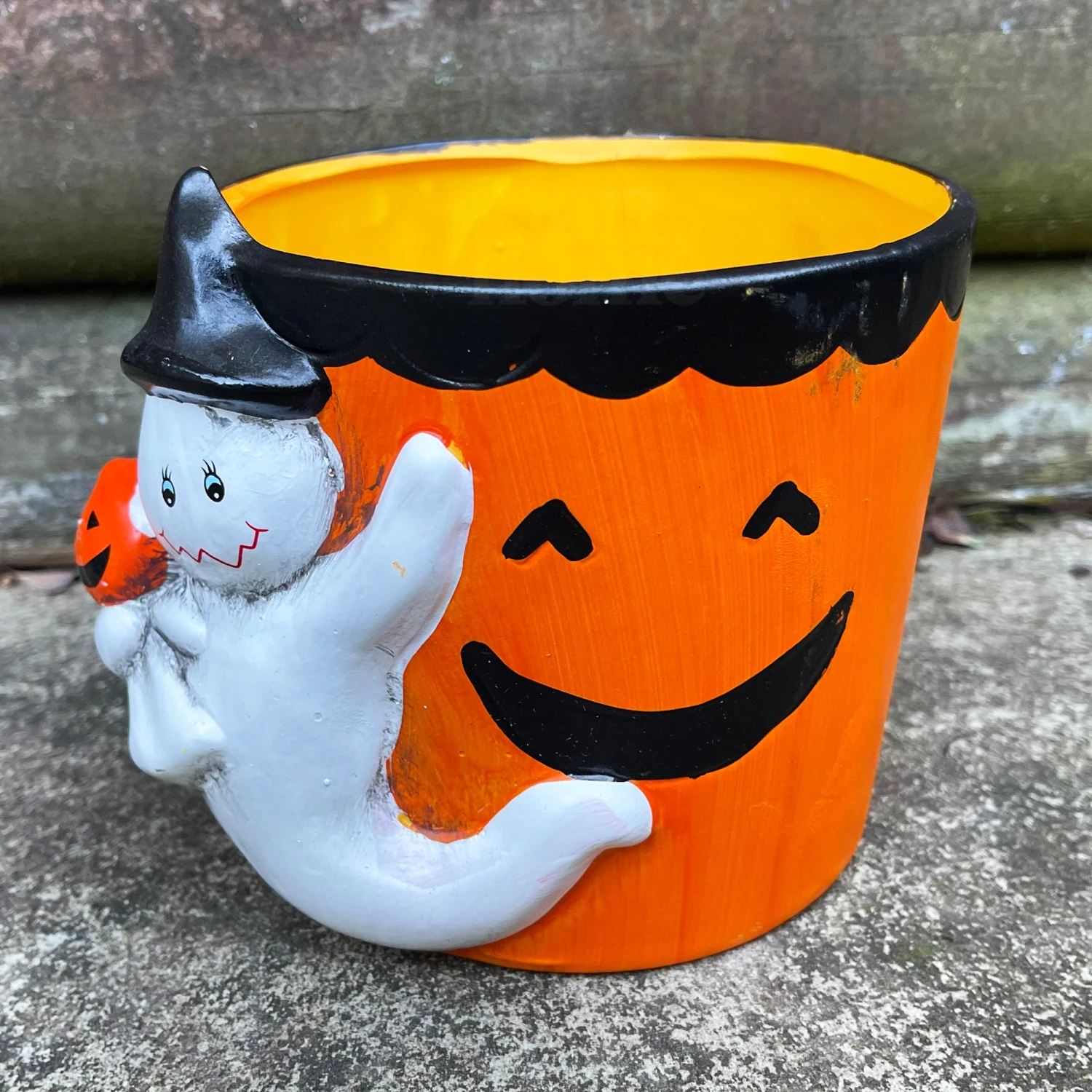 Decorate your home for halloween with this quirky Pumpkin Ghost plant pot. Suitable for indoor and outdoor use this ceramic round orange animated pumpkin ghost planter will hold a plant pot or a succulent perfectly during the halloween period.