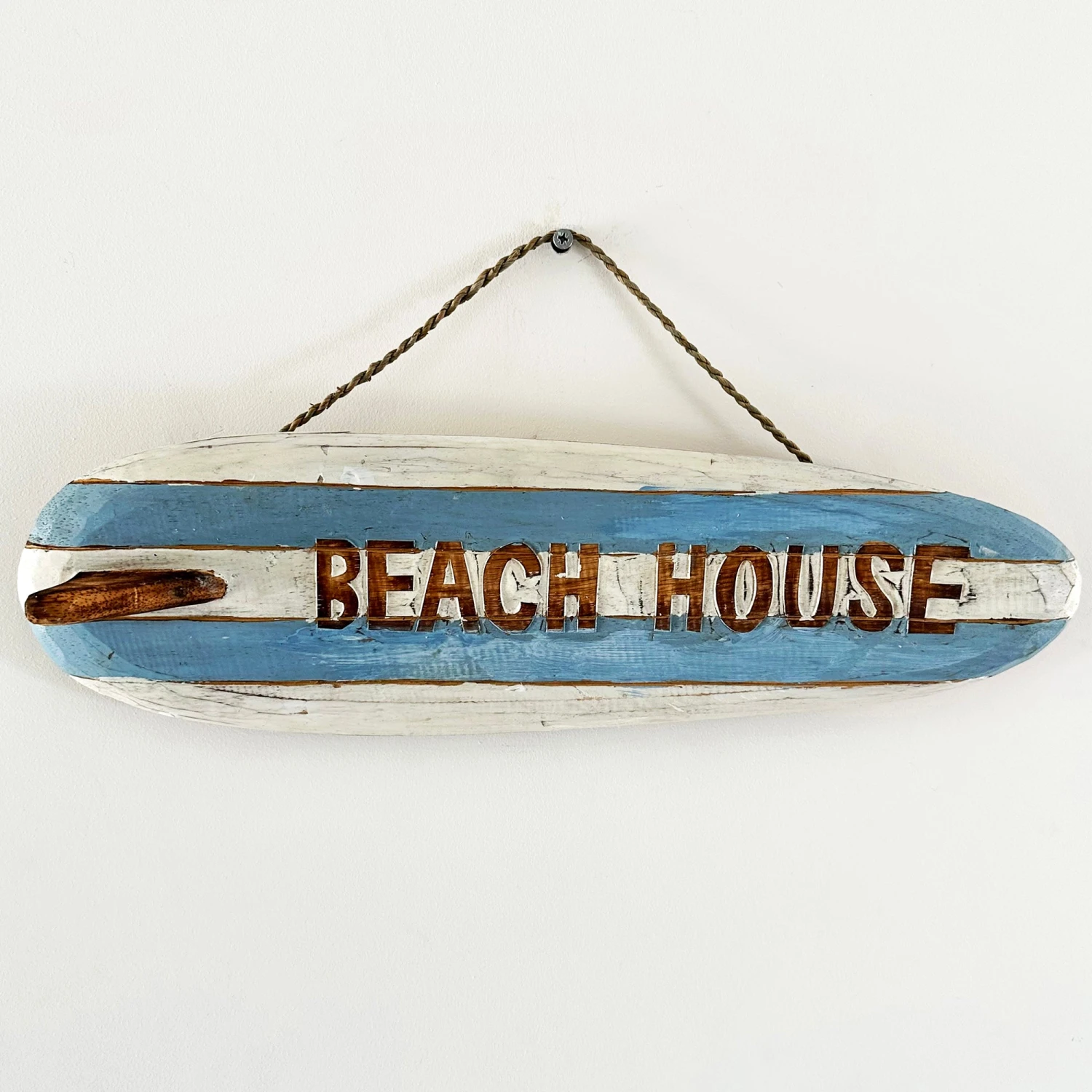 A fantastic seaside themed wall sign featuring a blue and white striped, surfboard shape design with Beach House displayed in a capitalised block font. This fun horizontal hanging distressed plaque will be a great wall hanger for your bathroom decor to instal colourful, coastal themed decor.