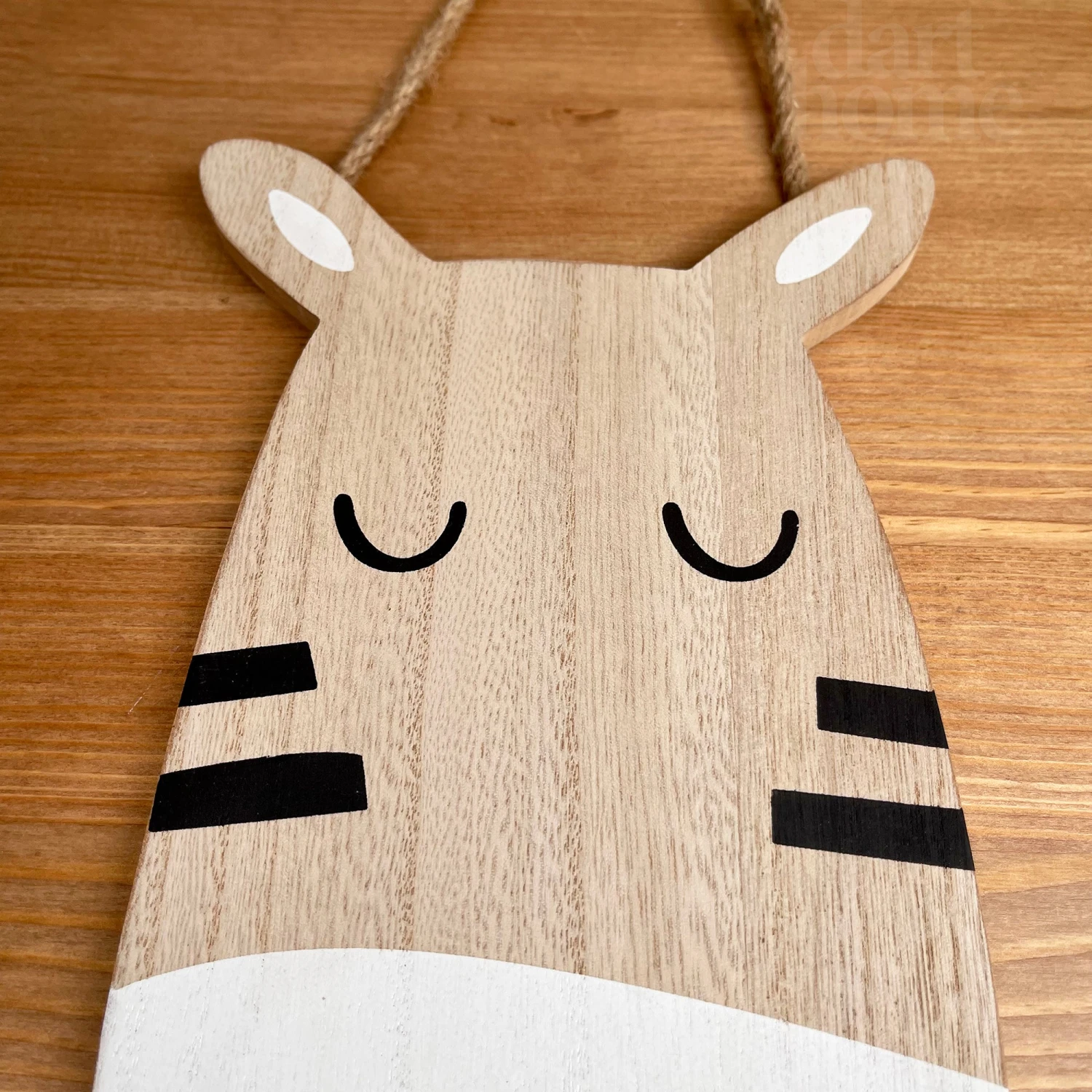 Animal shaped hanging plaque, featuring a round brown zebra head with black and white facial features. A wall hanging decorative plaque that is perfect for a childrens bedroom. Handmade and hand finished from wood.