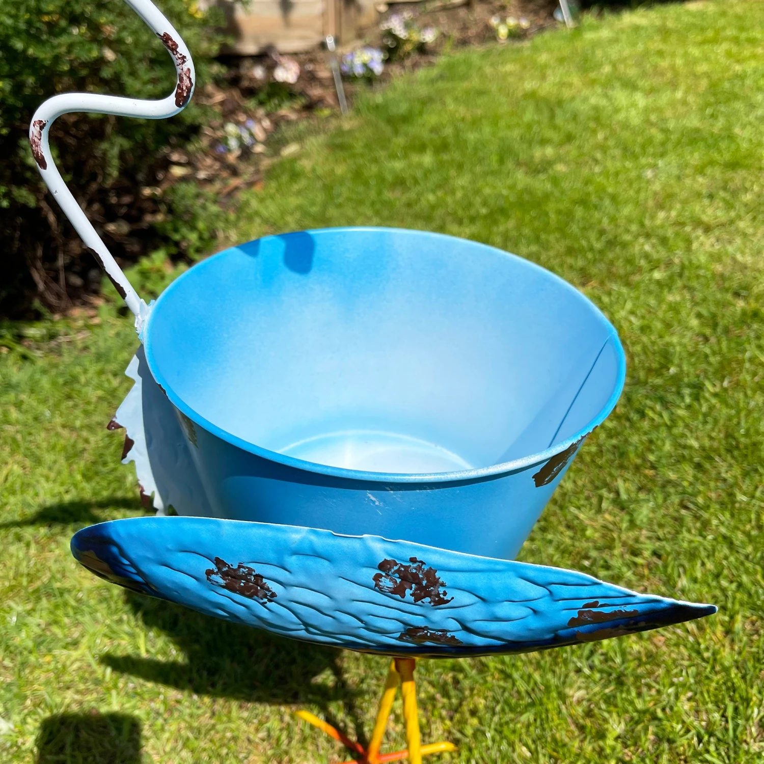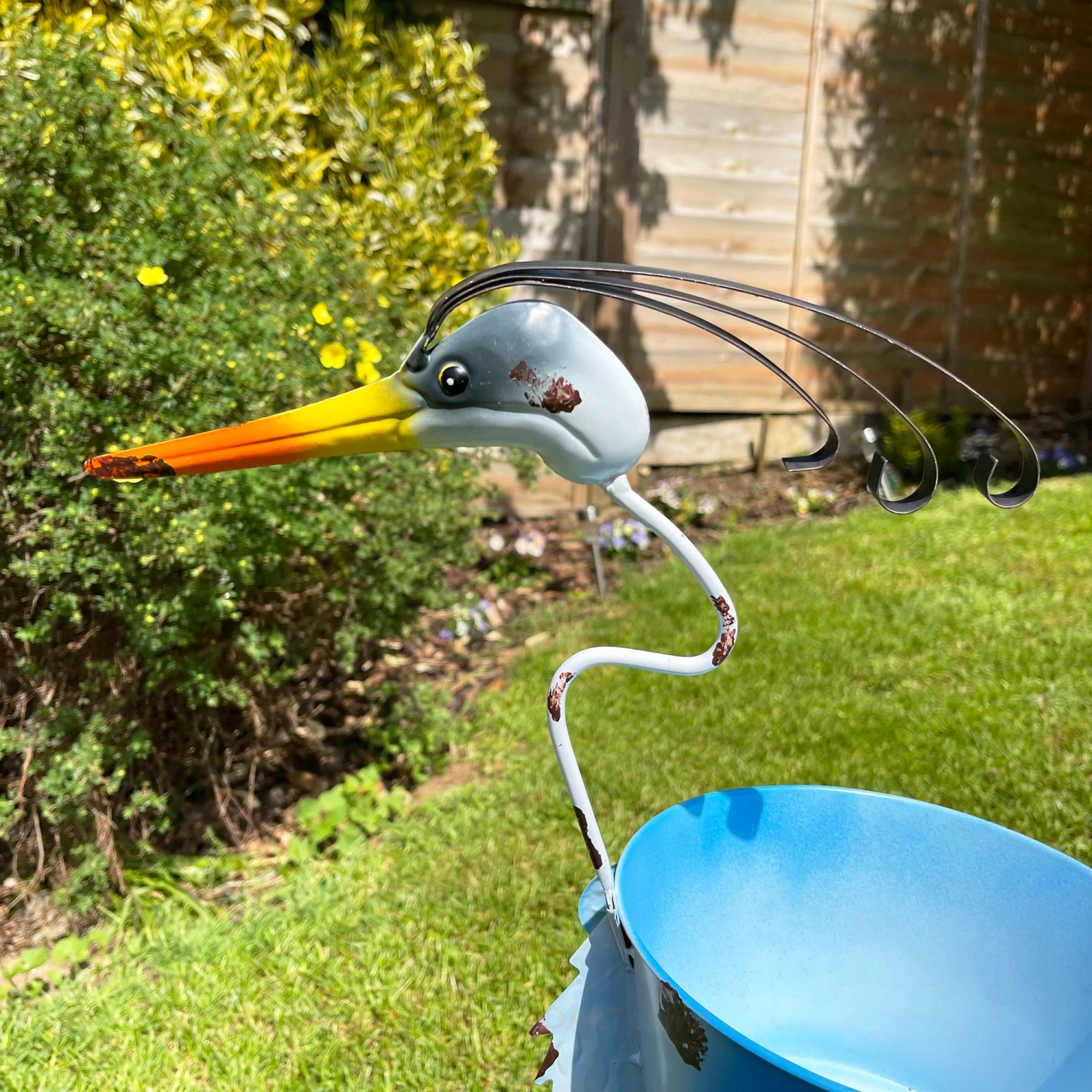 Garden heron round planter and ornament, crafted from metal and hand painted blue and white. Perfect for decorative use with small real flowers and herbs. Animated style with long legs, a long neck and head with realistic facial features.