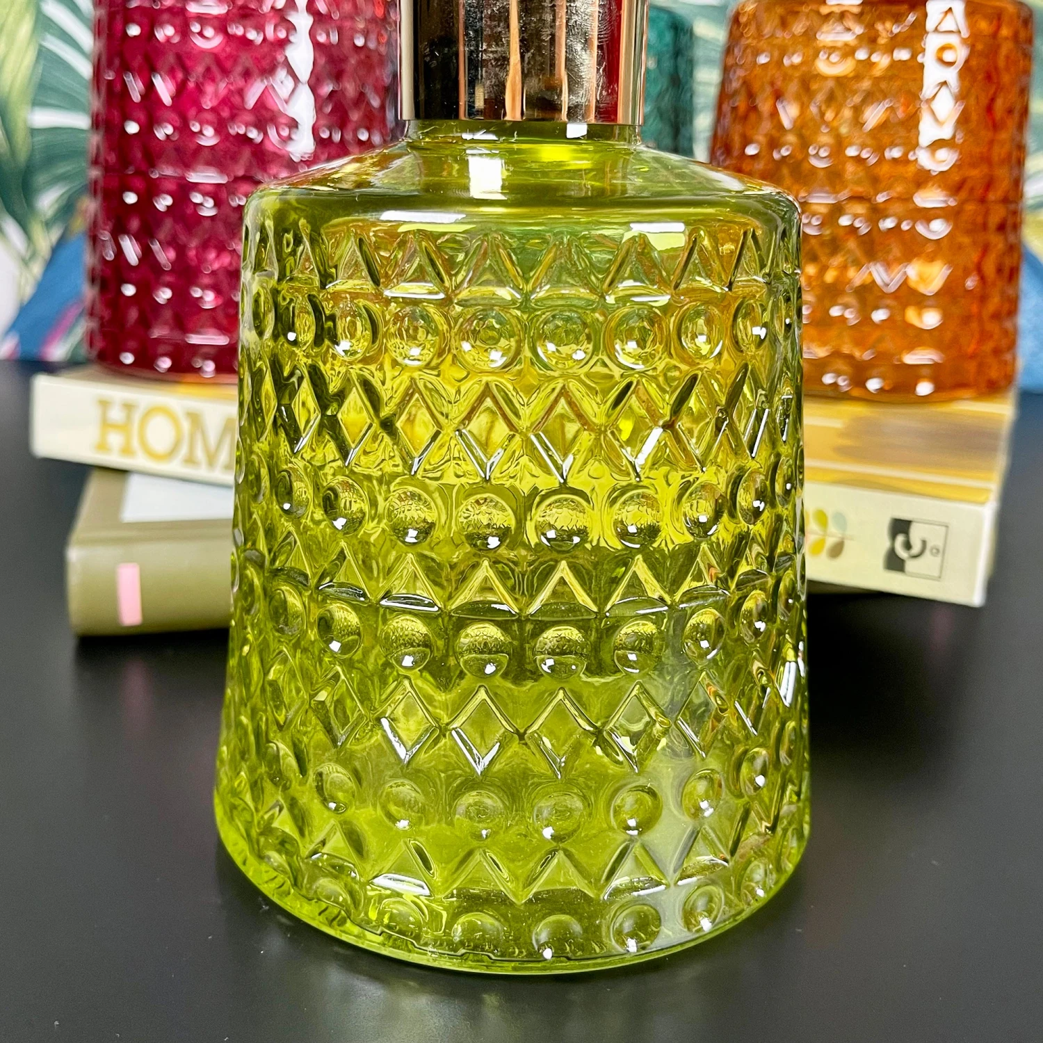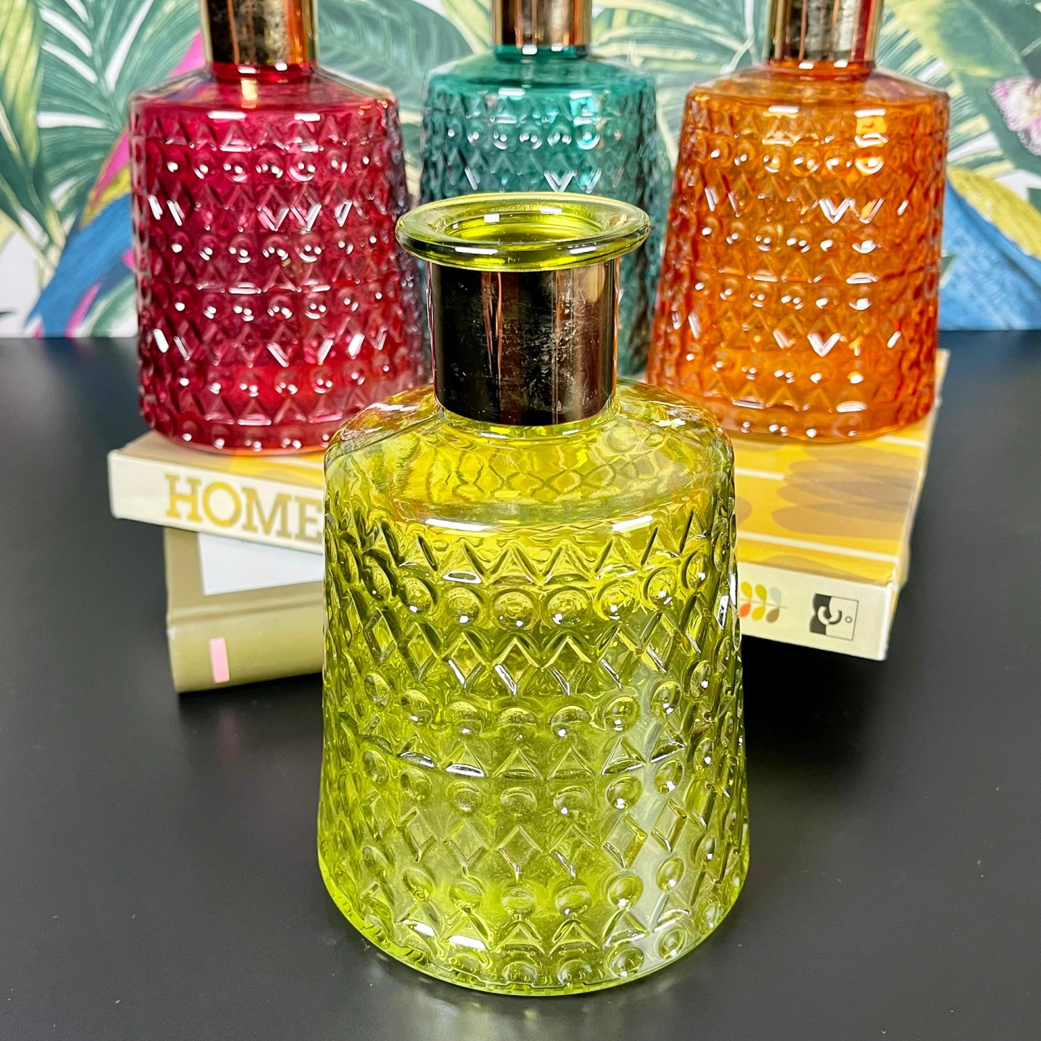 A beautiful assorted set of 4 brightly coloured glass vases with shiny gold collars, perfect for enhancing the eclectic botanical style around your home and dining room. These wide bottle vases are perfect for wedding table and dining table decoration to add some colour to your home decor.