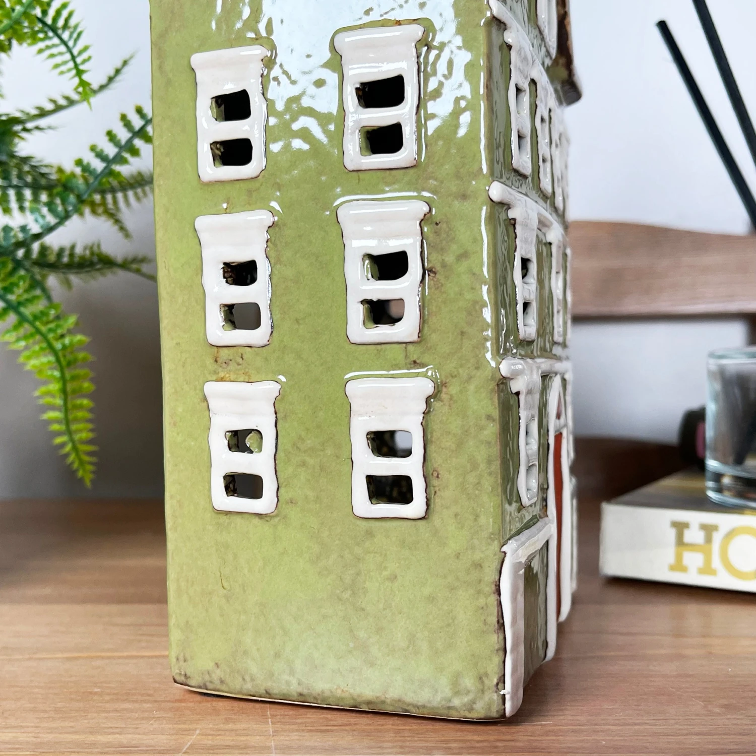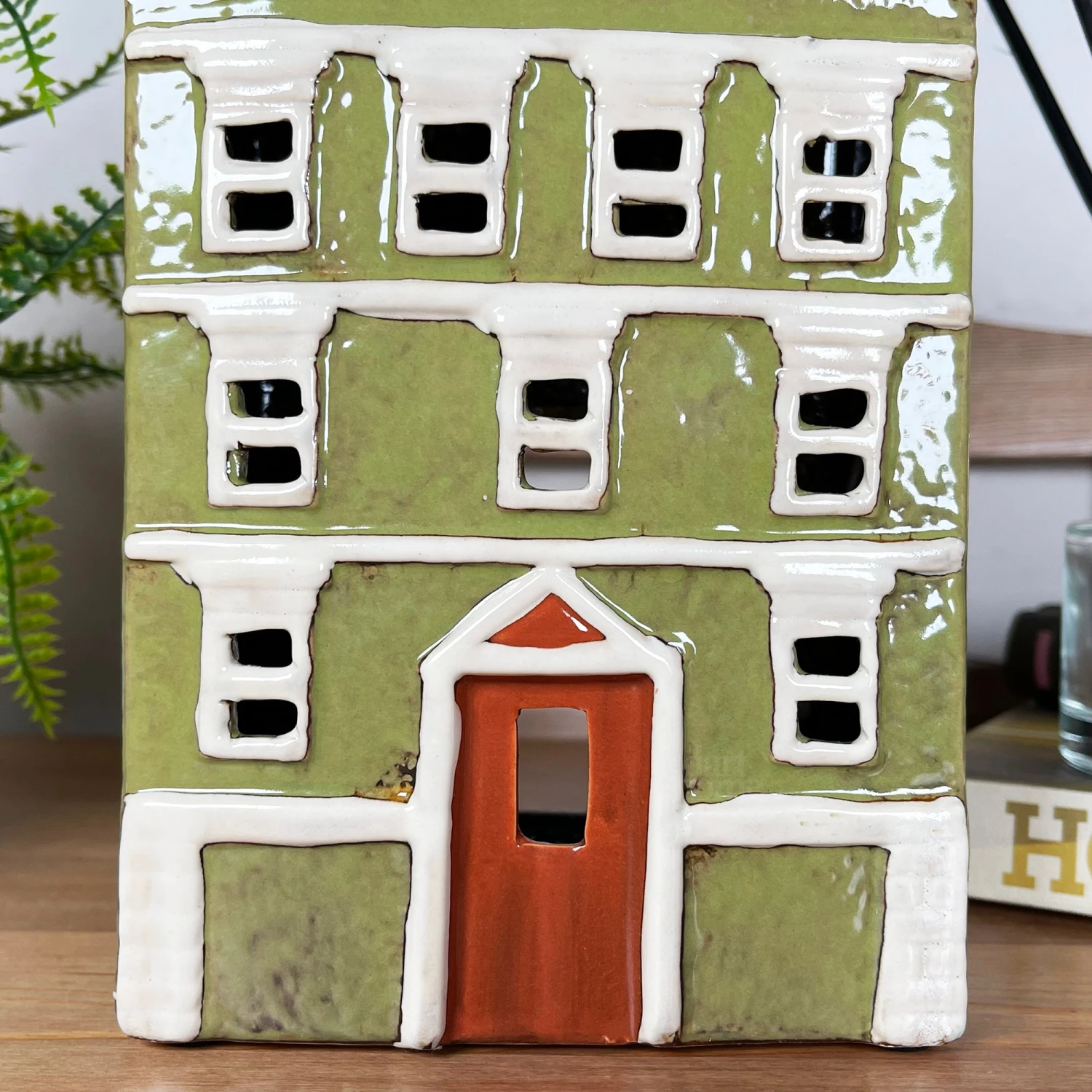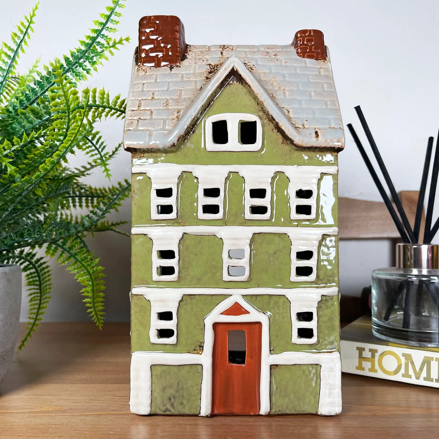 Stunning large town house featuring olive green walls, white windows, brown door and double brown chimneys. This elegant country style piece acts as a tea light holder that will glow when the lights are dimmed, offering a sense of calm and warmth wherever placed. It is made from glazed ceramics and is suitable for tea lights and indoor use only. It is a must have contemporary piece of home decor for your home.
