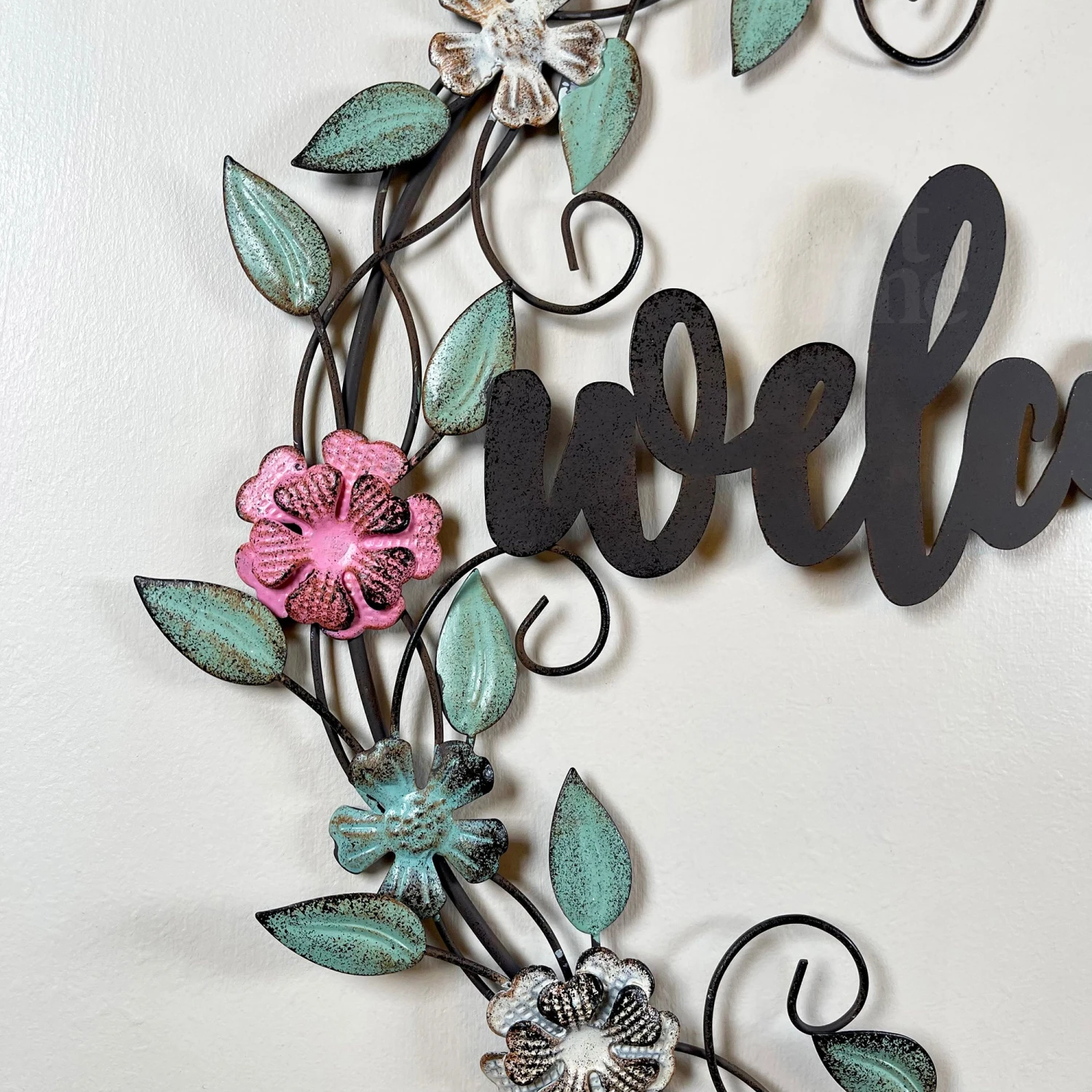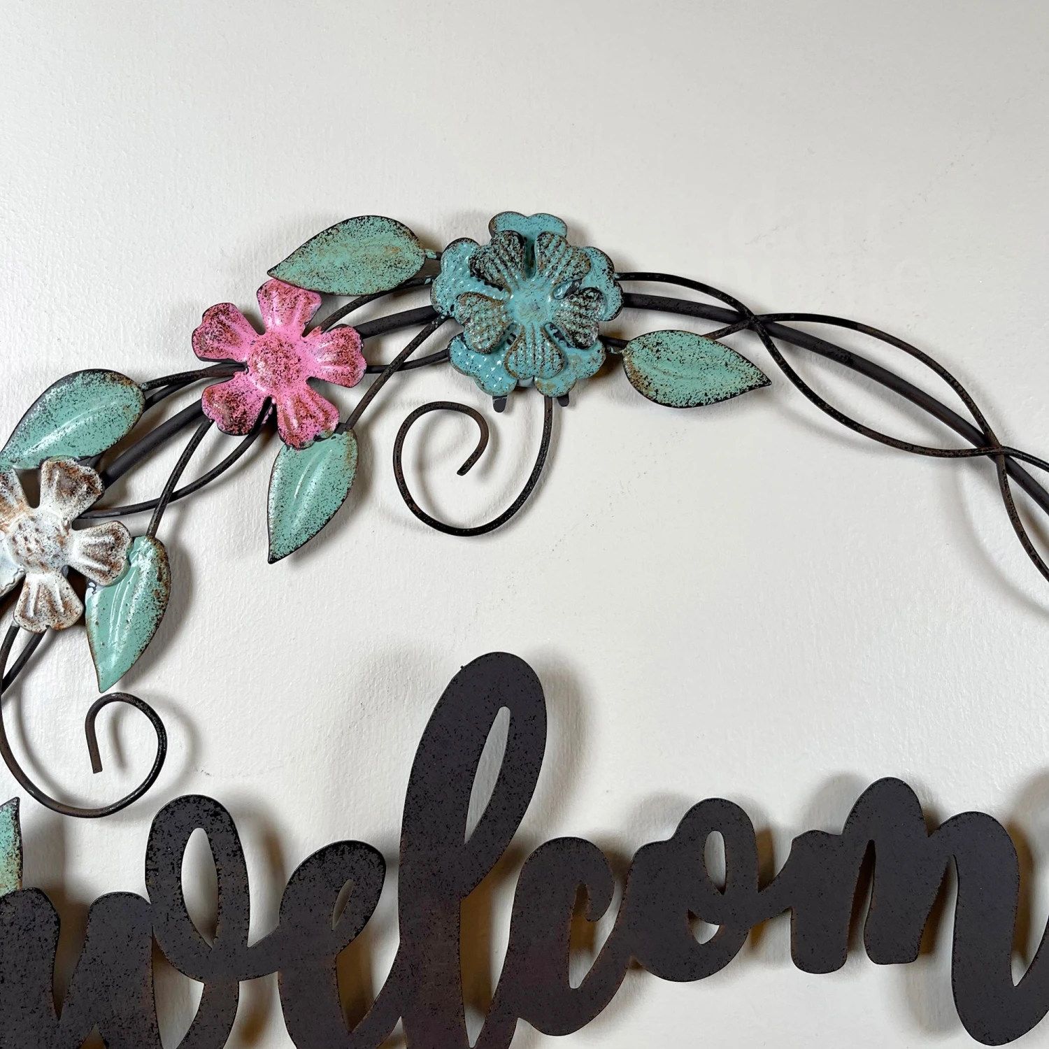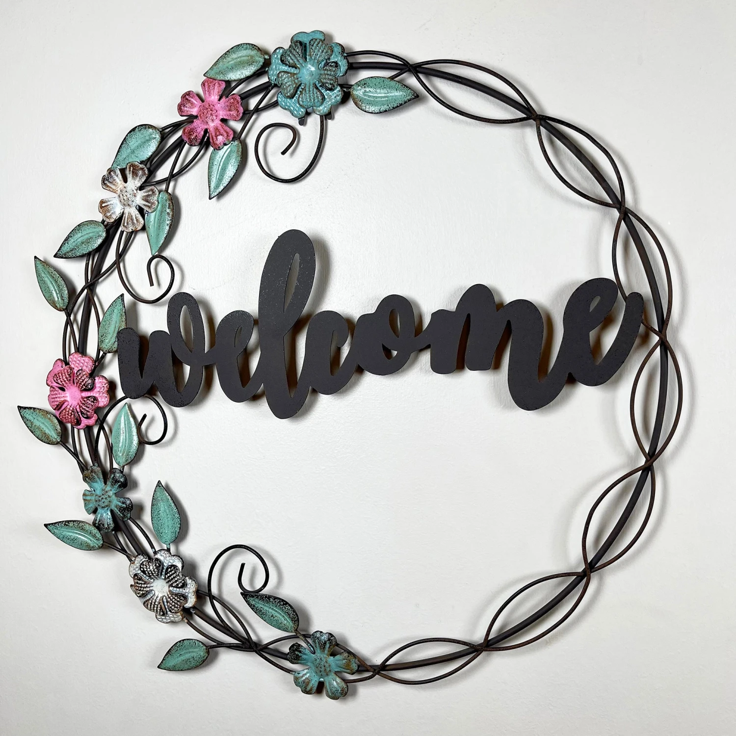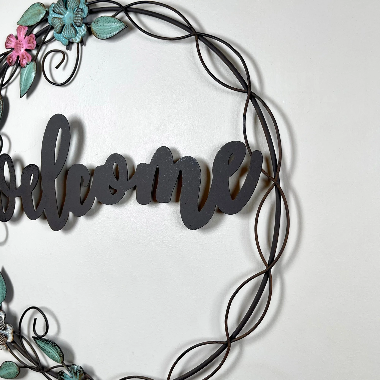A contemporary floral wreath that will welcome your guests at the front door. This is a round wall or door decoration with welcome text in the centre and decorated with strikingly coloured rose flowers around the circumference.