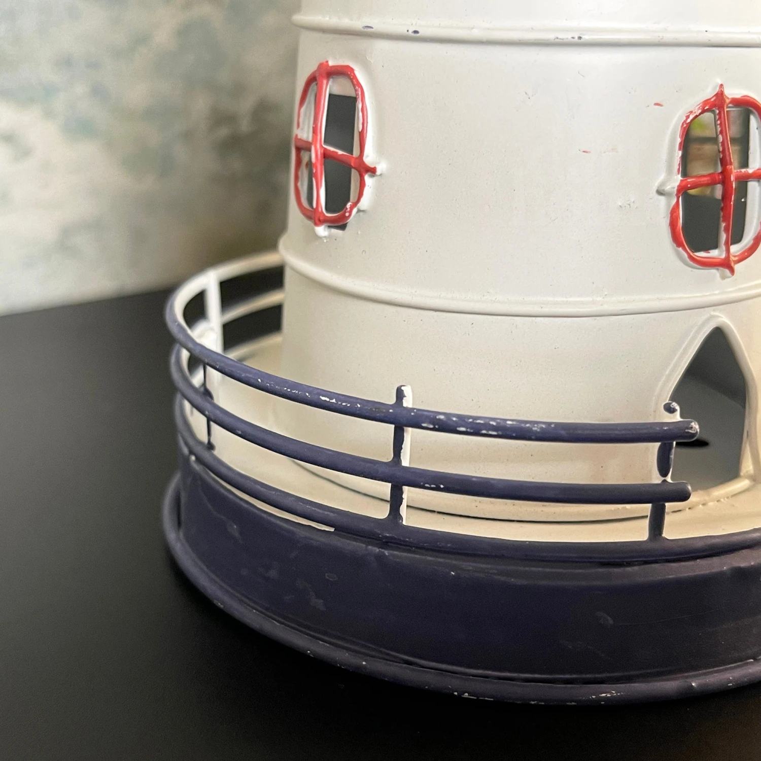 A decorative tea light holder boasting a white and blue traditional lighthouse design with painted features to bring this candle lantern to life. With a lit tea light loaded from the bottom, this lantern offers a soft warm white glow wherever placed and can be stood freely or hung with the white handle.