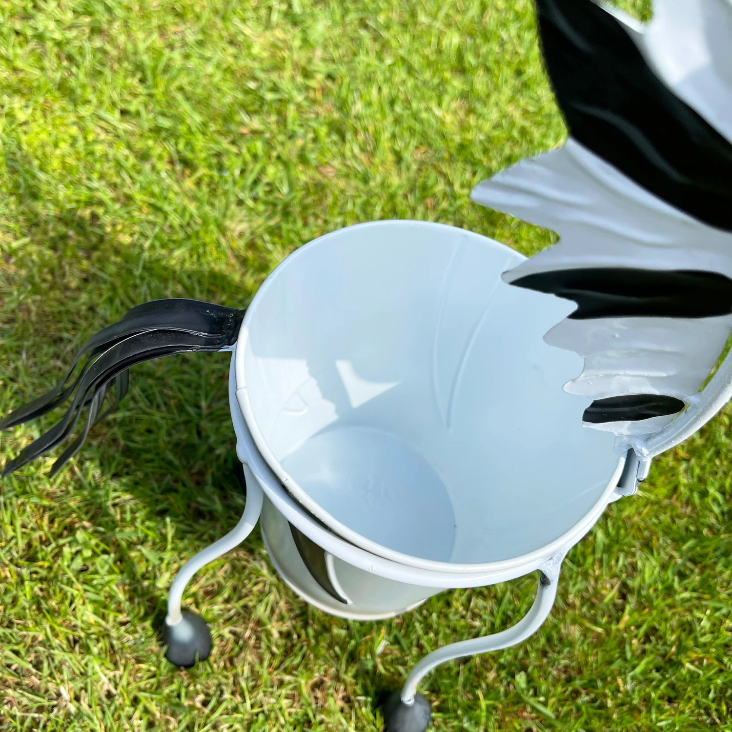 Garden zebra round planter and ornament, crafted from metal and hand painted back and white. Perfect for decorative use with small real flowers and herbs. Animated style with long legs, a long neck and head with blue glass eyes.