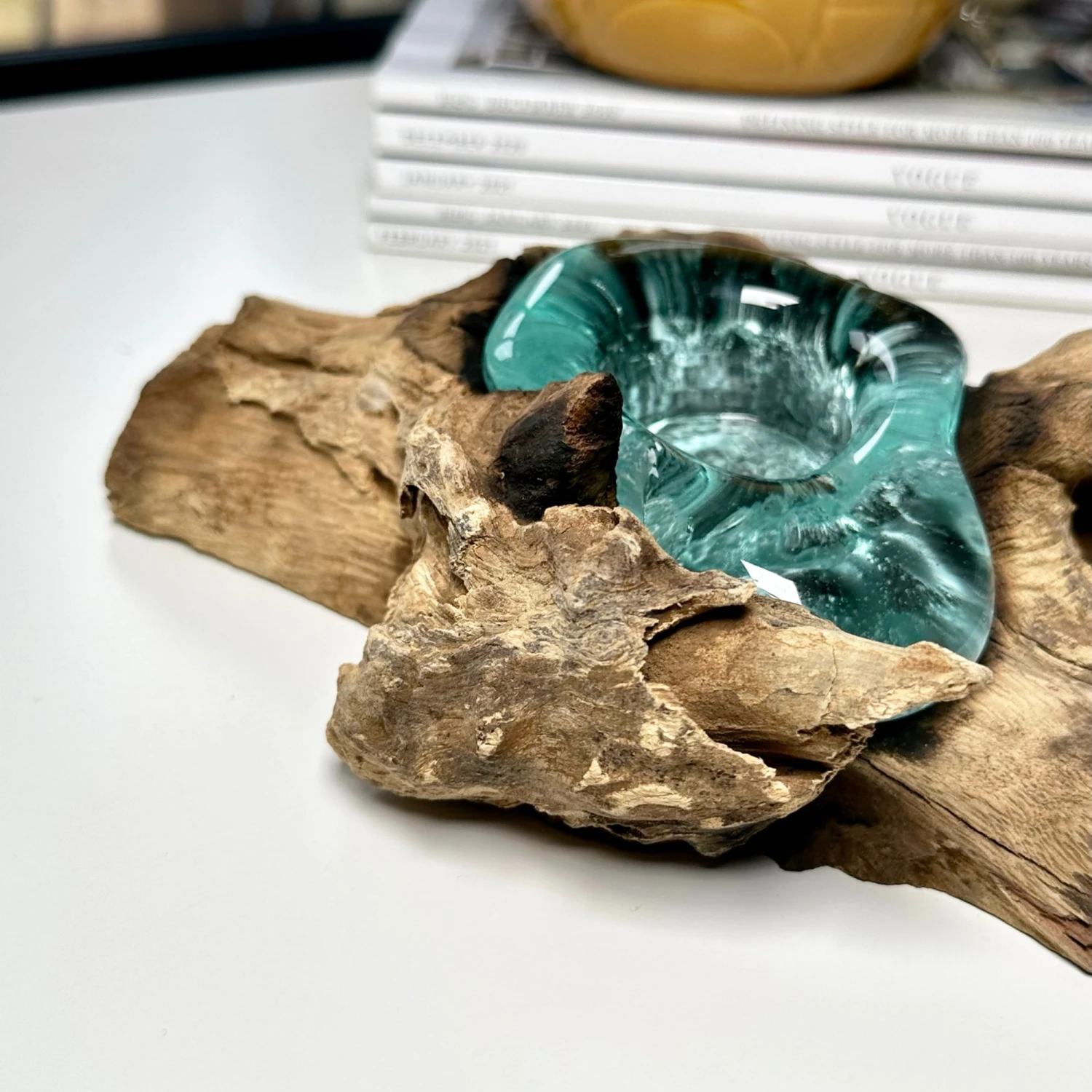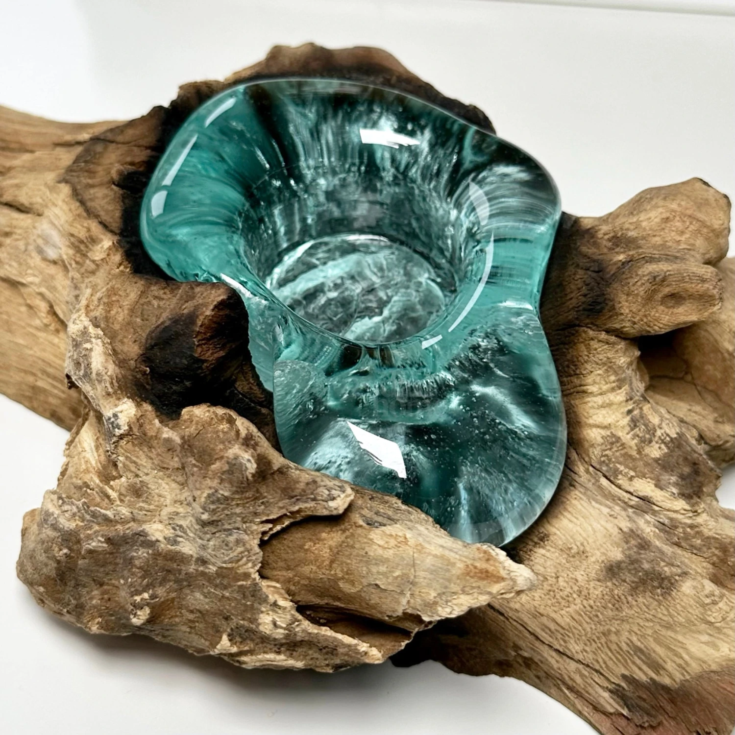 | Material | Teak Root Wood, Molten Glass |