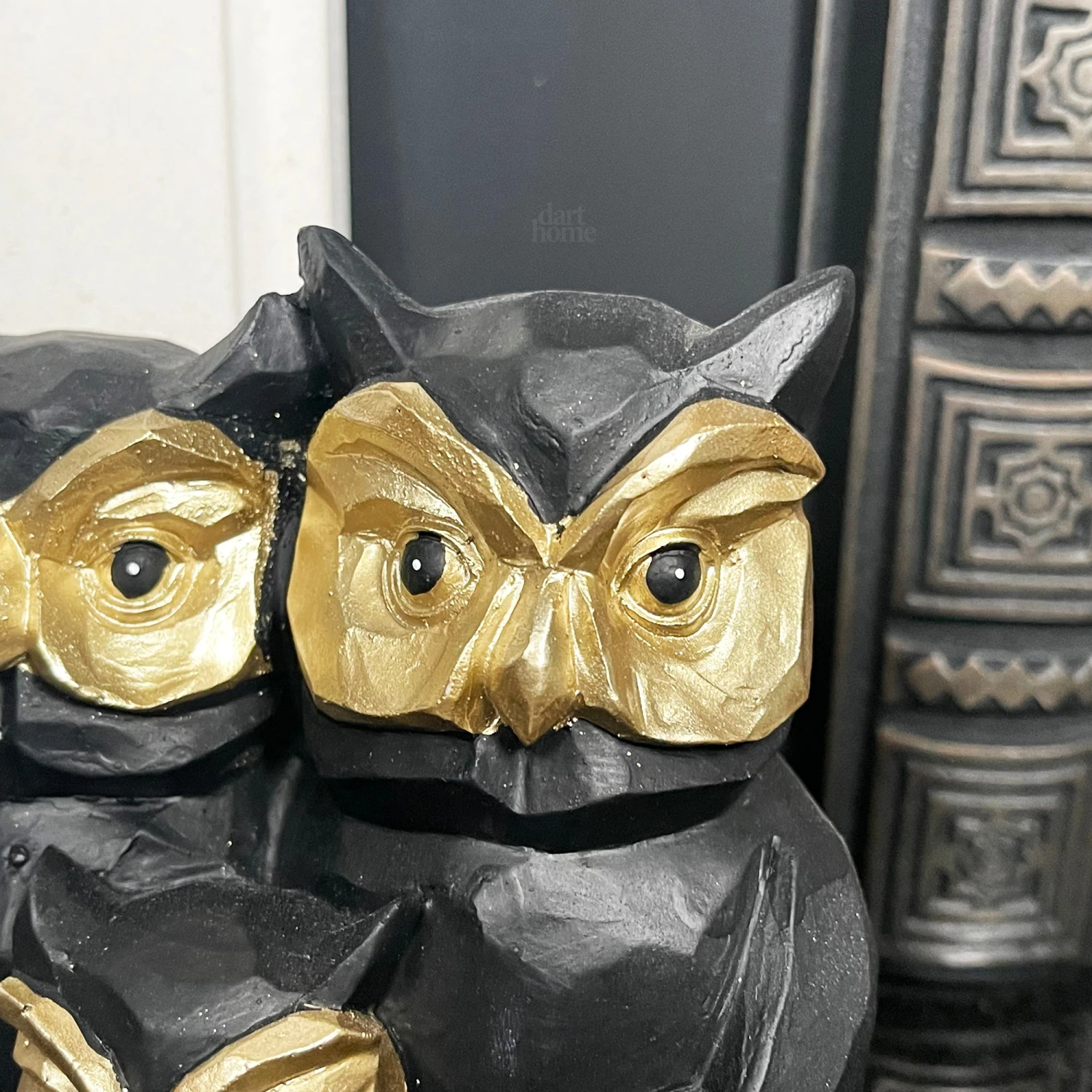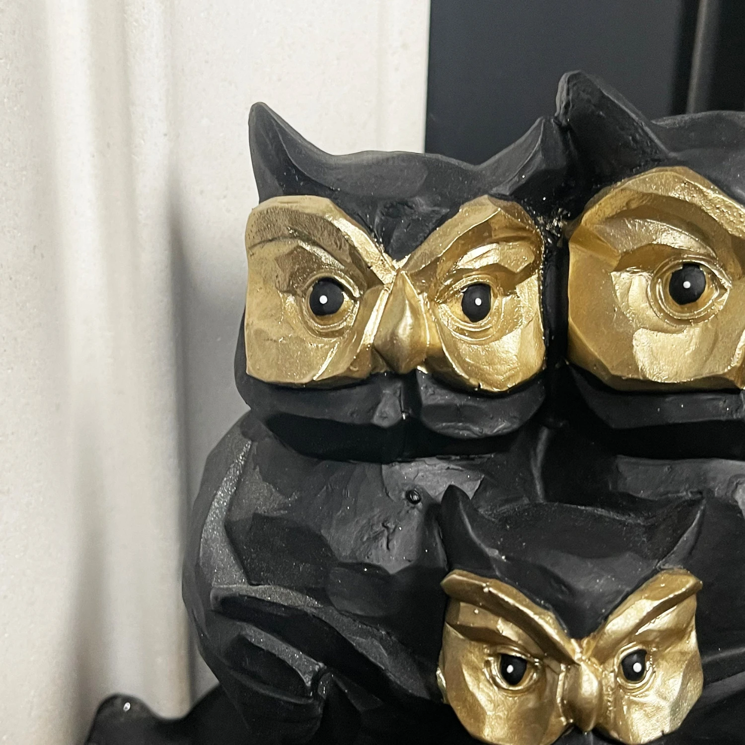 A happy family of barn owls finished in a modern monochrome deep black tone with striking gold eyes that will pop in any room. This owl ornament is suitable for indoor use and is made from polyresin.