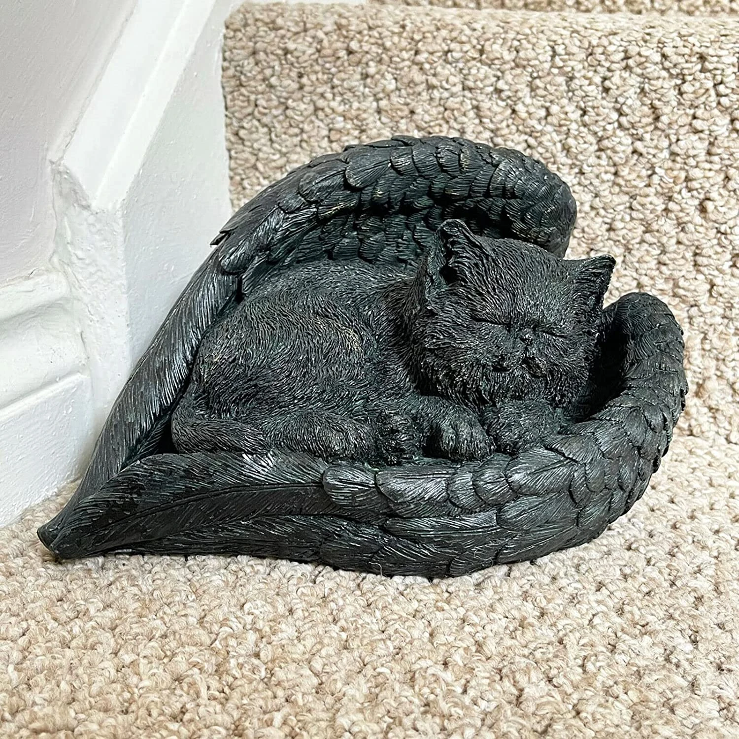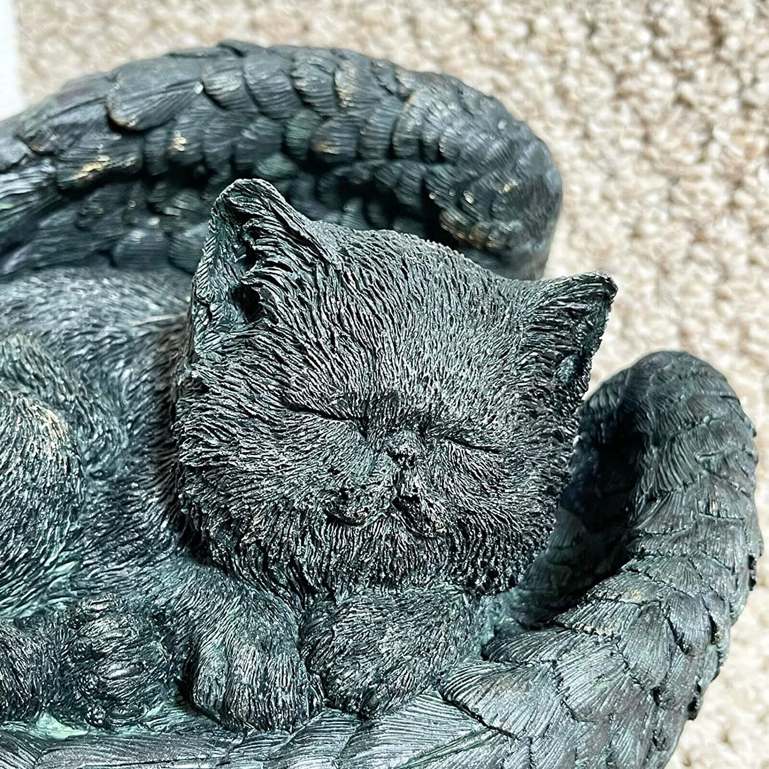 This resin bronze effect sleeping cat memorial is hand made and suitable for indoor & outdoor use. The ornament captures a peaceful cat resting softly in a pair of angel wings. It is a perfect gift idea for a friend.