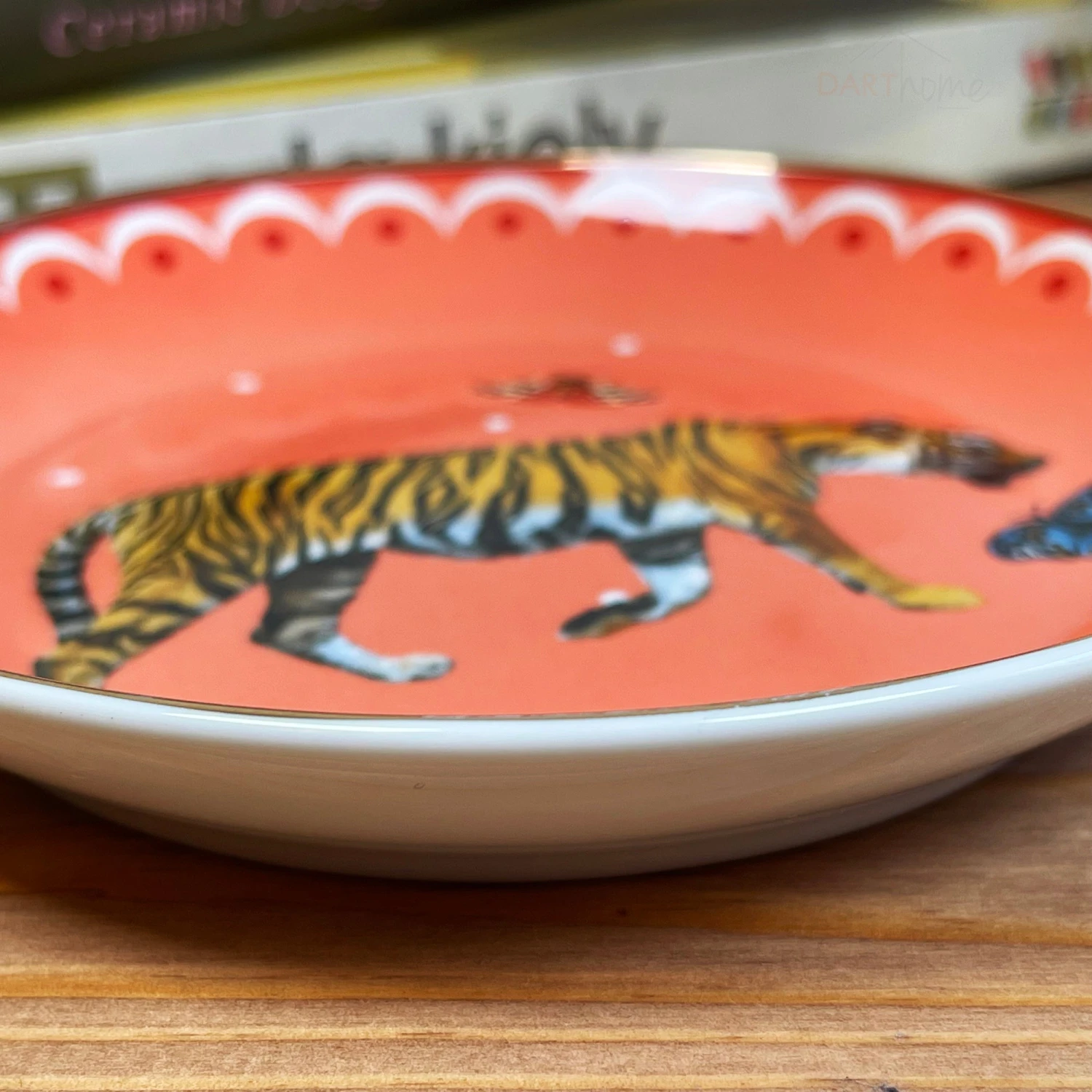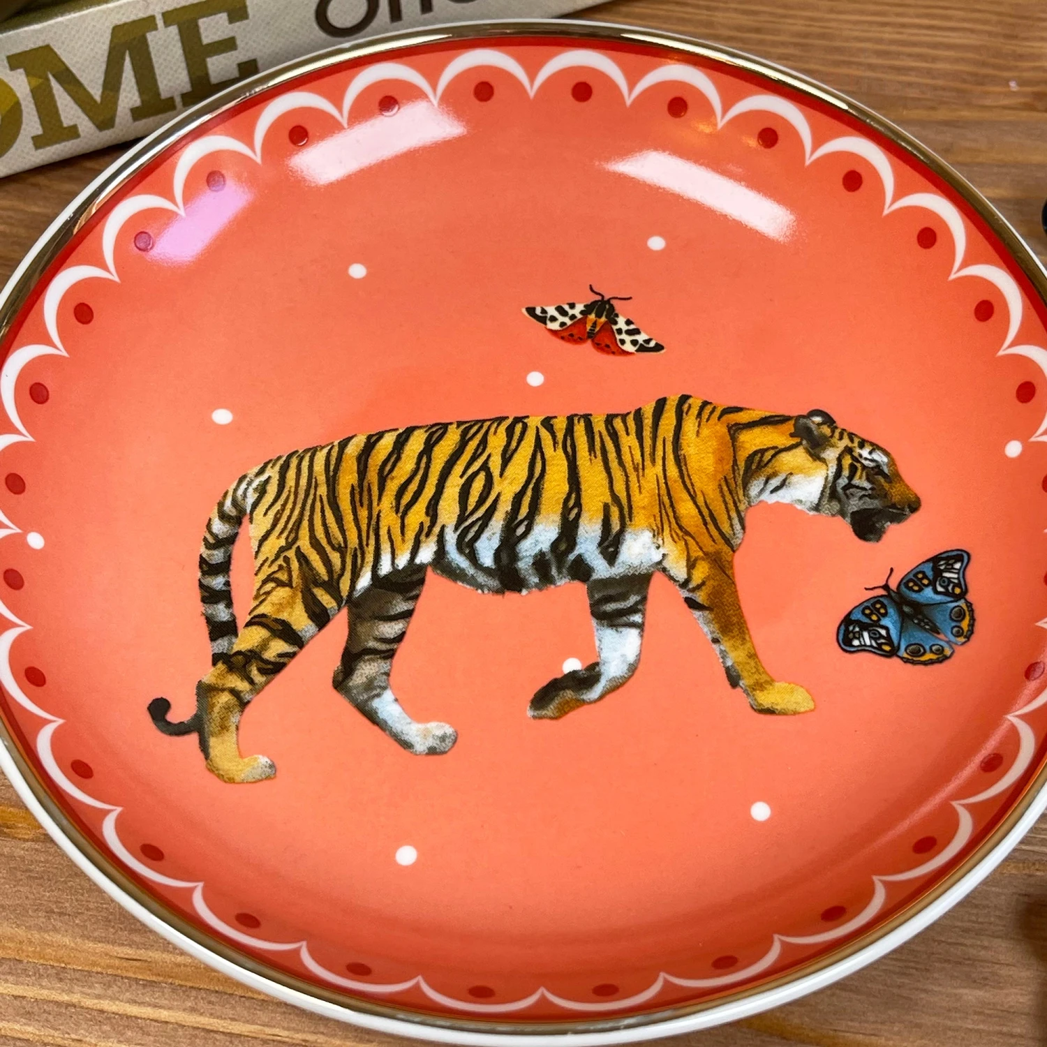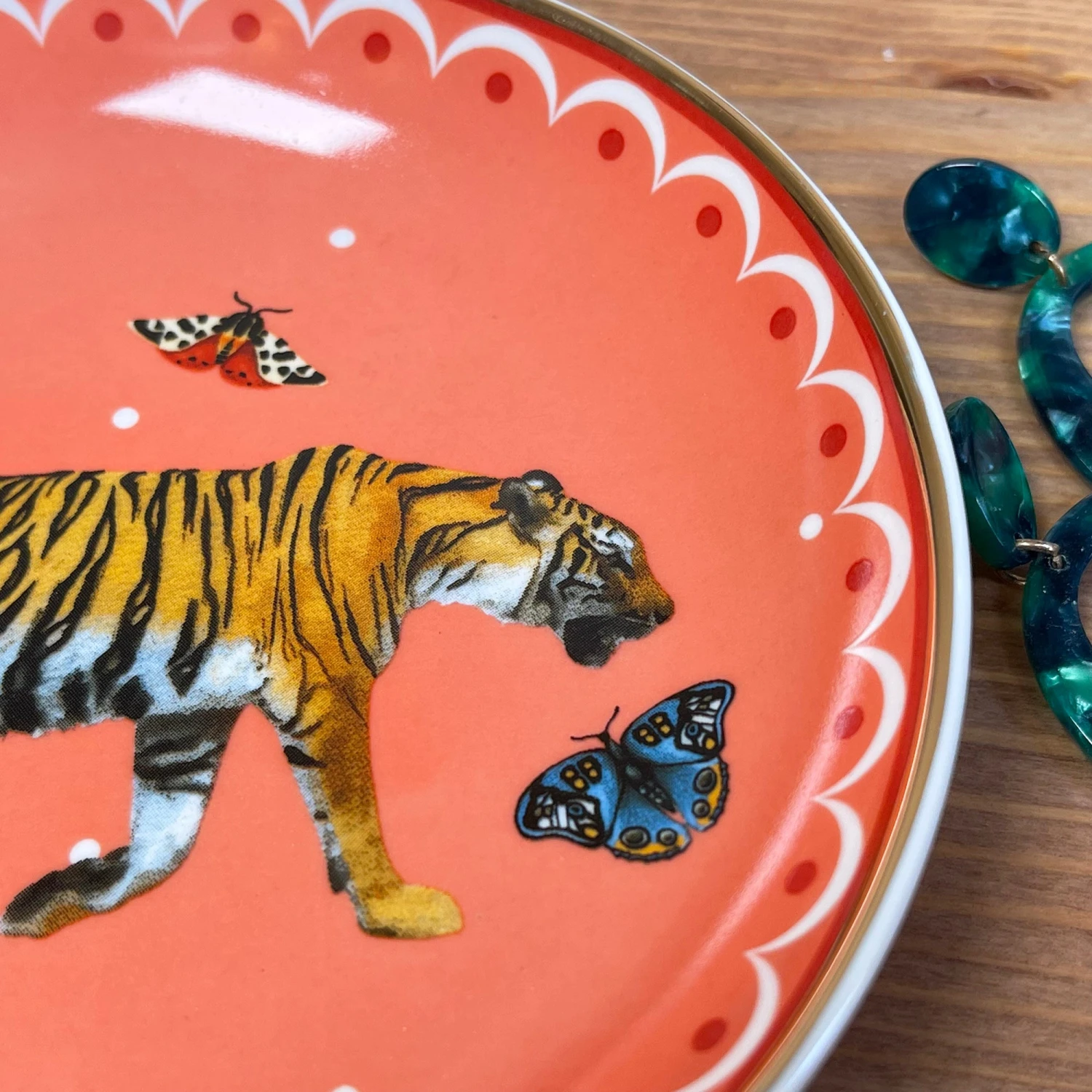 An elegant contemporary peach coloured trinket dish showcasing a lareg striped tiger and butterfly design, perfect for storing your jewellery and other little treasures. Handmade from quality ceramics with a gold-toned border.