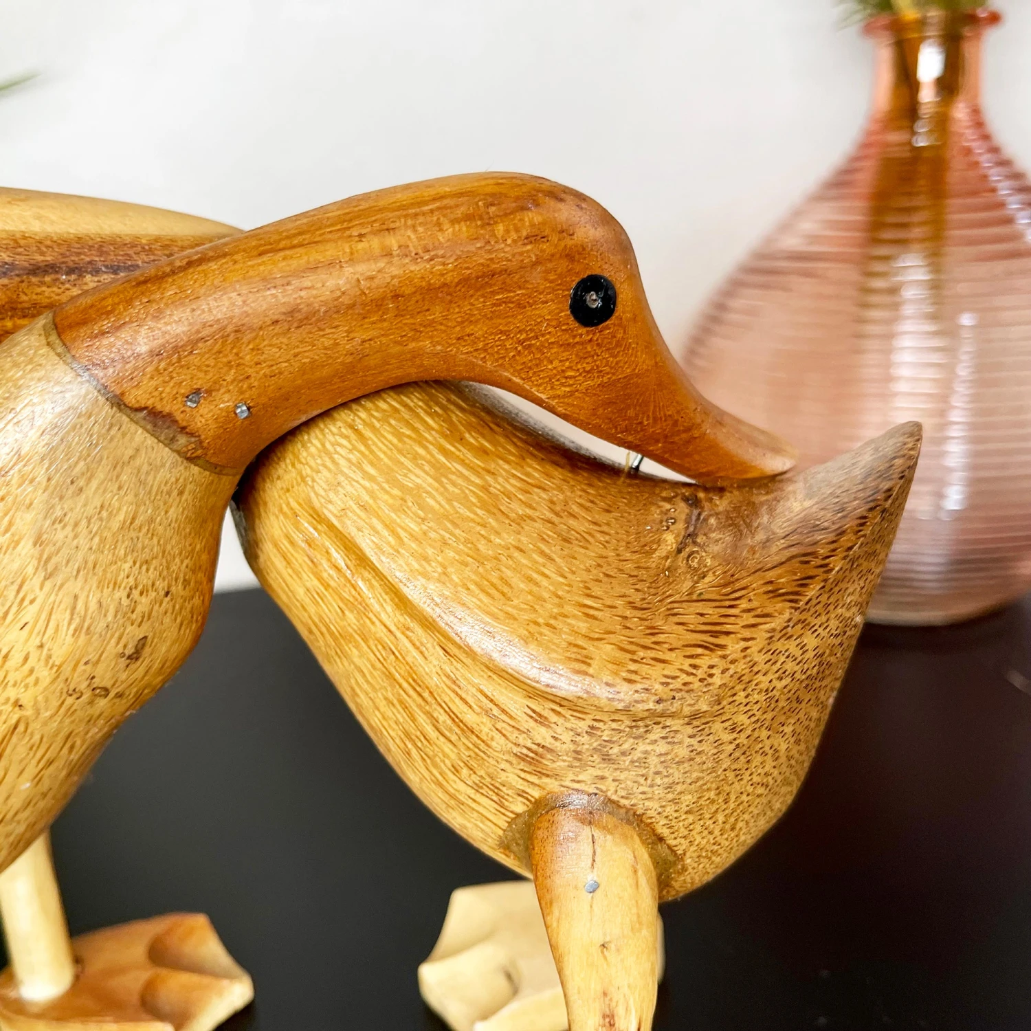 Add a romantic rustic touch to your home with this wooden ornament capturing a hugging mr and mrs pair of ducks, quietly sharing a moment of embrace. These ducks are hand carved using natural wood and varnished to offer a smooth glossy finish. They are a great gift idea for a new couple.