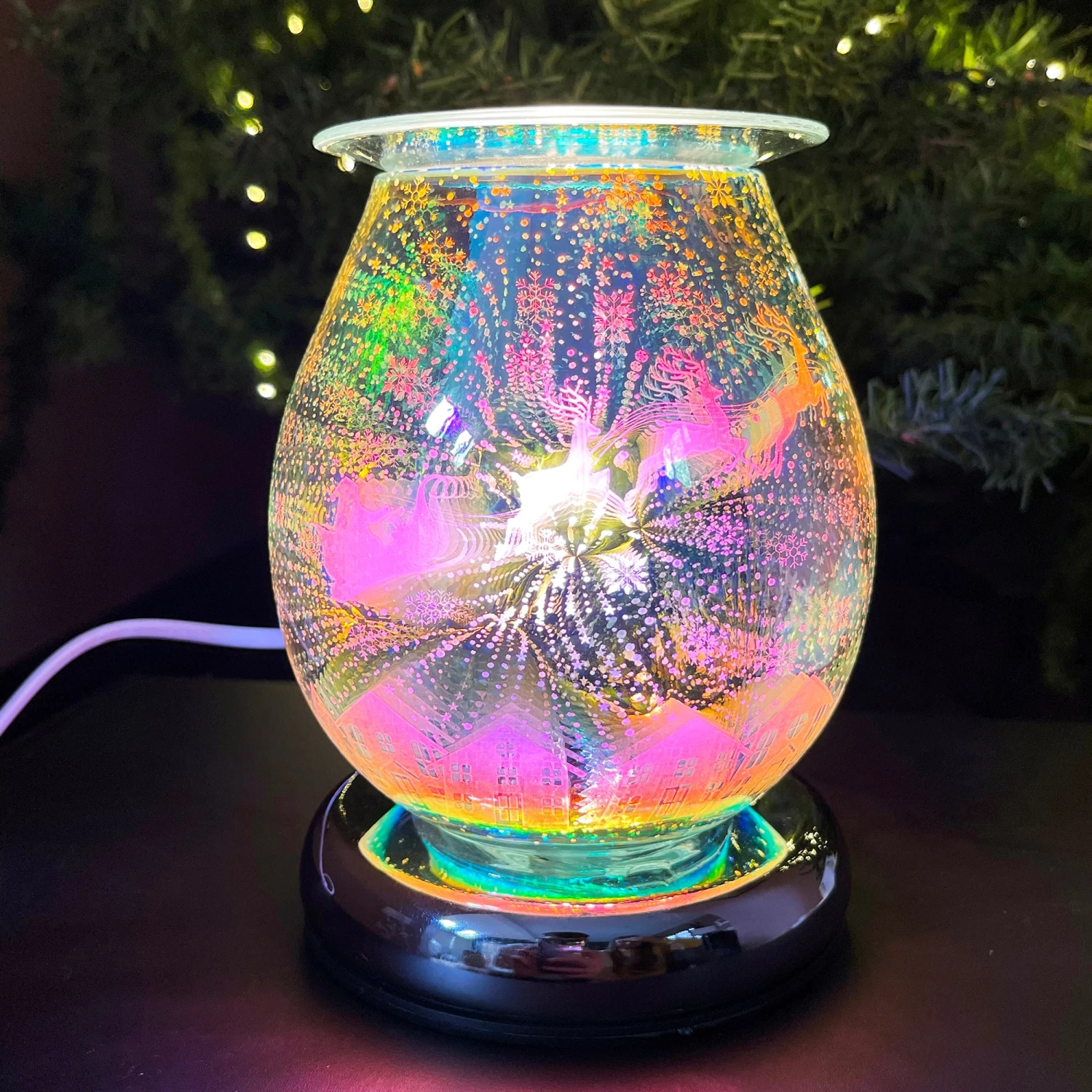 A gorgeous electric wax touch melt burner aroma lamp featuring a 3d santas sleigh design, lighting the room with multi coloured shades around the lamp when plugged into the wall. Touch sensitive control function and glass plate to hold your favourite wax melts and oils to allow for your chosen scents to aromatise any room.