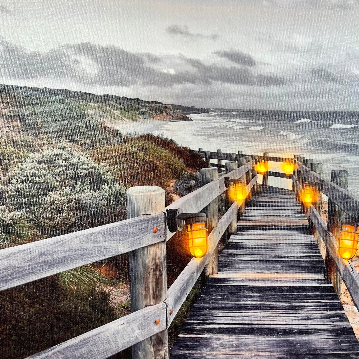 This LED lit rectangular canvas is a stunning piece of wall art with a HD printed seashore boardwalk scene printed onto it. It is a colourful piece with a switch on its side to turn on the specially placed LED bulbs.