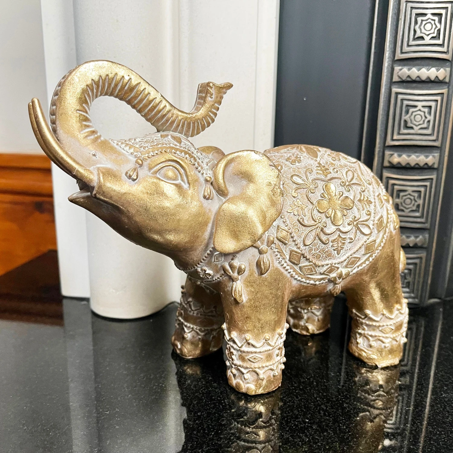 A set of 2 elephants made from resin with a distressed antique gold finish. They are suitable for indoor and outdoor use and are perfect for year round decoration in your home and garden.