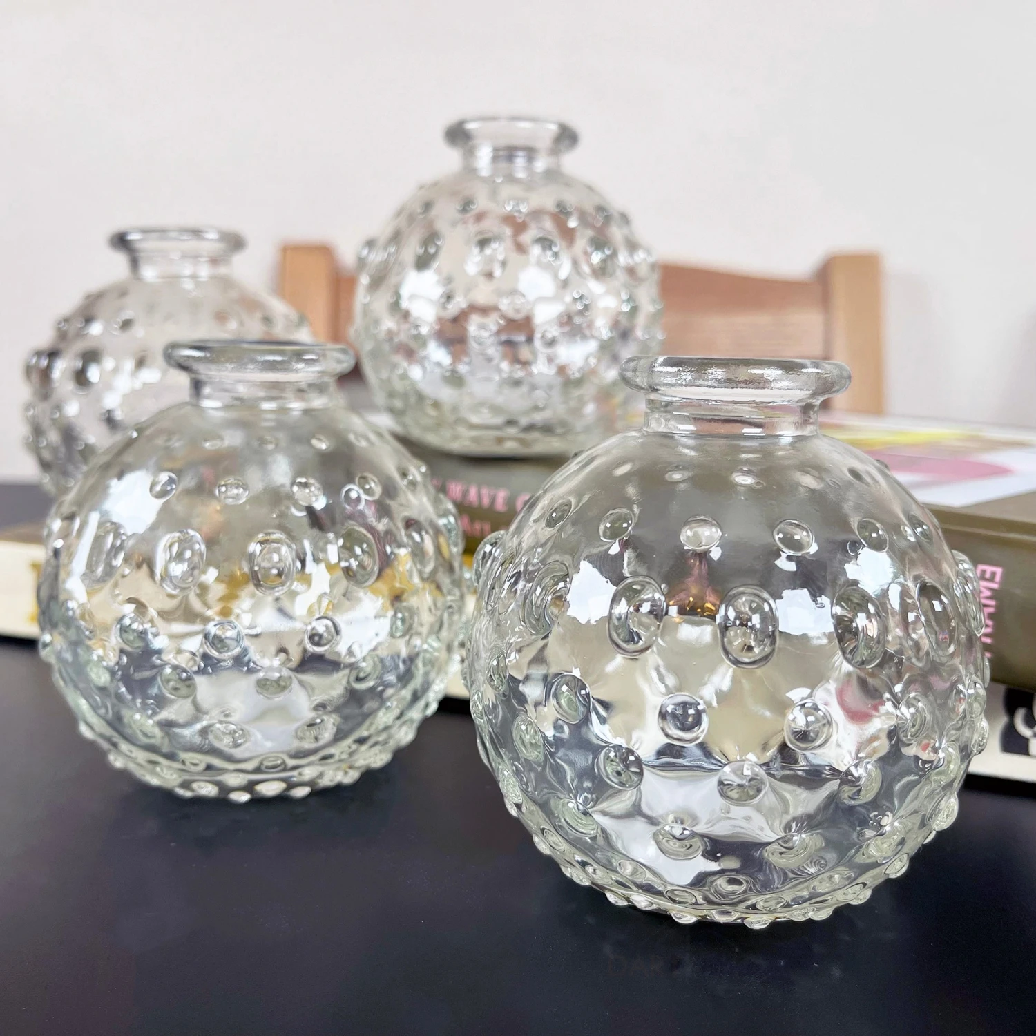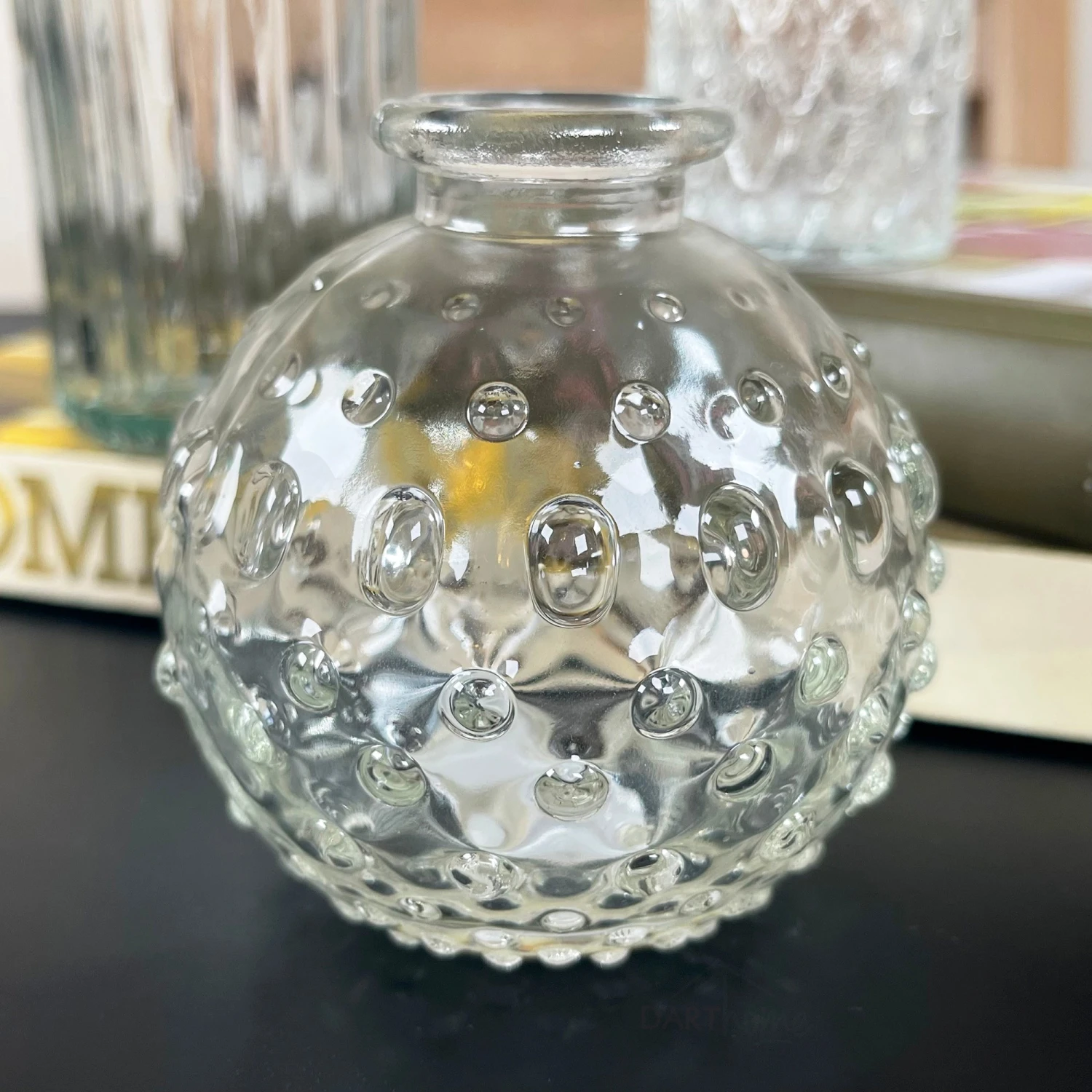 A contemporary set of 3 mini glass bottle vases decorated with a modern embossed bobble pattern. These bobble vases are perfect for holding small artificial or real flower stems and buds. They are perfect for wedding table decor to give a classic modern look.