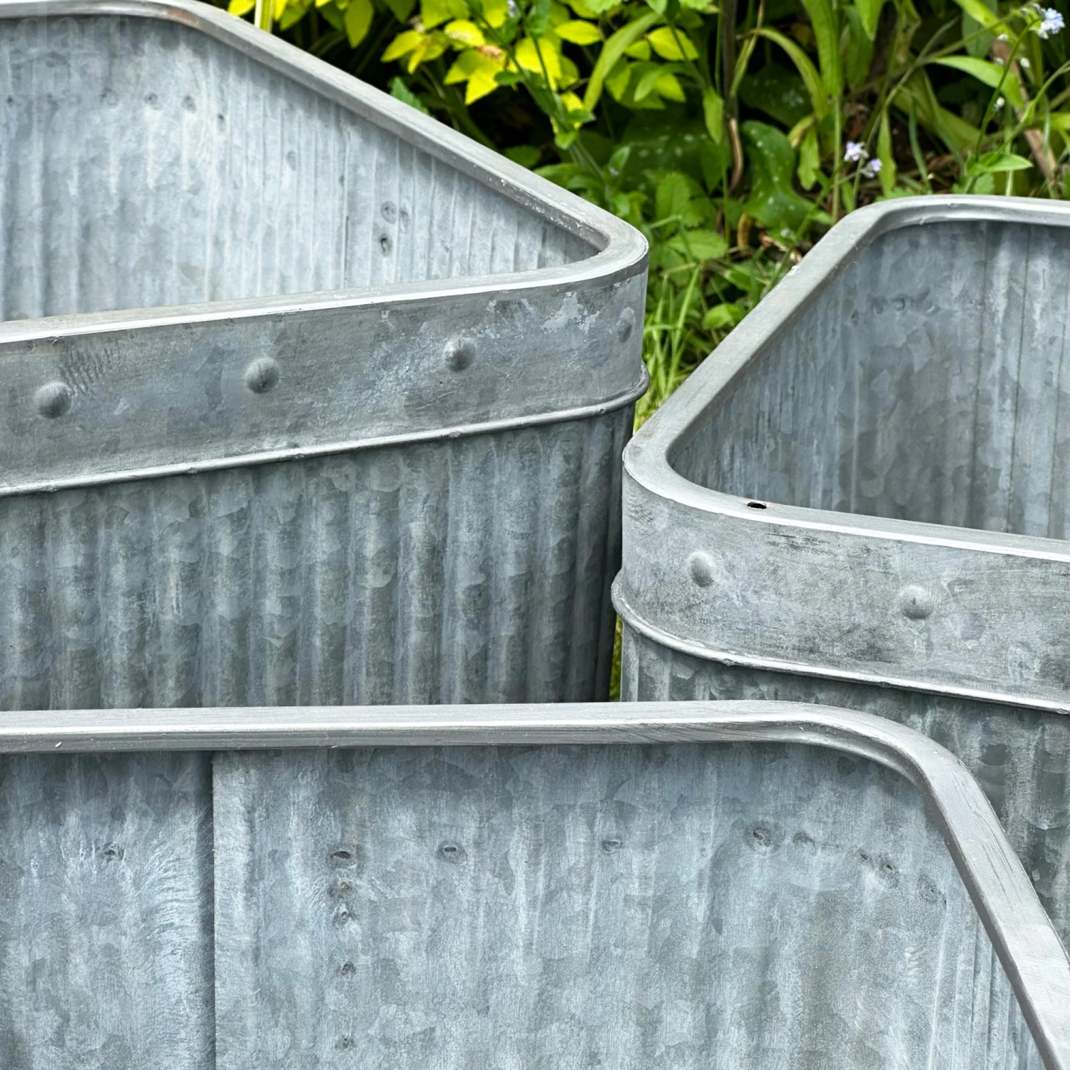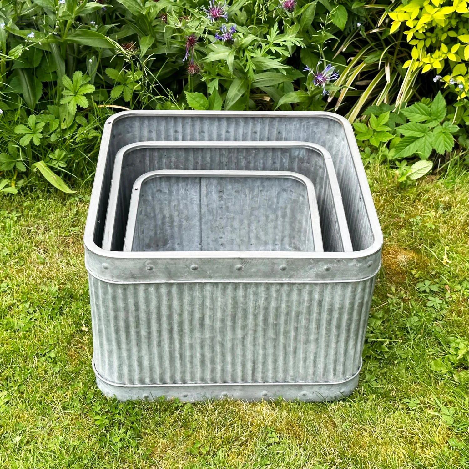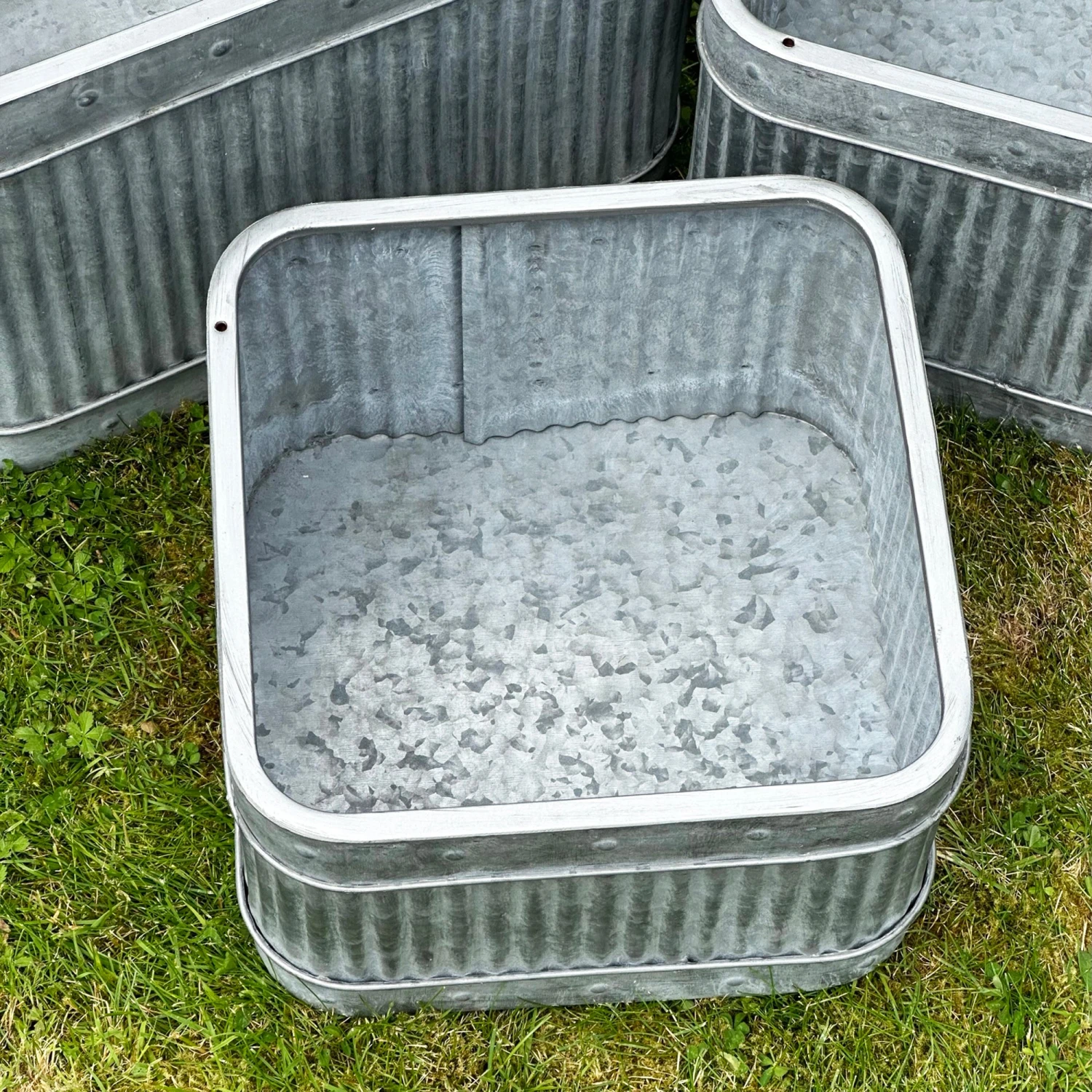 Grow your plants and trees in style with this set of three elegant Square Galvanised Tub Planters! Made of sturdy metal with classic ribbed designs, these pots are perfect for outdoor gardens, patios, or decks. The large size is sure to add a bold touch to your space!