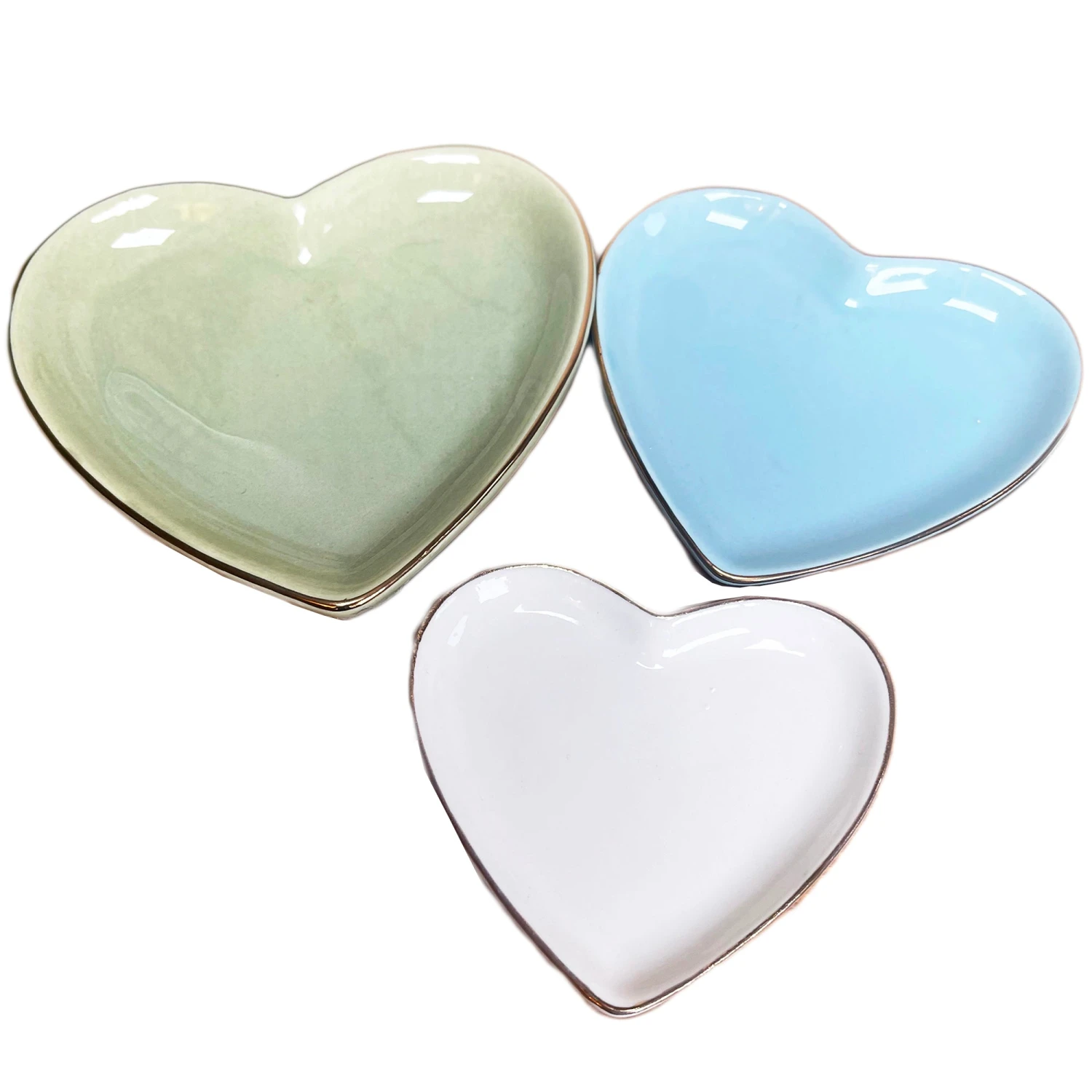 An elegant set of 3 trinket dishes in love heart shapes. This set features 3 sizes and 3 colours; white, blue and green with a shiny gold trim around all of them. The petit jewellery trays are perfect for storing your jewellery and other little treasures.
