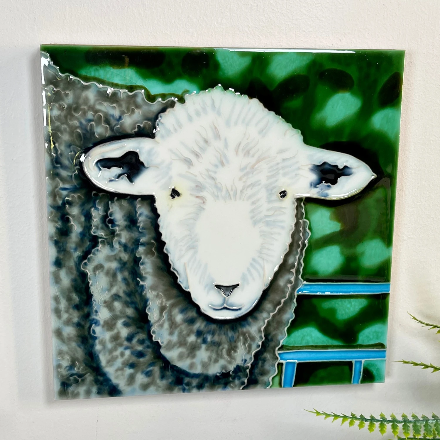 This beautiful square ceramic art tile captures an intrigued farm animal giving a sheepish look in the field. This eye catching decorative plaque is made from ceramics with a glazed finish. The tile has perfect attention to detail which will go above and beyond to enhance a bathroom wall.