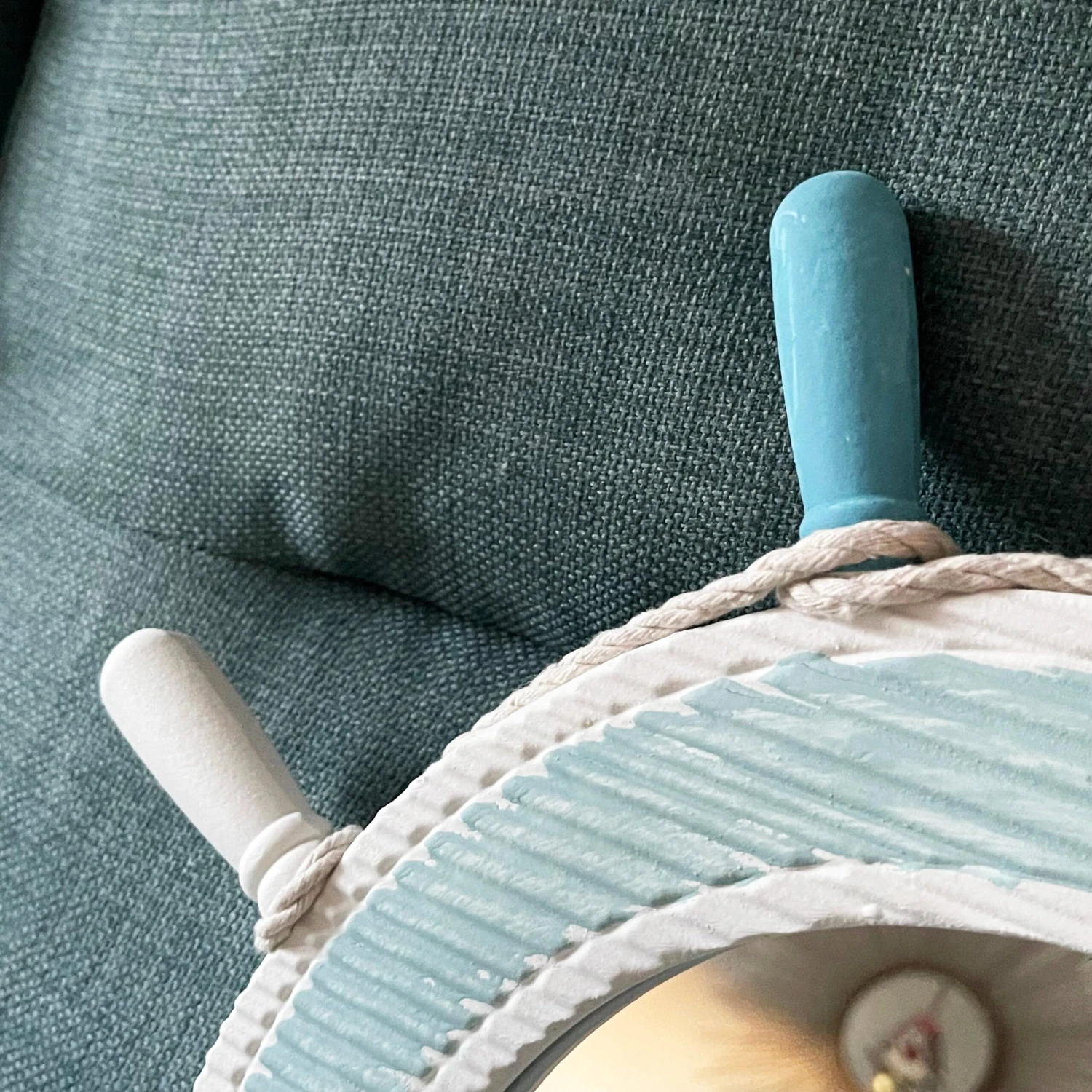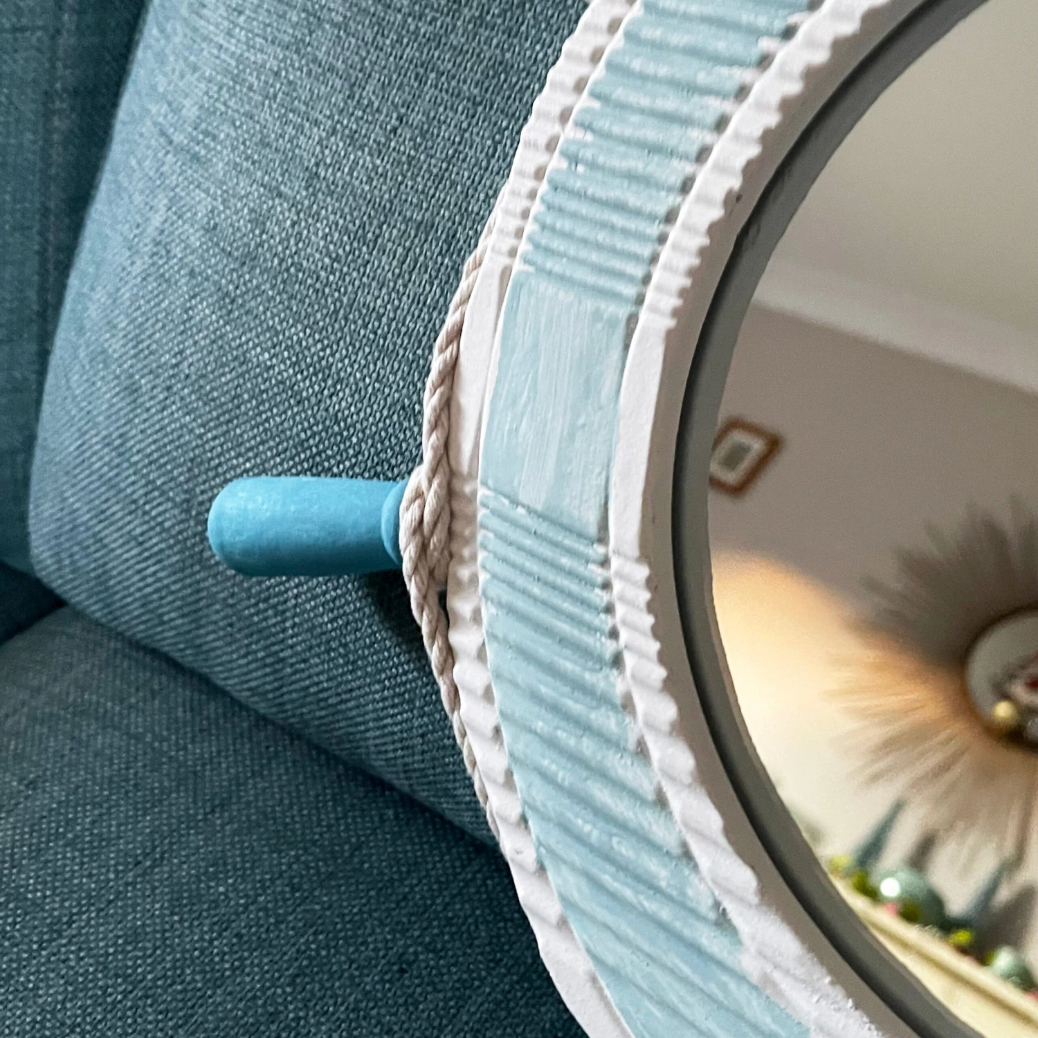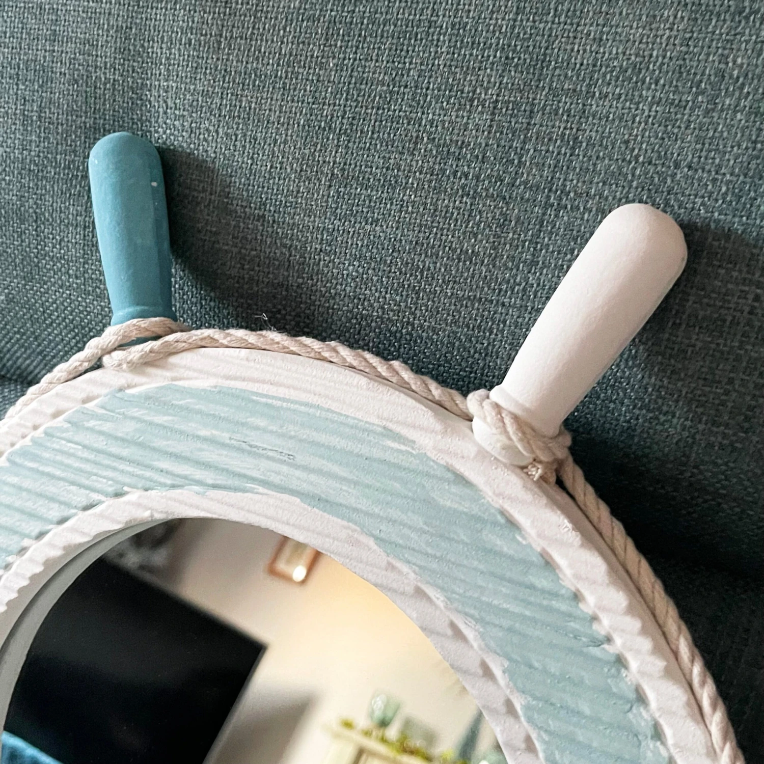 Novelty round 19cm diameter wall mirror in a classic 41cm diameter ships wheel design frame. Distressed coloured wooden frame with nautical and seaside themed decorations around the frame. Great for bathroom decorative use.