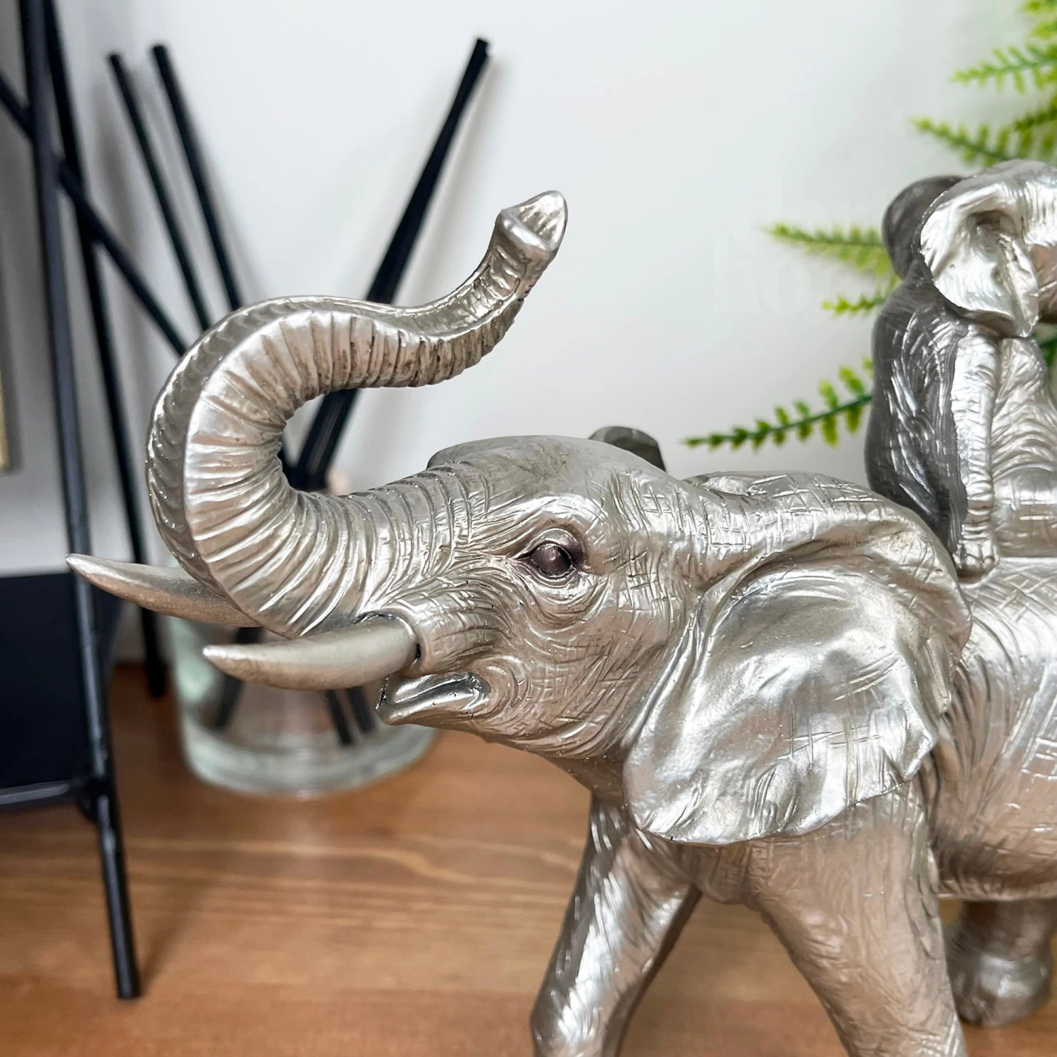 A playful family of elephants capturing a mother with her playing baby calves on her back. This design features intricate and detailed markings across to bring this elephant ornament to life. Place it on a mantlepiece or windowsill to appreciate this elegant animal piece.