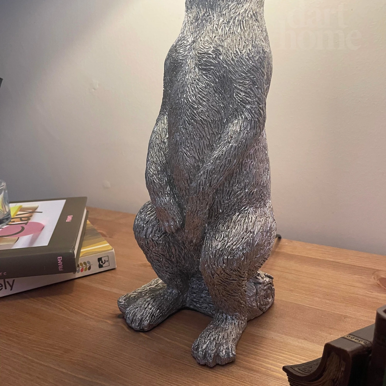 This beautiful large table lamp featuring a large silver meerkat design in a textured silver finish will instantly enhance your homes decor wherever it is placed. Made from resin, the intricate detailing of the animal adds a unique realistic touch to your living room or bedside table. This light, that requires an E27 bulb will add a warm white glow in any room and be a centrepiece. Lamp comes with a blue velvet round drum lamp shade. No bulb included.